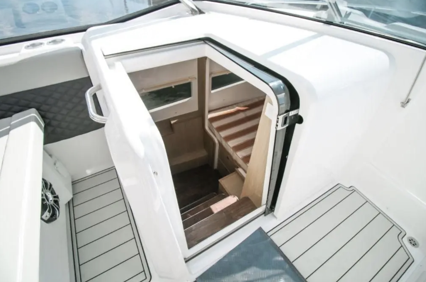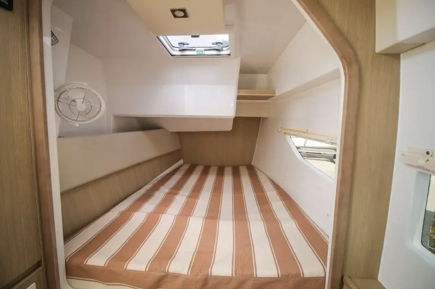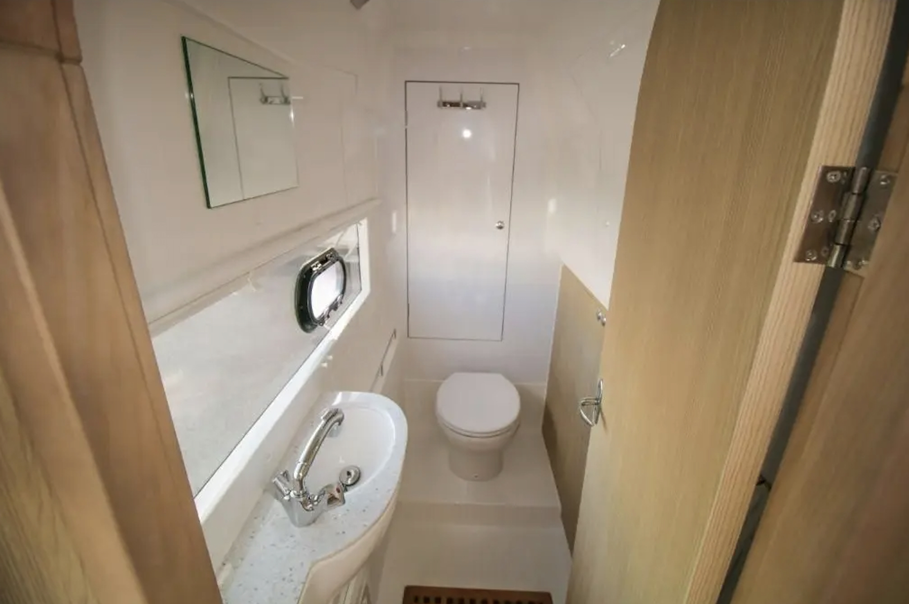 The thoughtfully configured deck transforms to match your mood—from the forward cockpit seating that accommodates eight and converts to sunbeds, to the versatile aft seating that faces wherever the action is. Below deck, two private cabins with en-suite bathrooms turn day trips into overnight escapes.