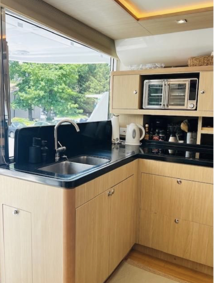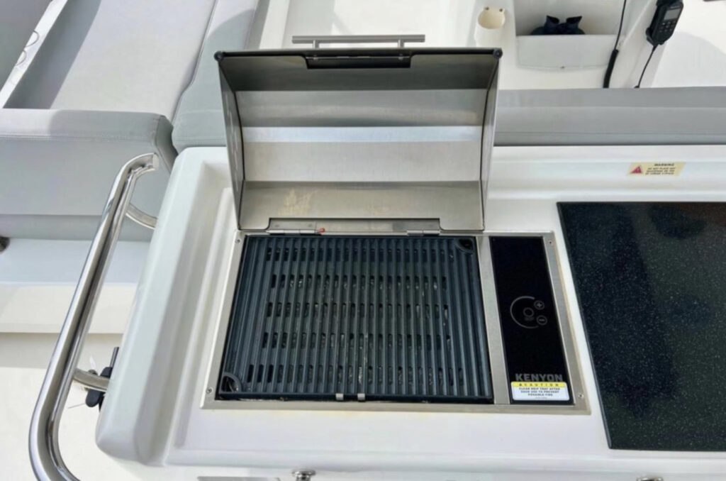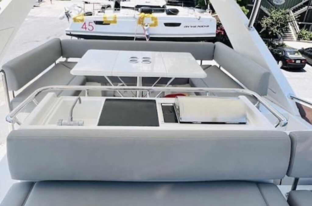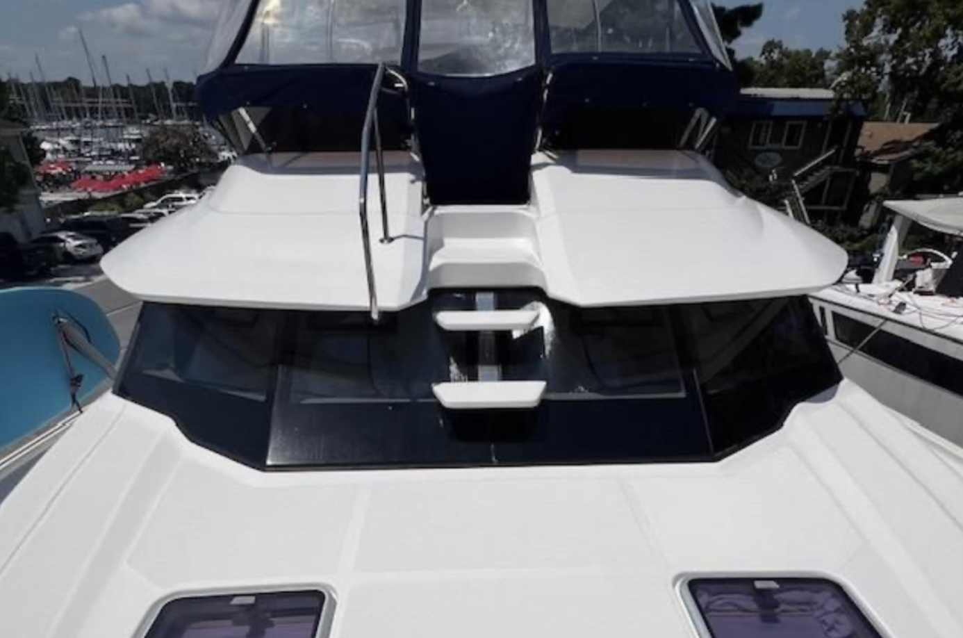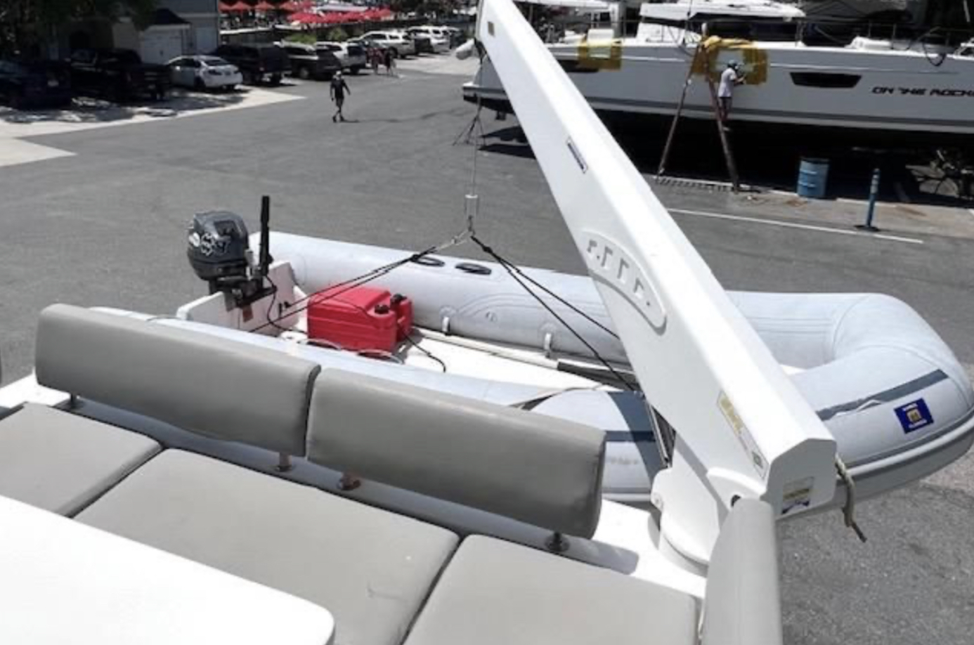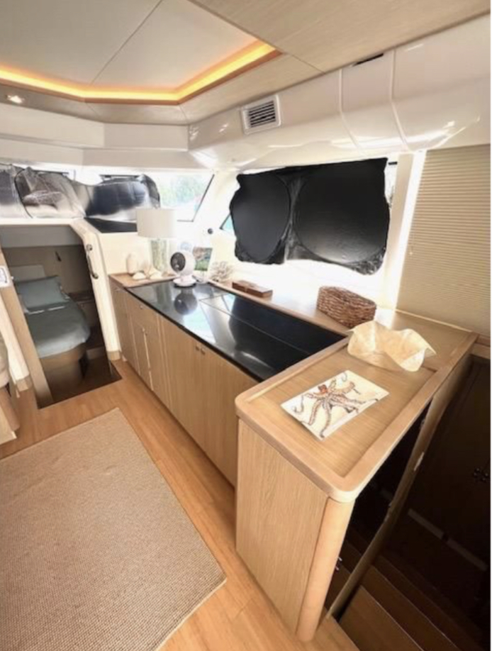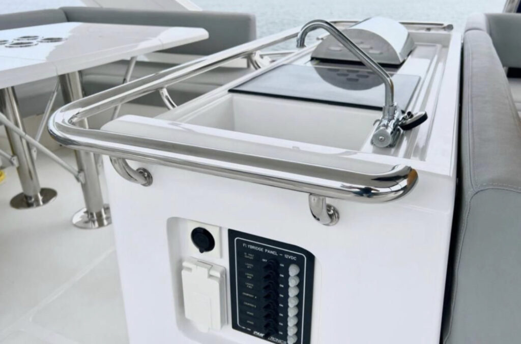 Some other highlights include a backup camera, hardtop solar panels, underwater LED lighting flybridge electric grill and sink, 5000 watt inverter, dinghy with electric davit, electric throttles and shifts, automatic fire extinguisher system, reverse cycle air and heat, and an electric windlass with 55 lb Delta anchor.