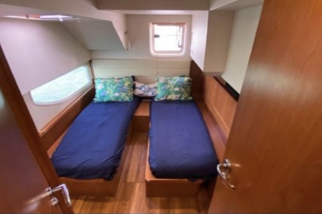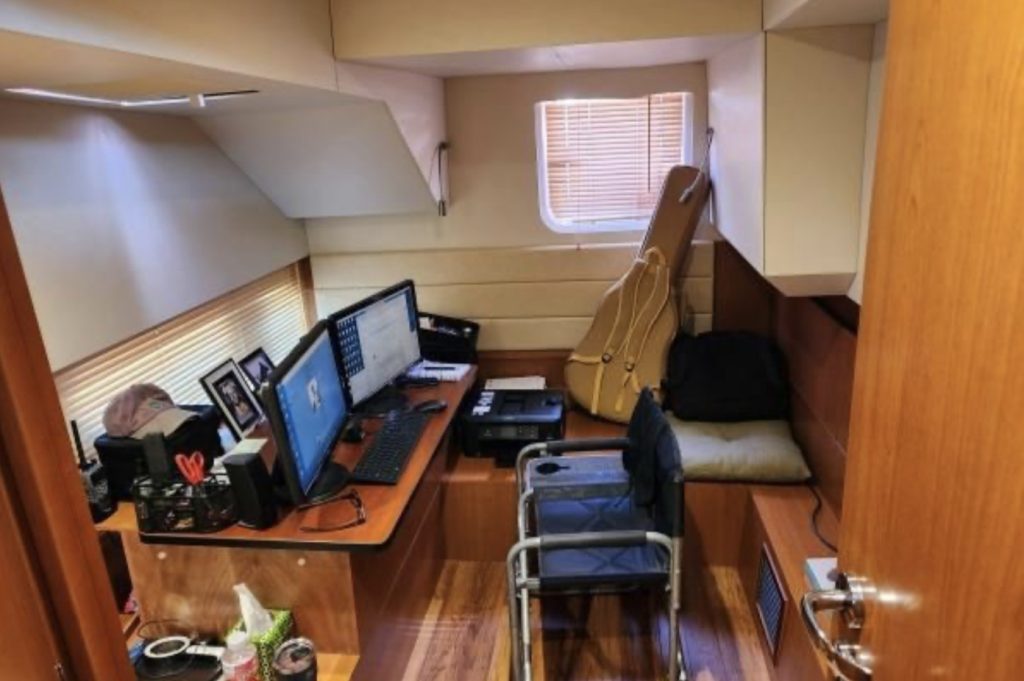 3 cabin layout with one cabin (starboard aft) has been professionally converted to an office and 4 heads with separate showers and galley up in the salon area. In the image gallery view it with the two beds and one as the office. It can be left as an office or in about 15 minutes it can be converted back to a stateroom.