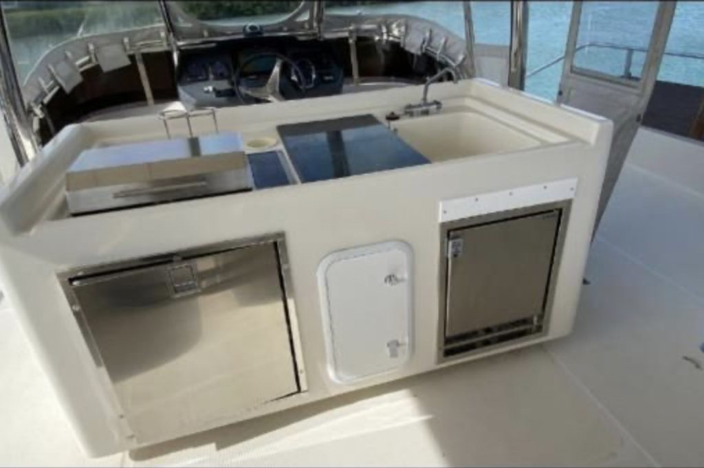 The flybridge provides excellent visibility and additional living space, complete with a grill, refrigeration, and social seating—perfect for entertaining or enjoying the view underway.