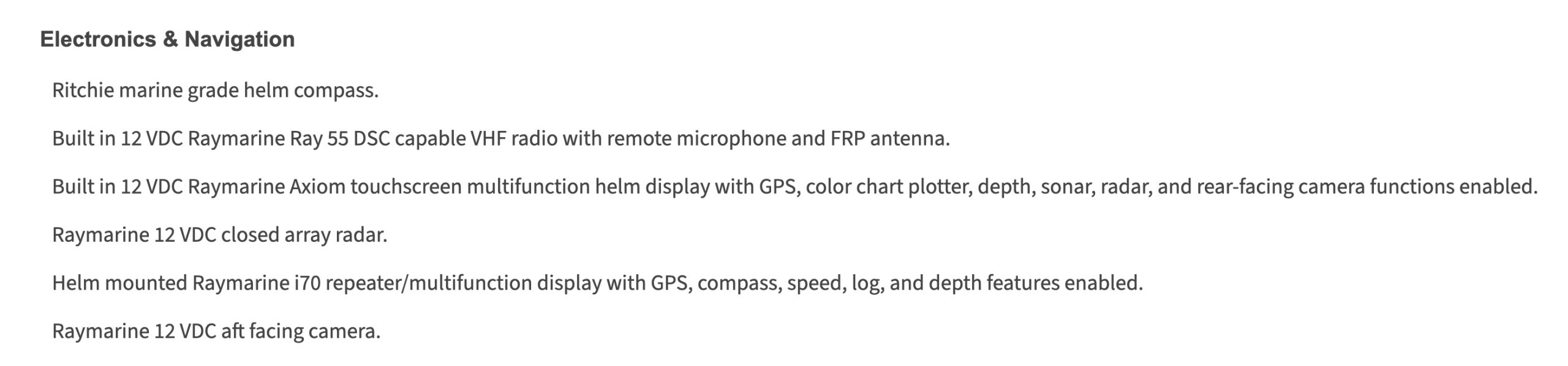 Modern upgrades include Raymarine Axiom Pro navigation, new AGM batteries, enhanced Wi-Fi/LTE connectivity, and other key improvements that elevate onboard comfort and safety.