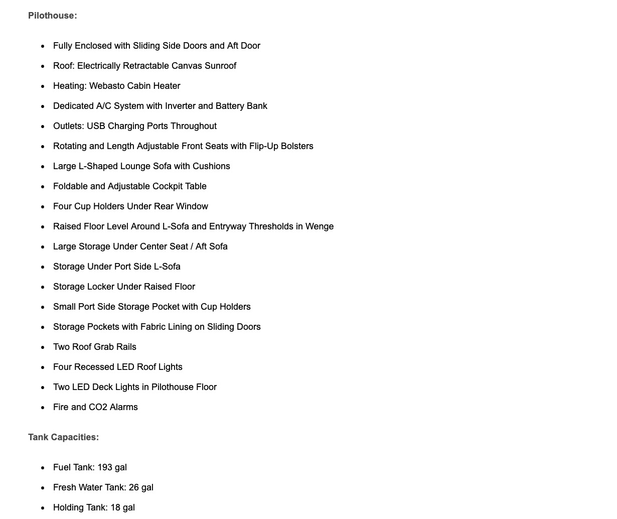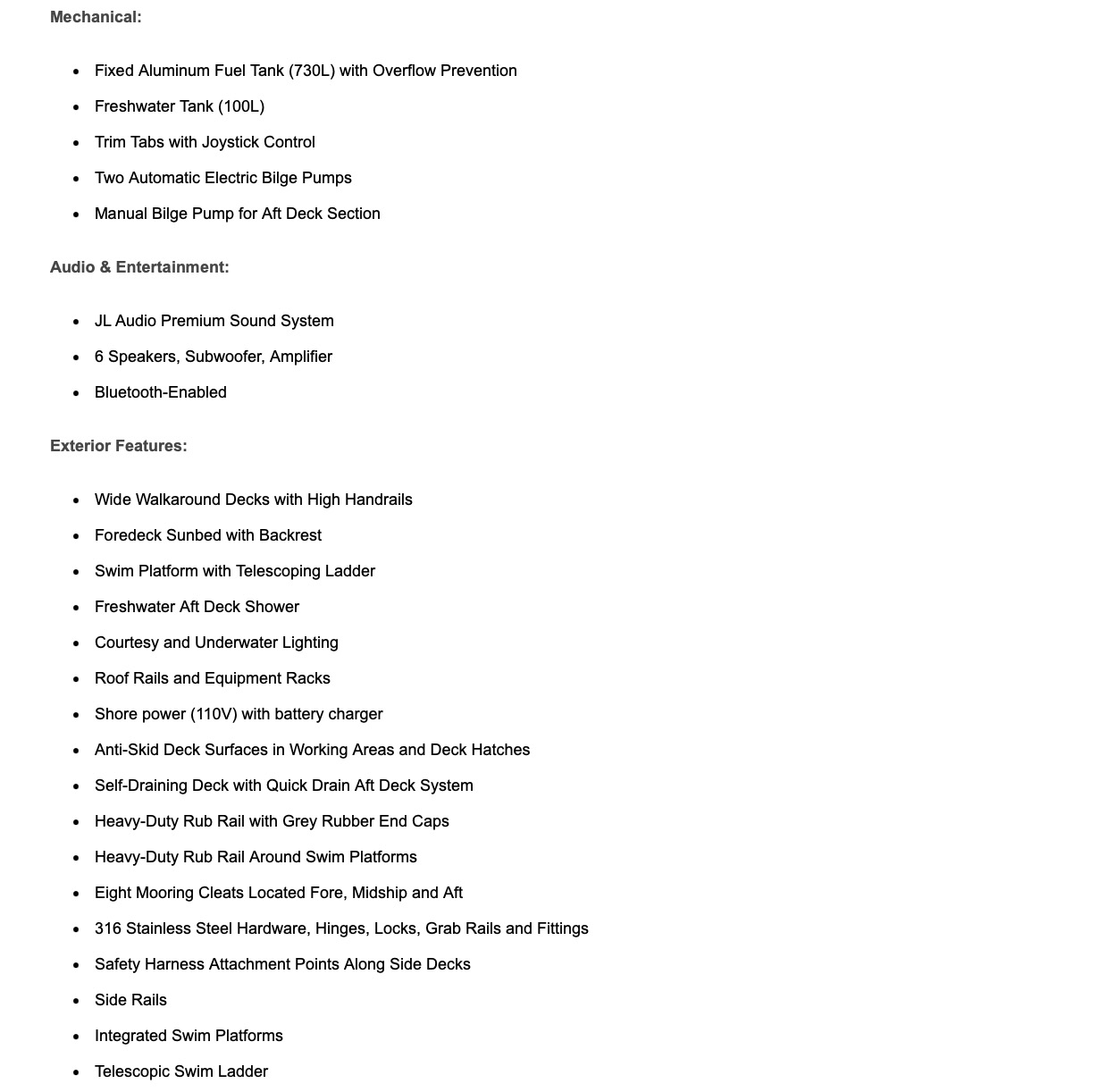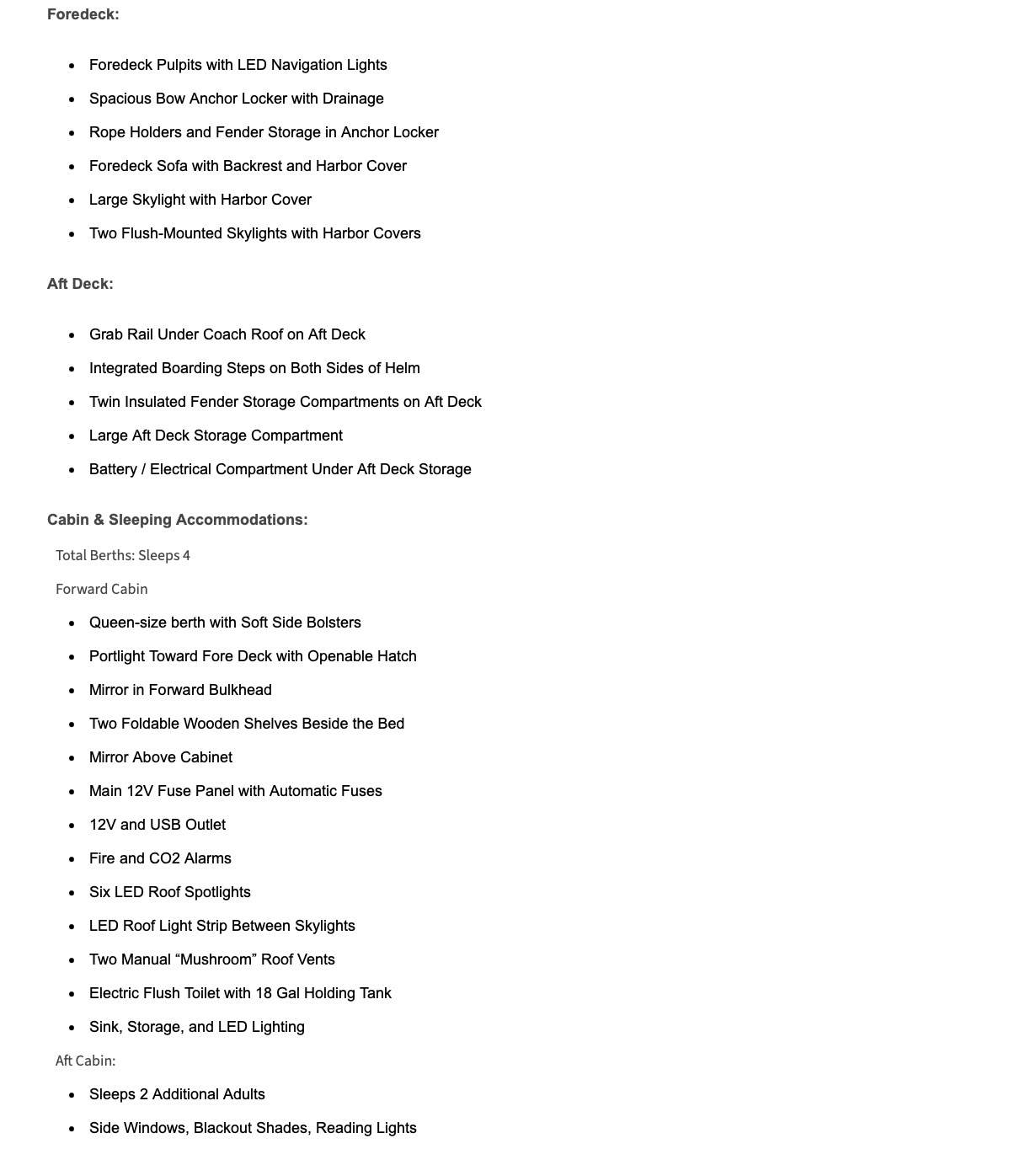 Le bateau qui est présenté sur cette page, l’est uniquement à titre d'information et n'est pas nécessairement toujours disponible à la vente et/ou à la location. Ce bateau est peut-être offert sous réserve, il faut vérifier sa disponibilité. Ce document ou cette annonce n'est pas contractuel. Les informations sur les bateaux affichées dans les résultats ci-dessus sont présentées en toute bonne foi et, bien qu'elles soient considérées comme correctes, elles ne sont pas garanties. Ita Yachts Canada et/ou ProprioBateau ne garantit pas et n'assume aucune responsabilité légale ou responsabilité pour l'exactitude, l'exhaustivité ou l'utilité des informations et/ou des images affichées, car elles peuvent ne pas être à jour ou encore êtres des images d'un bateau comparable. Toutes les informations sur les bateaux peuvent être modifiées sans préavis et sont sans garantie. Ce bateau est peut-être offert par un autre courtier ouvert au co-courtage (co-brokerage).