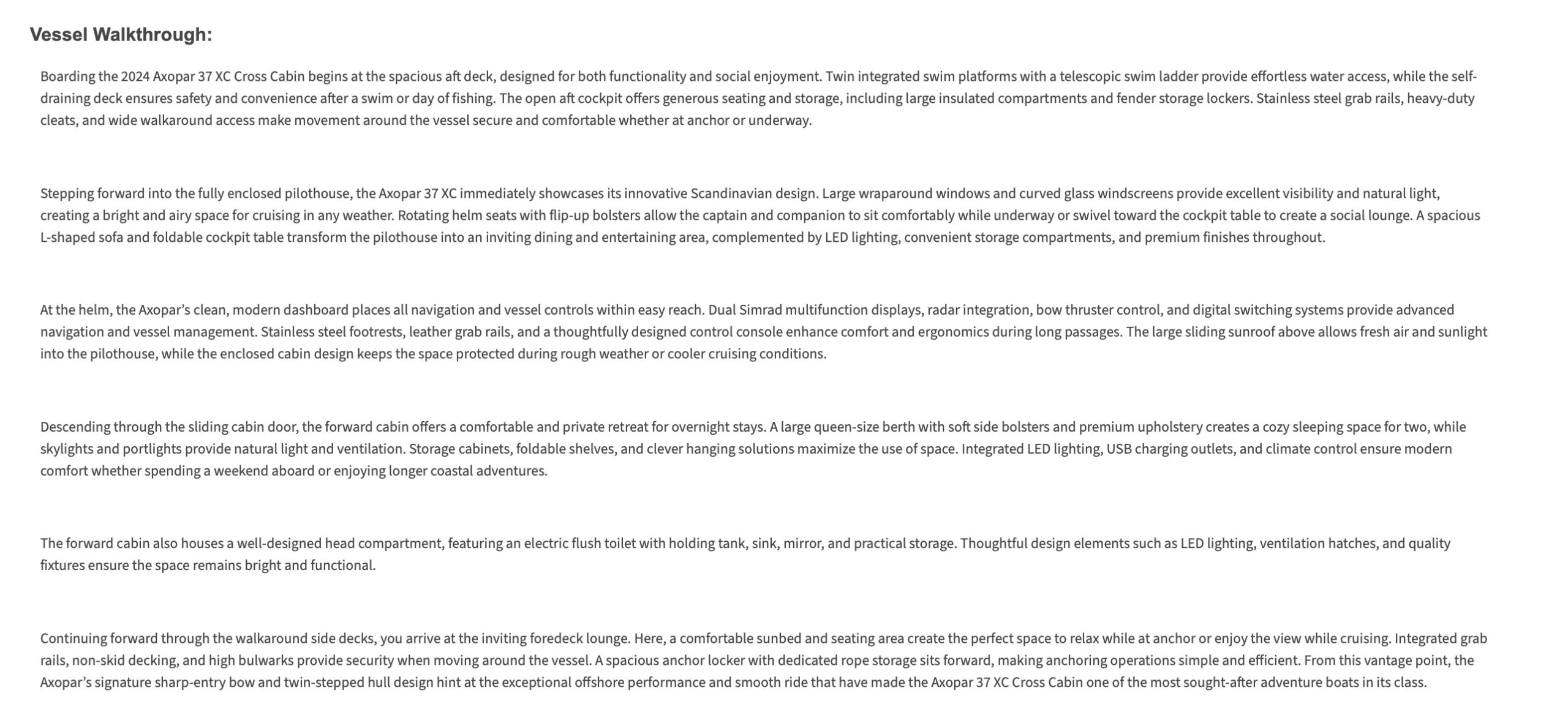 Renowned for its innovative layout, efficient hull design, and all-season capability, this 2024 Axopar 37 XC represents a rare opportunity to own one of the most versatile and high-performance 37-foot adventure yachts.