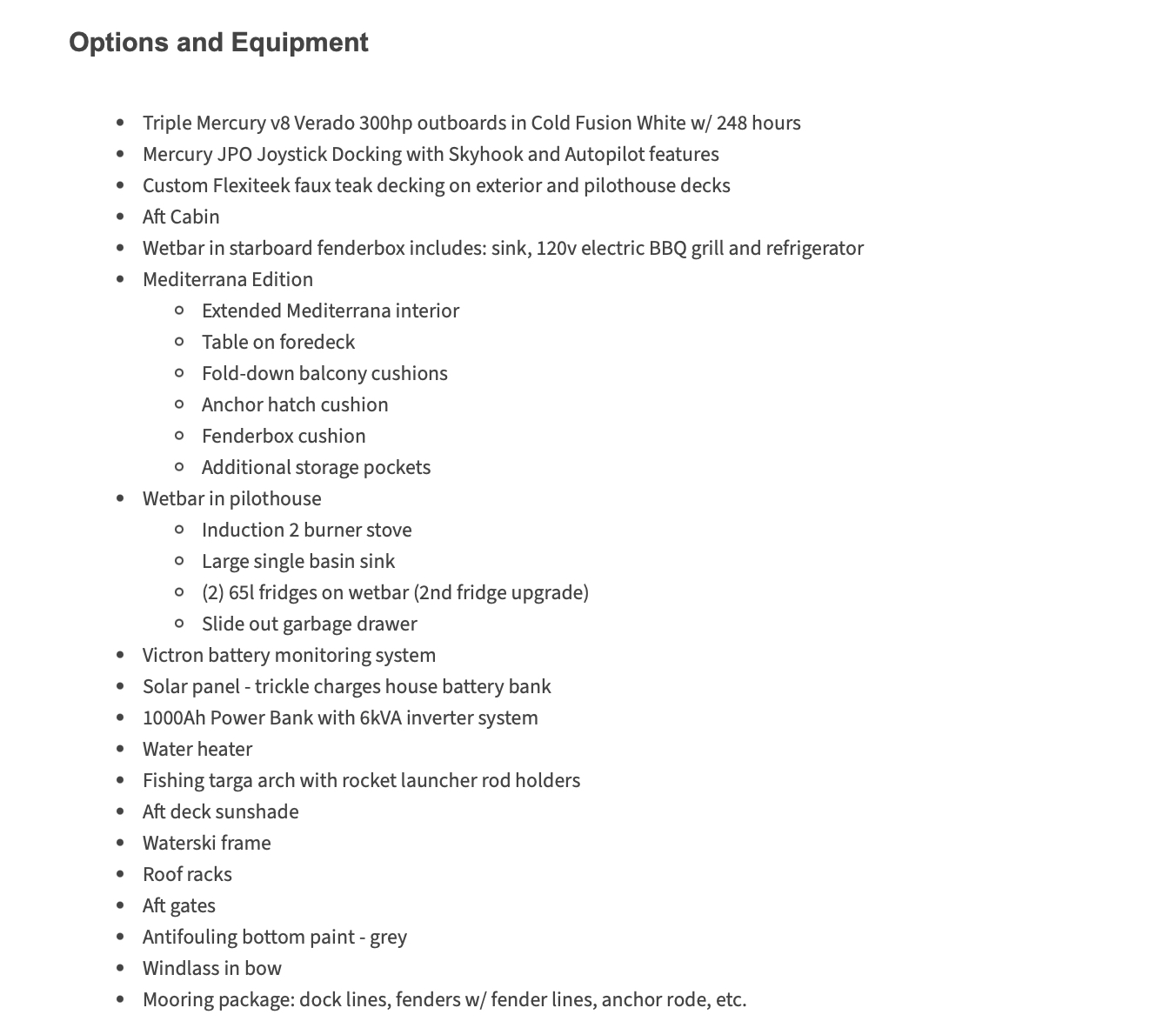 Le bateau qui est présenté sur cette page, l’est uniquement à titre d'information et n'est pas nécessairement toujours disponible à la vente et/ou à la location. Ce bateau est peut-être offert sous réserve, il faut vérifier sa disponibilité. Ce document ou cette annonce n'est pas contractuel. Les informations sur les bateaux affichées dans les résultats ci-dessus sont présentées en toute bonne foi et, bien qu'elles soient considérées comme correctes, elles ne sont pas garanties. Ita Yachts Canada et/ou ProprioBateau ne garantit pas et n'assume aucune responsabilité légale ou responsabilité pour l'exactitude, l'exhaustivité ou l'utilité des informations et/ou des images affichées, car elles peuvent ne pas être à jour ou encore êtres des images d'un bateau comparable. Toutes les informations sur les bateaux peuvent être modifiées sans préavis et sont sans garantie. Ce bateau est peut-être offert par un autre courtier ouvert au co-courtage (co-brokerage).