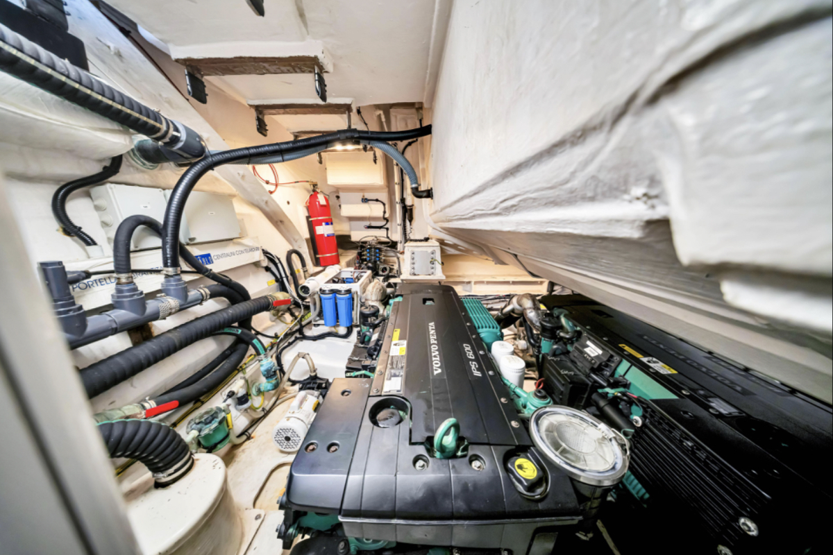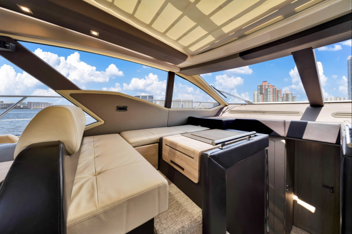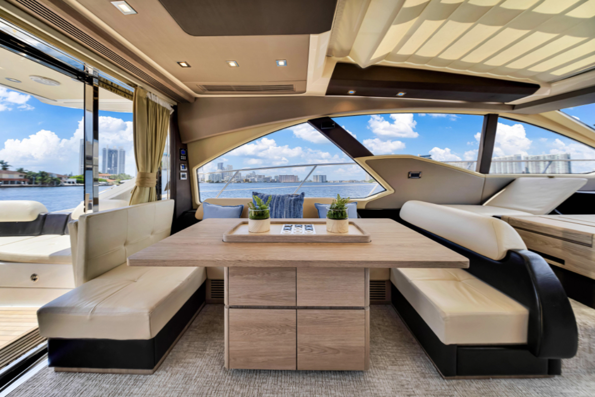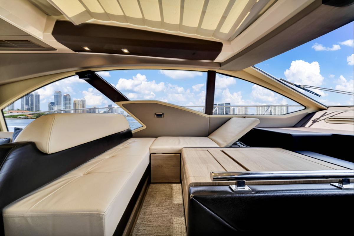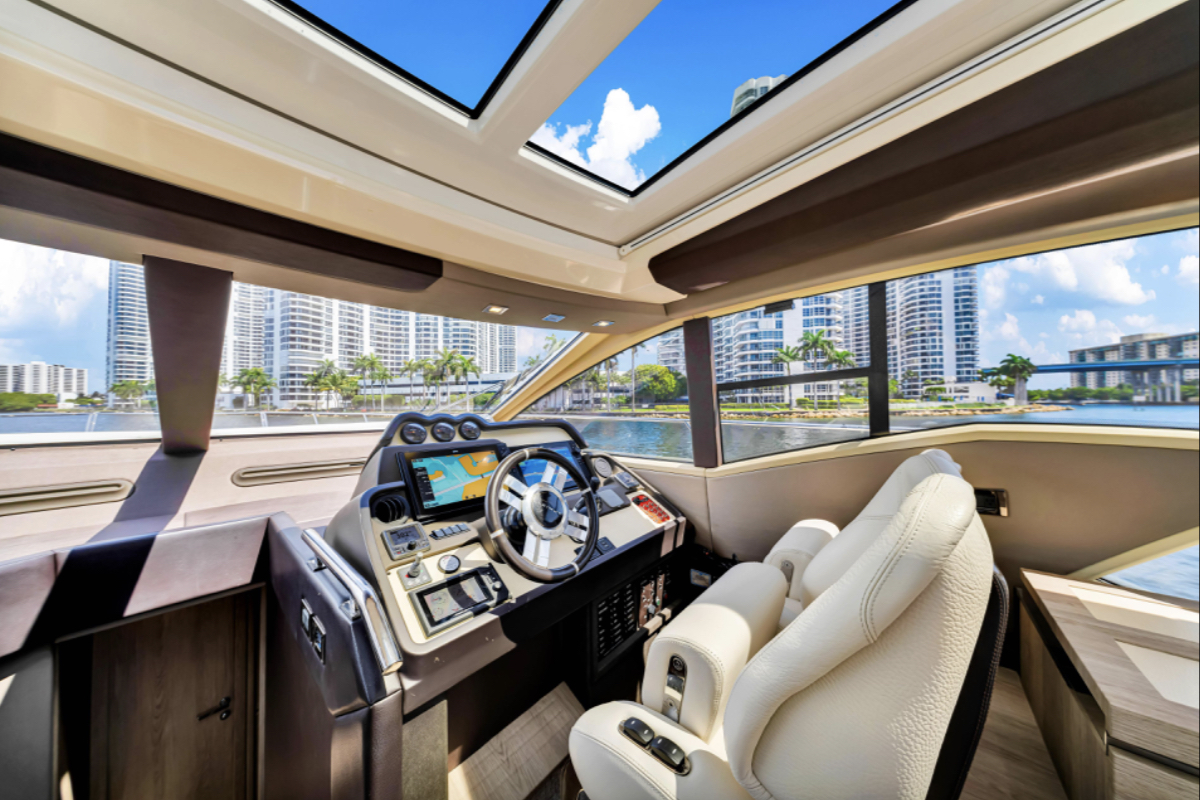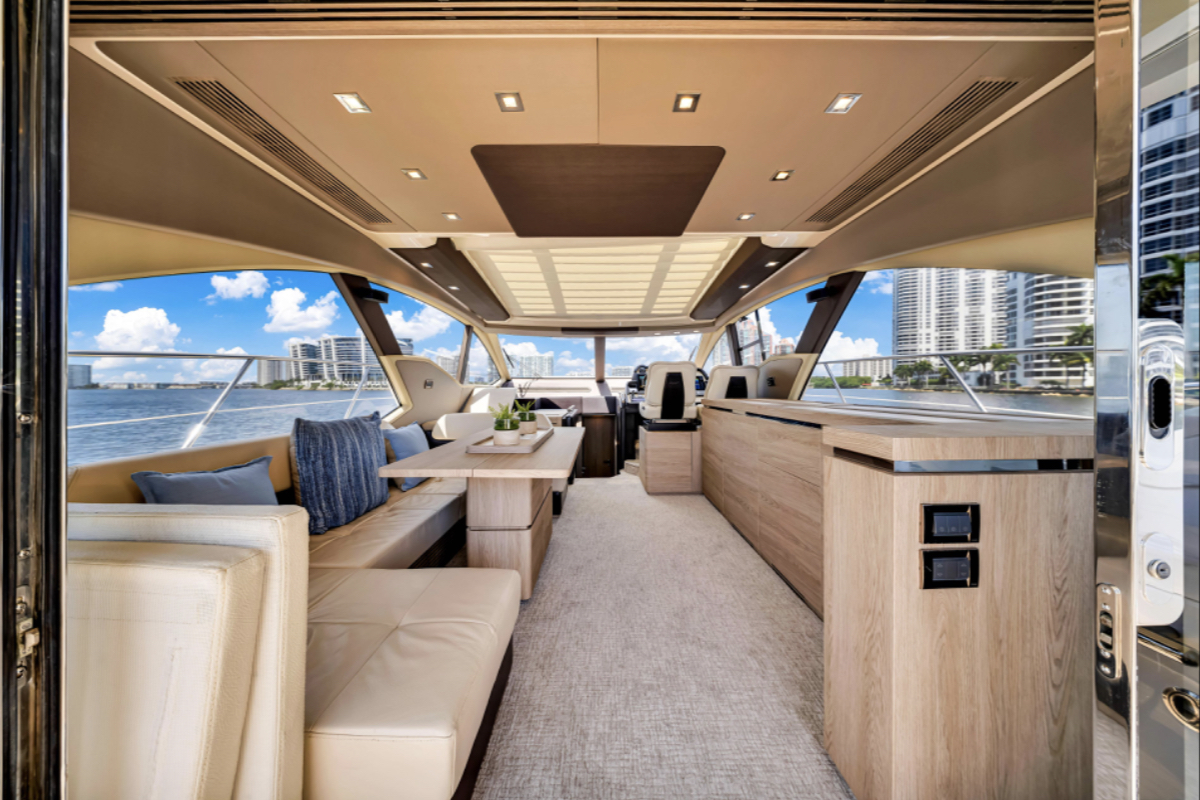 Powered by triple Volvo IPS 600 engines with joystick control, she offers smooth, responsive handling and stress-free docking. The retractable hardtop, expansive glass windows, and aft galley layout create an airy, open flow between interior and exterior spaces—perfect for entertaining.
