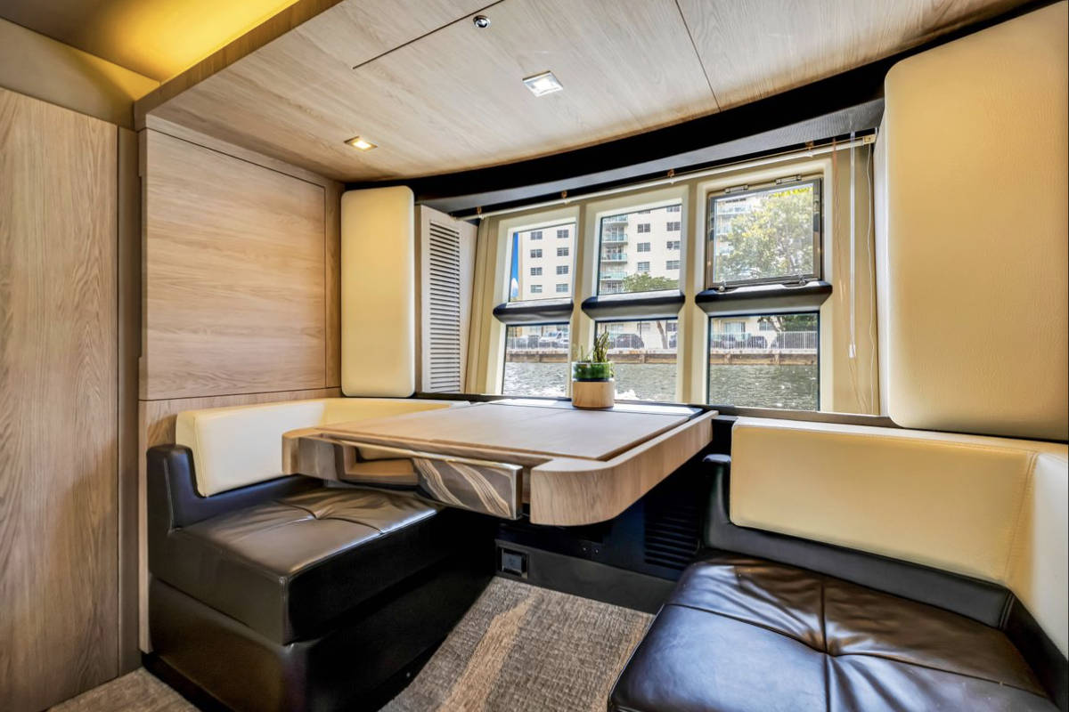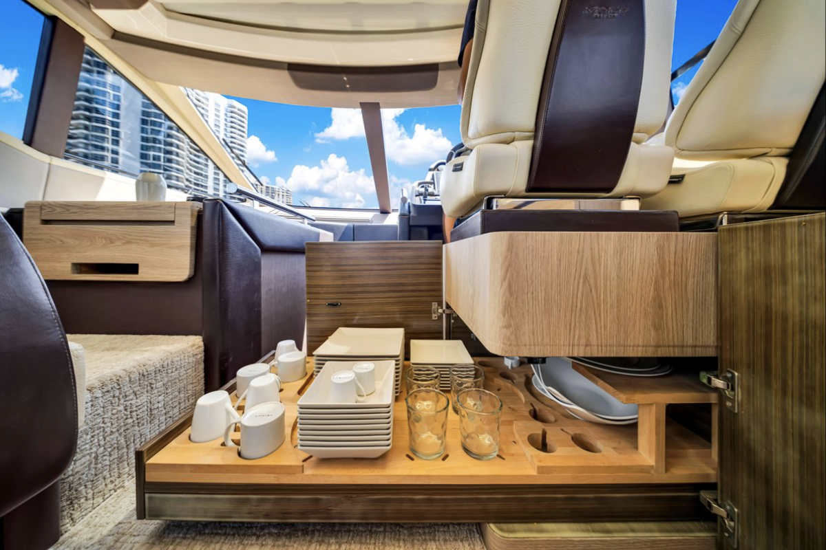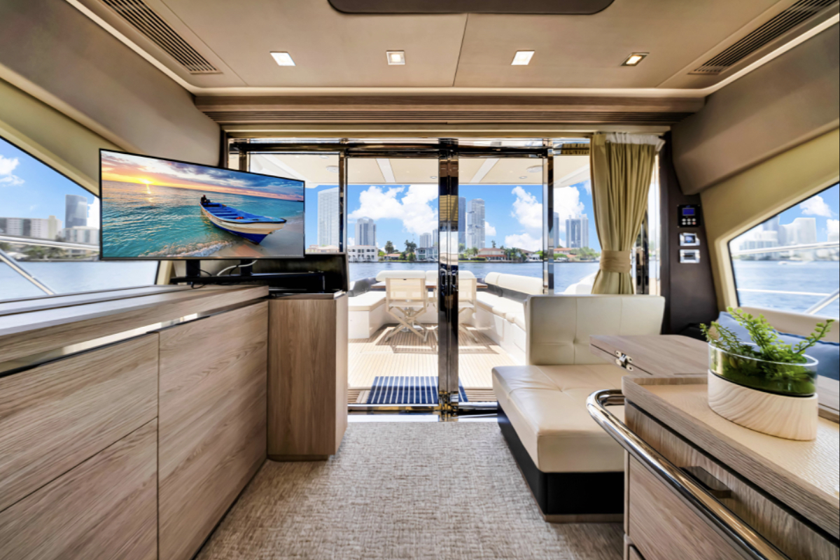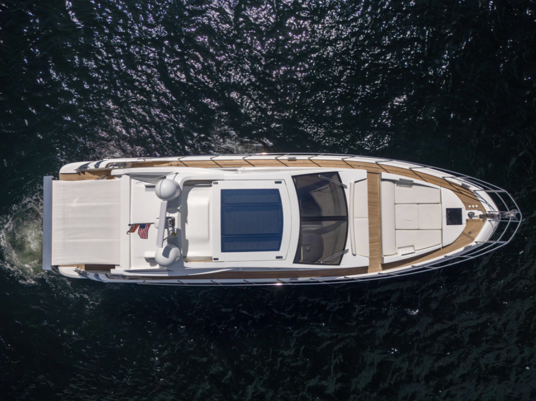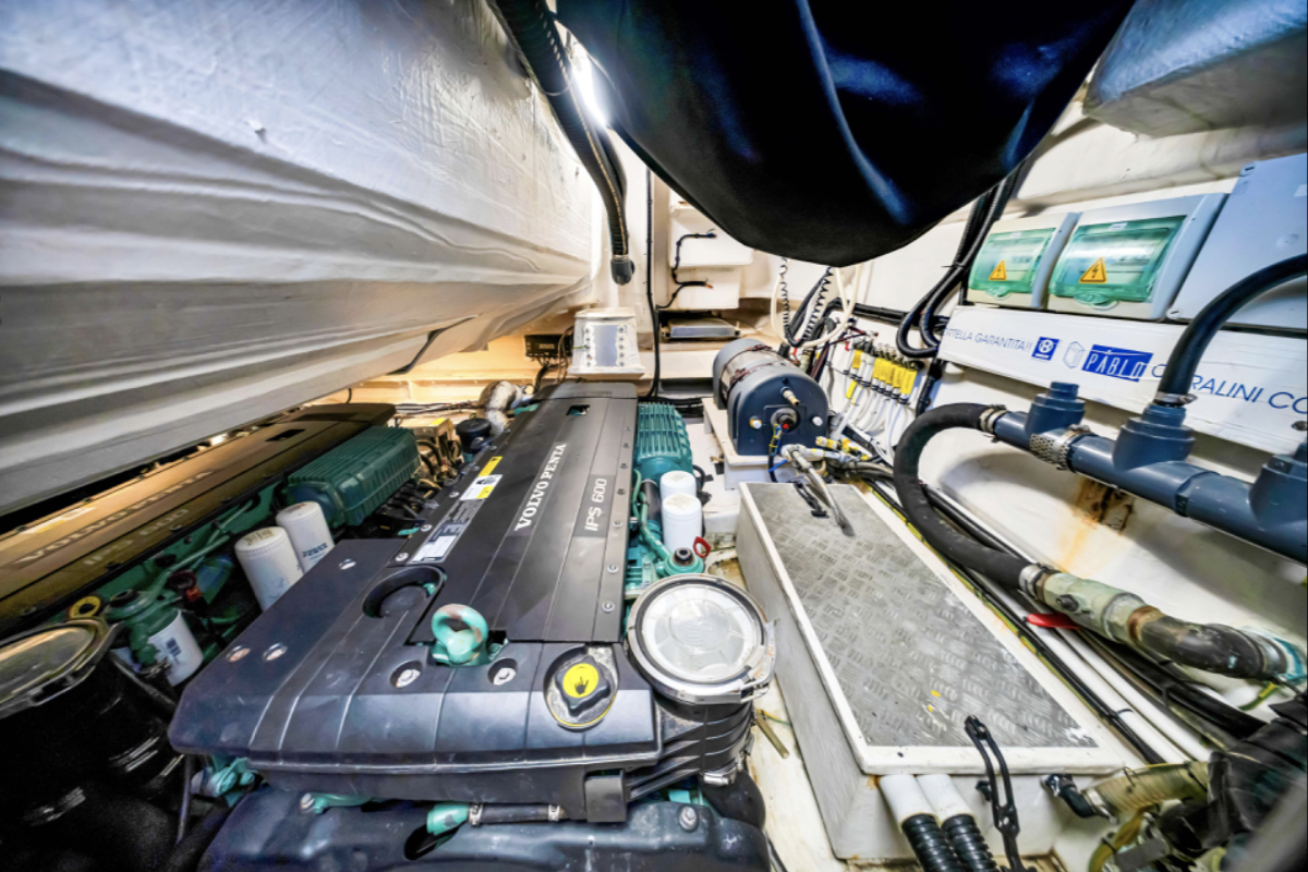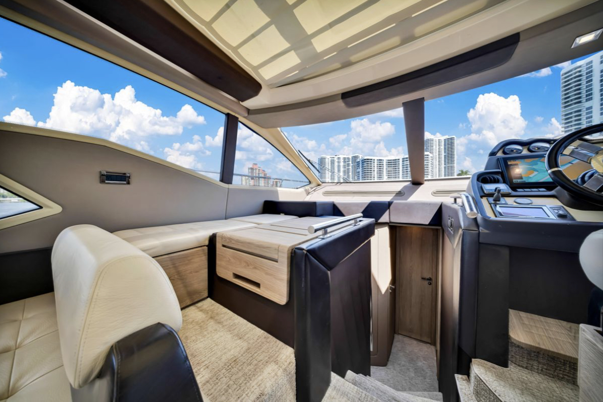 Powered by triple Volvo IPS 600 engines with joystick control, she offers smooth, responsive handling and stress-free docking. The retractable hardtop, expansive glass windows, and aft galley layout create an airy, open flow between interior and exterior spaces—perfect for entertaining.