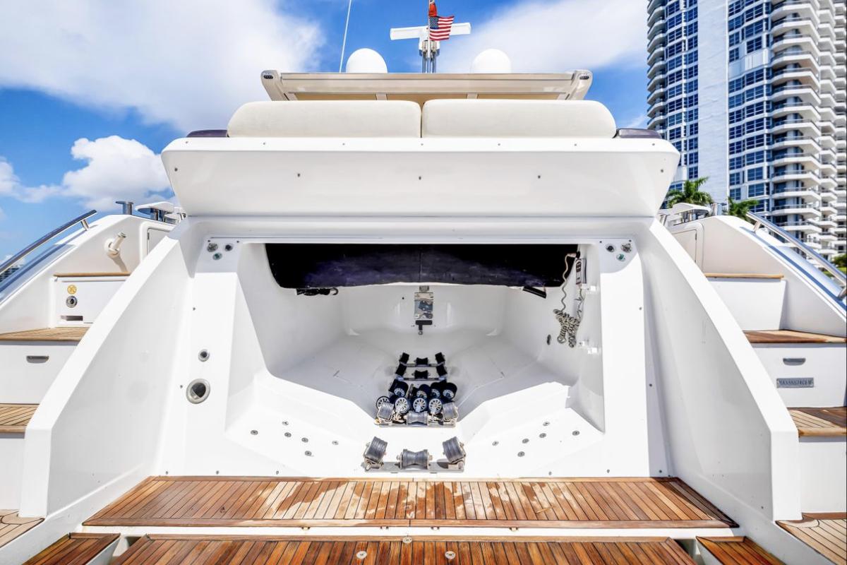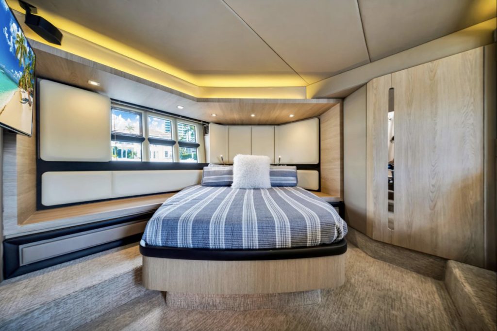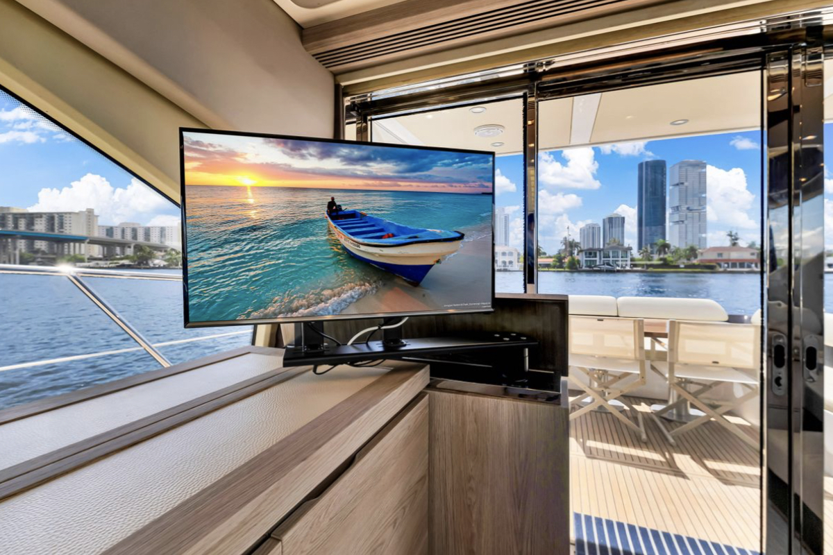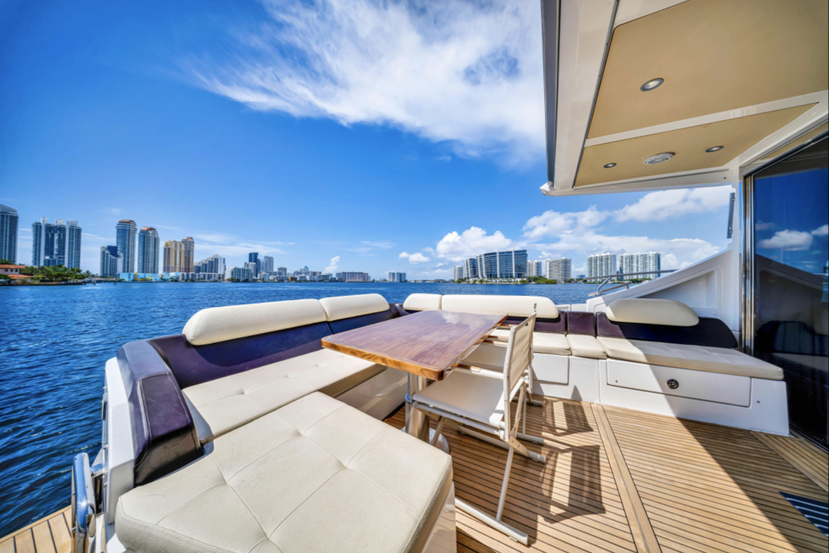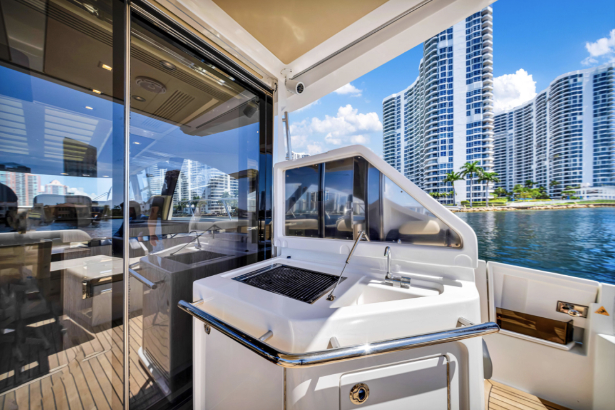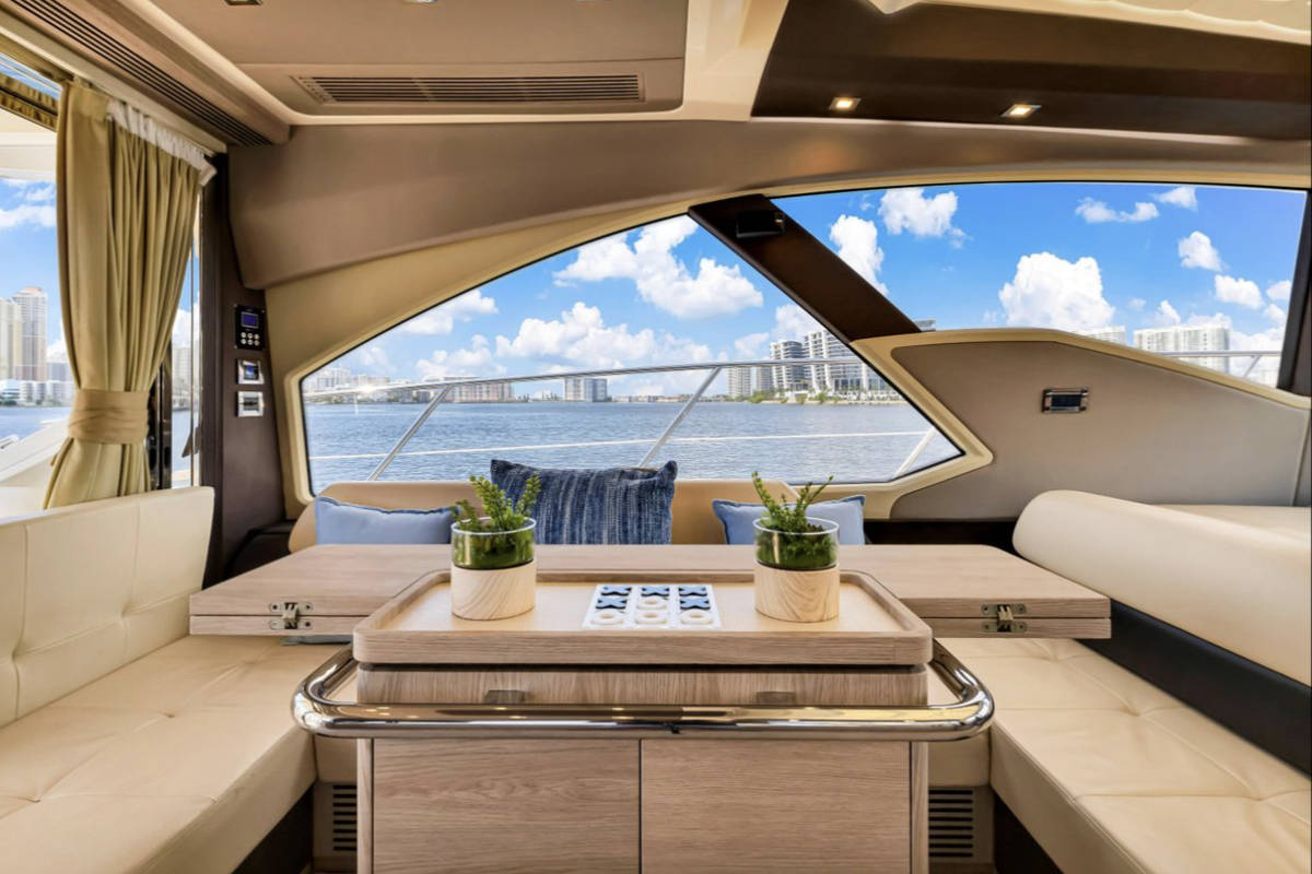 Powered by triple Volvo IPS 600 engines with joystick control, she offers smooth, responsive handling and stress-free docking. The retractable hardtop, expansive glass windows, and aft galley layout create an airy, open flow between interior and exterior spaces—perfect for entertaining.