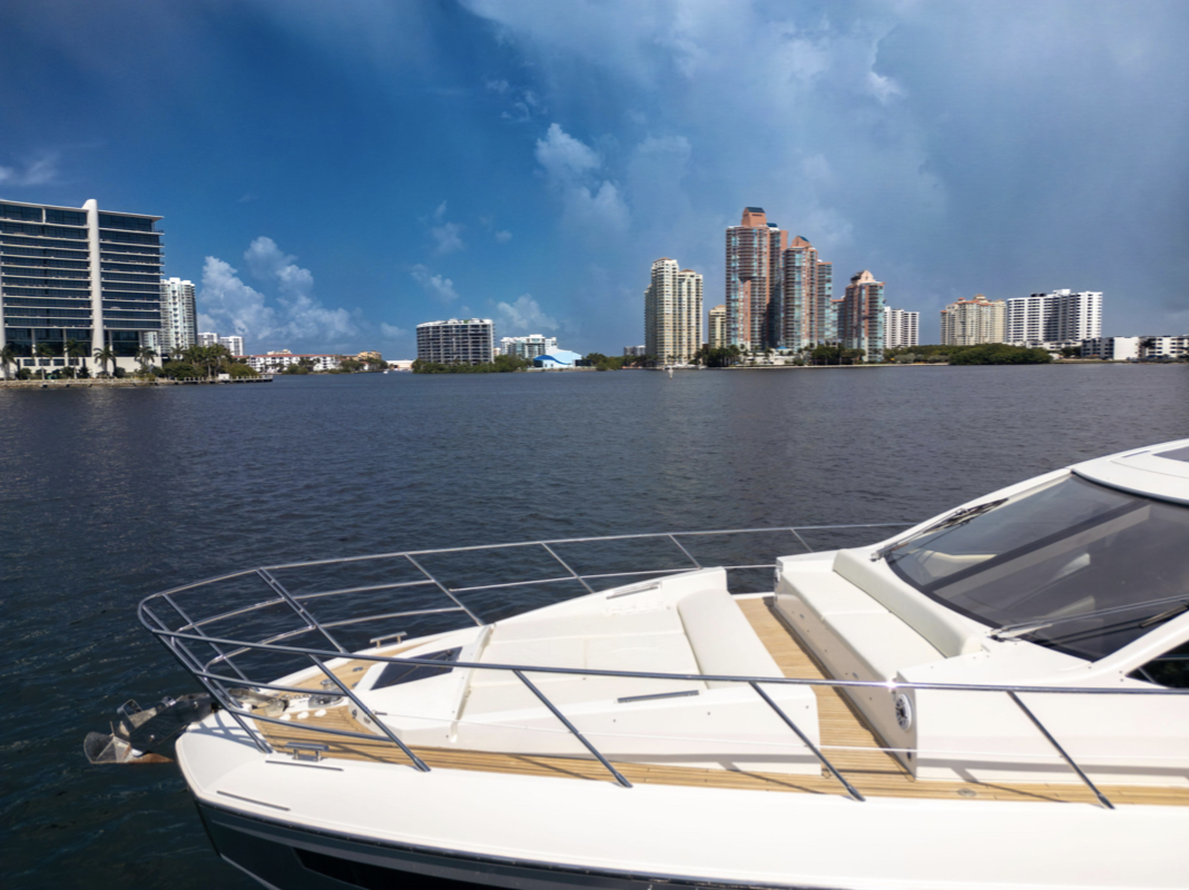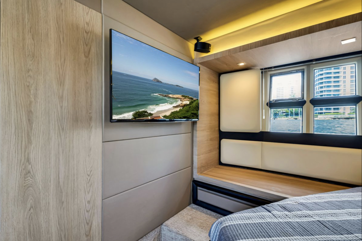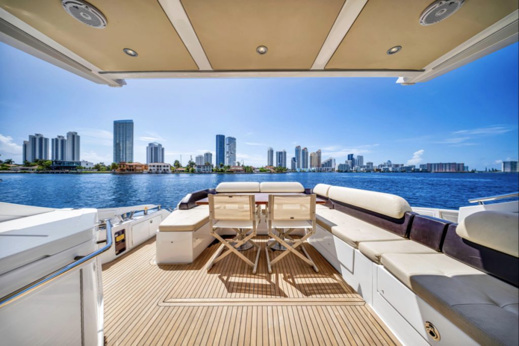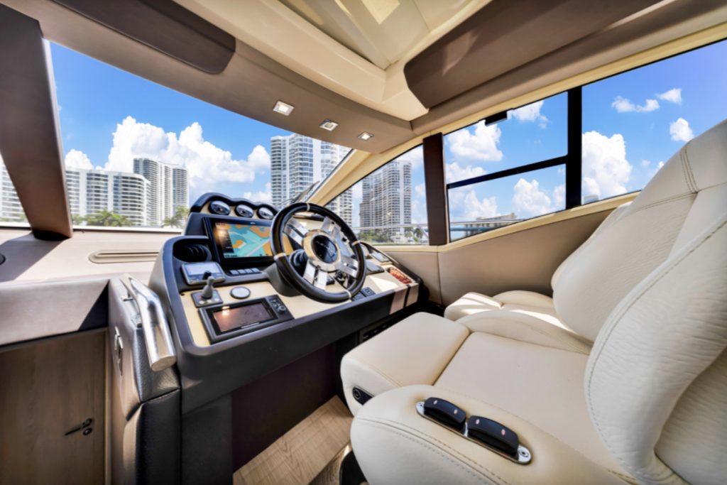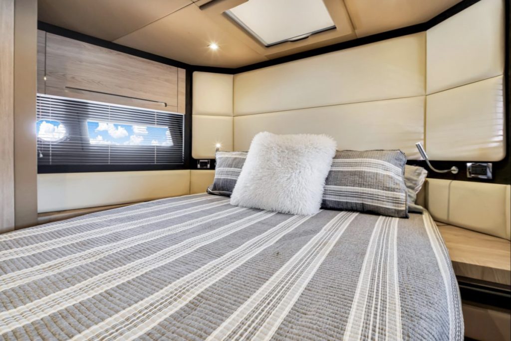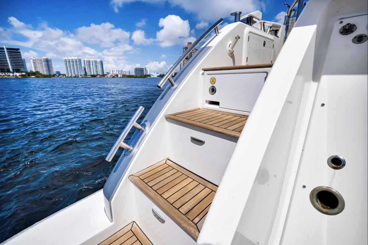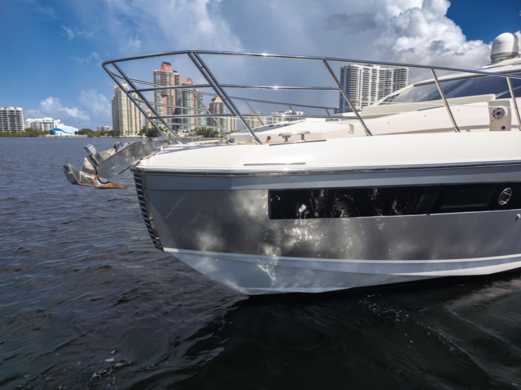Powered by triple Volvo IPS 600 engines with joystick control, she offers smooth, responsive handling and stress-free docking. The retractable hardtop, expansive glass windows, and aft galley layout create an airy, open flow between interior and exterior spaces—perfect for entertaining.