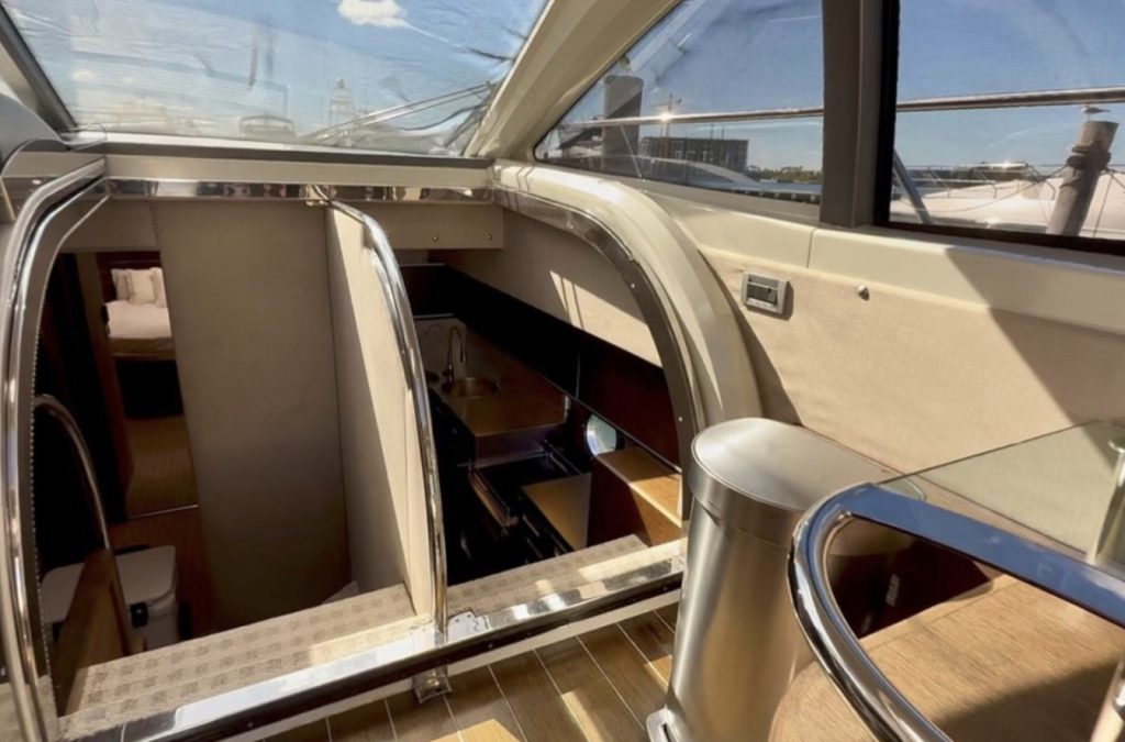 This hull was designed around one idea: open-air Italian living at 30+ knots. The sliding pocket doors and retractable sunroof transform the salon into a seamless indoor-outdoor space flooded with natural light. Aft, the wide cockpit offers alfresco dining and an oversized sun bed — all backed by a JL Audio sound system that sets the tone for any gathering. Forward, a dedicated lounge area gives guests a second social zone most boats this size simply don’t have.