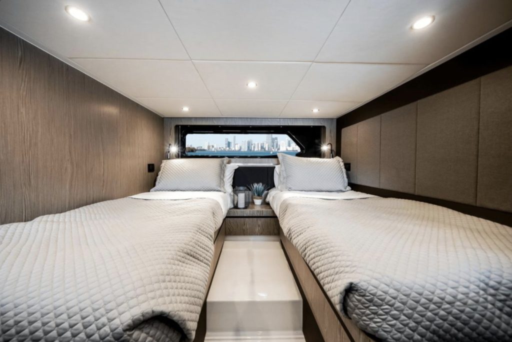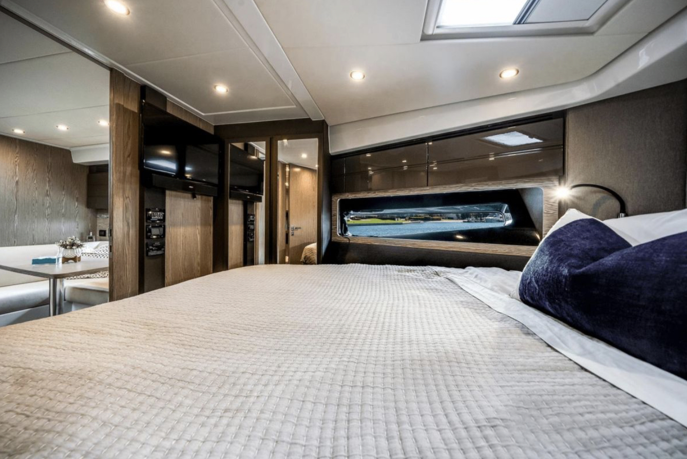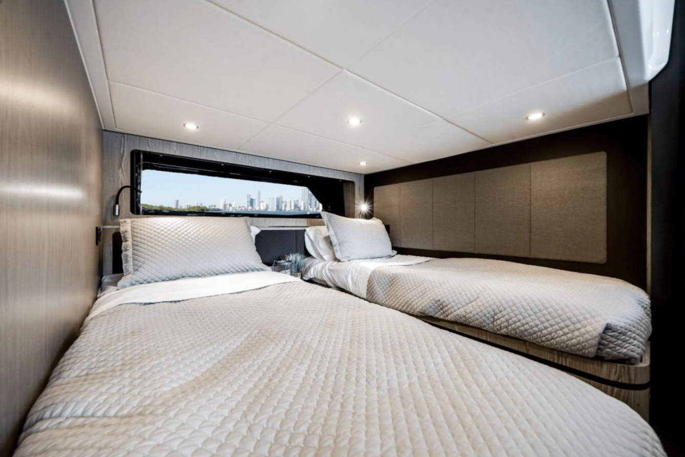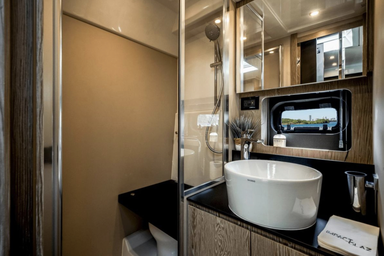 Impact Glaz can accommodate up to 7 overnight guests in 2 cabins along with a convertible dinette. Two full heads, one being the primary ensuite, ensures privacy for all. A spacious and full galley compliments the lower cabin dinette and lounging areas to make staying aboard a pleasure.