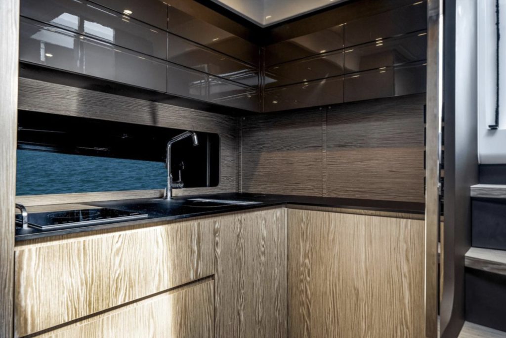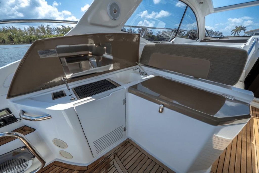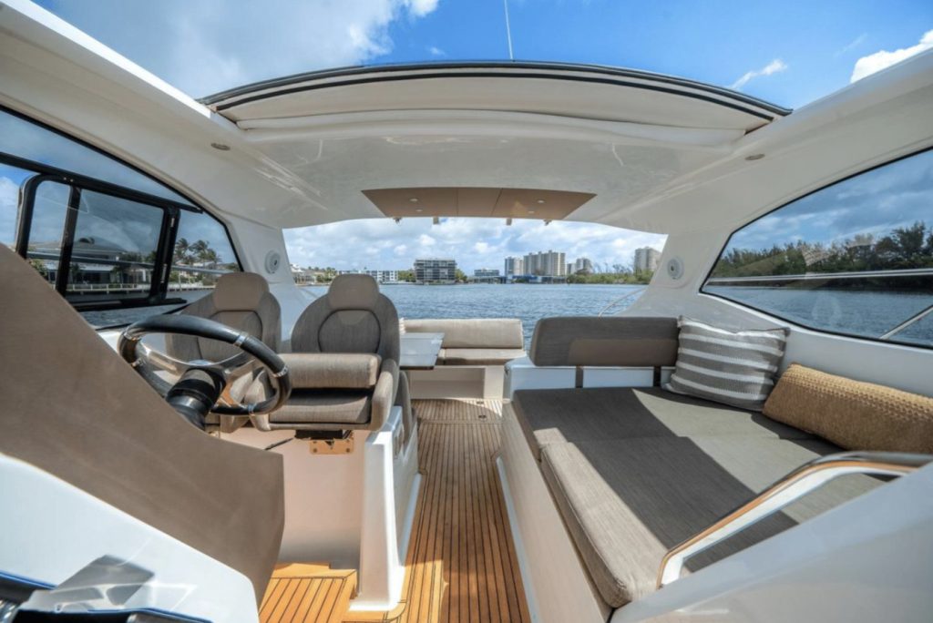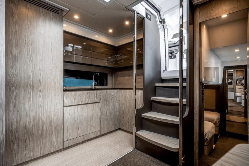 The cockpit is built for entertaining and sun worshiping. A retractable hardtop, three separate sunbeds, the lowering bathing platform and toy garage are complimented by the exterior entertainment bar and grill area. A day on the water will be enjoyed in complete comfort and elegance.