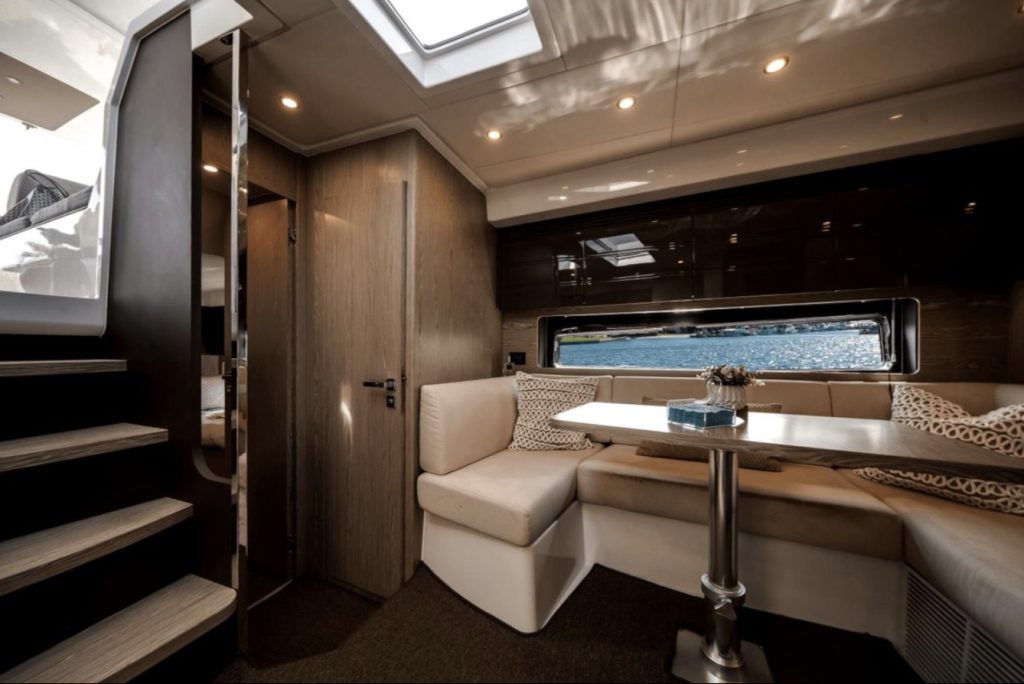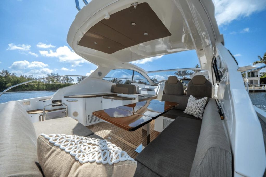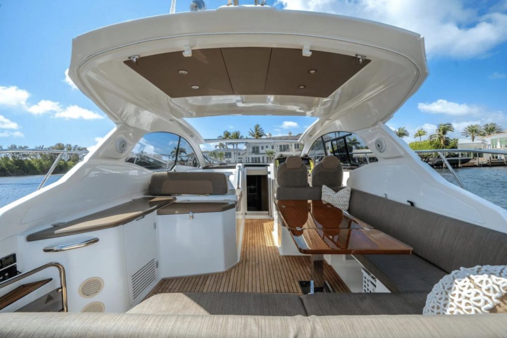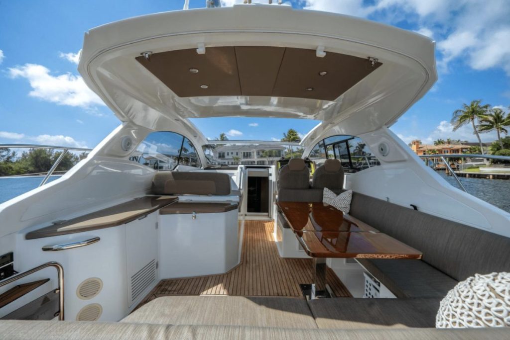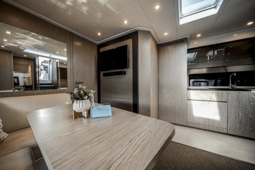The cockpit is built for entertaining and sun worshiping. A retractable hardtop, three separate sunbeds, the lowering bathing platform and toy garage are complimented by the exterior entertainment bar and grill area. A day on the water will be enjoyed in complete comfort and elegance.
