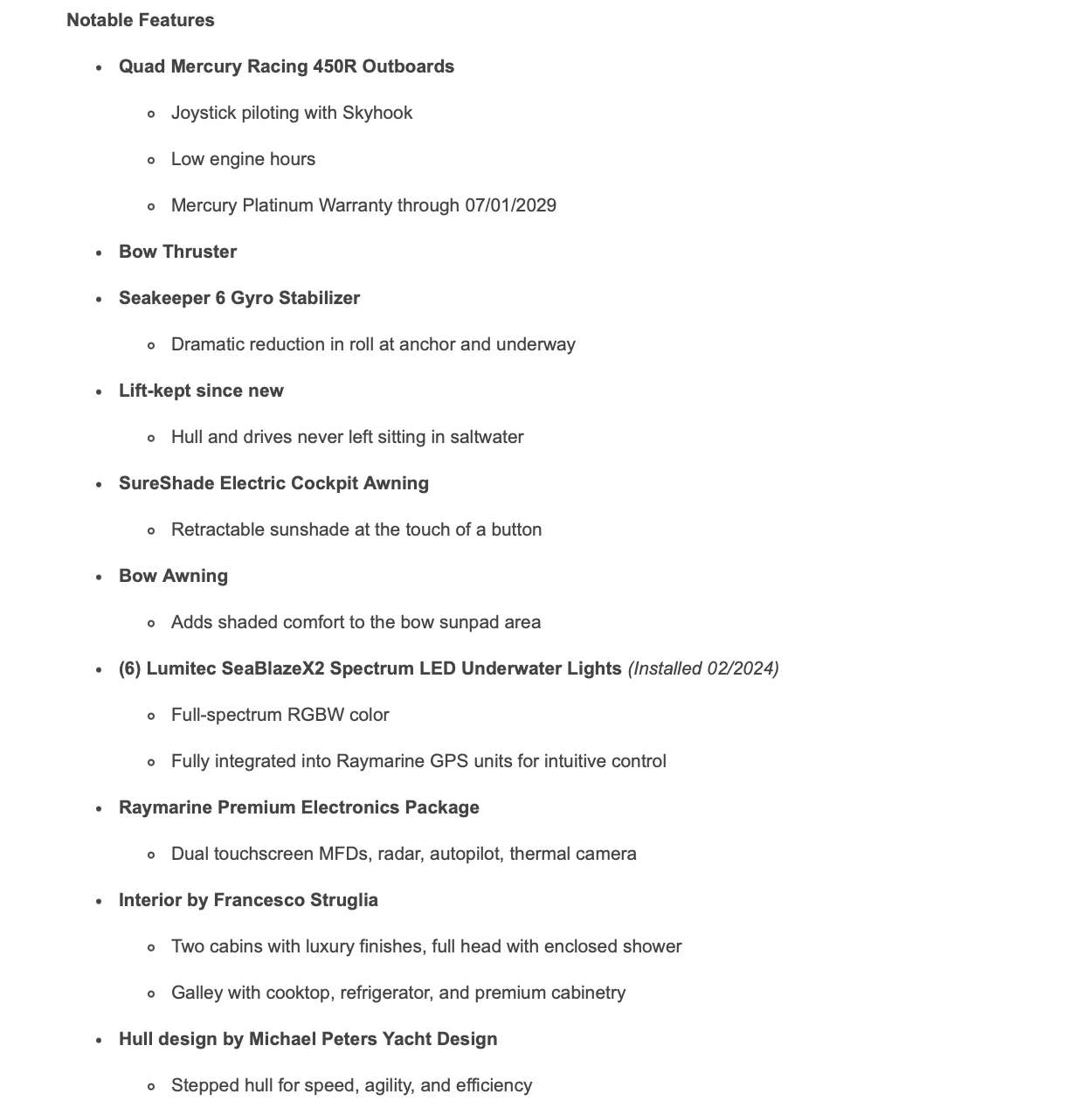 Over $80,000 invested in Mercury Platinum Extended Warranties, valid through July 1, 2029, ensures years of worry-free boating. With low hours and meticulous maintenance, this vessel stands out as one of the most dialed-in Verve 47s available today.