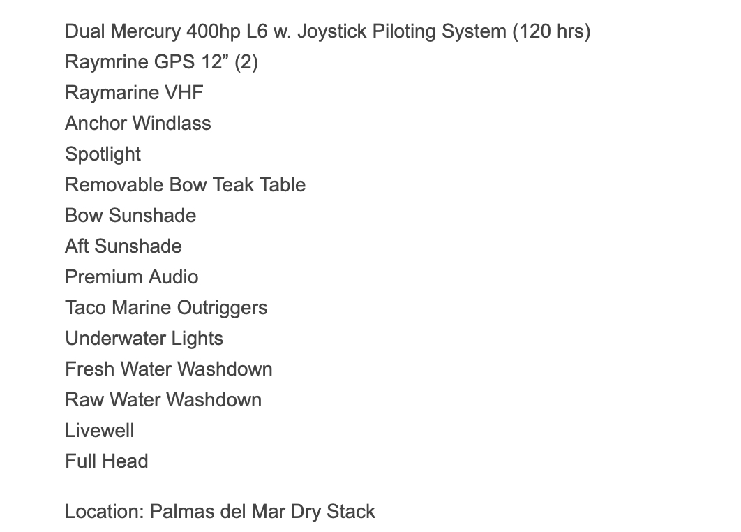 Le bateau qui est présenté sur cette page, l’est uniquement à titre d'information et n'est pas nécessairement toujours disponible à la vente et/ou à la location. Ce bateau est peut-être offert sous réserve, il faut vérifier sa disponibilité. Ce document ou cette annonce n'est pas contractuel. Les informations sur les bateaux affichées dans les résultats ci-dessus sont présentées en toute bonne foi et, bien qu'elles soient considérées comme correctes, elles ne sont pas garanties. Ita Yachts Canada et/ou ProprioBateau ne garantit pas et n'assume aucune responsabilité légale ou responsabilité pour l'exactitude, l'exhaustivité ou l'utilité des informations et/ou des images affichées, car elles peuvent ne pas être à jour ou encore êtres des images d'un bateau comparable. Toutes les informations sur les bateaux peuvent être modifiées sans préavis et sont sans garantie. Ce bateau est peut-être offert par un autre courtier ouvert au co-courtage (co-brokerage).