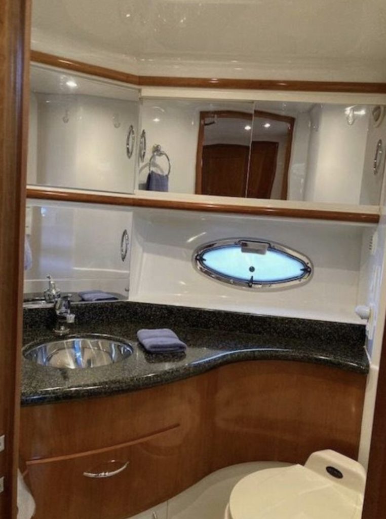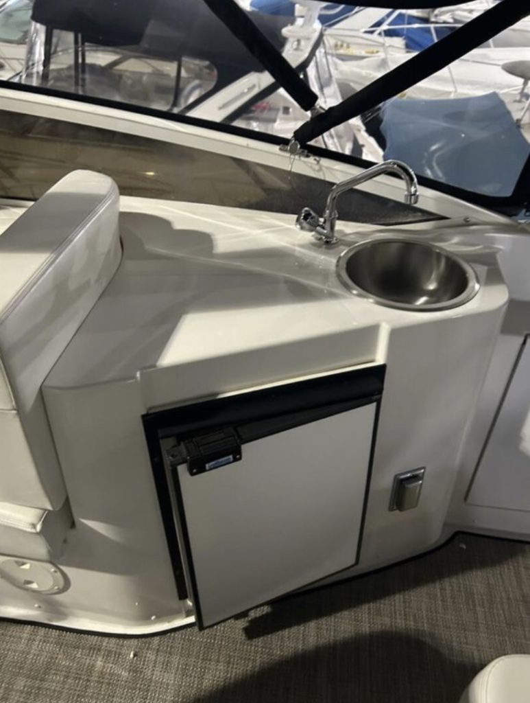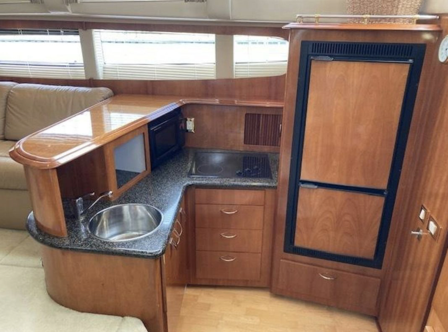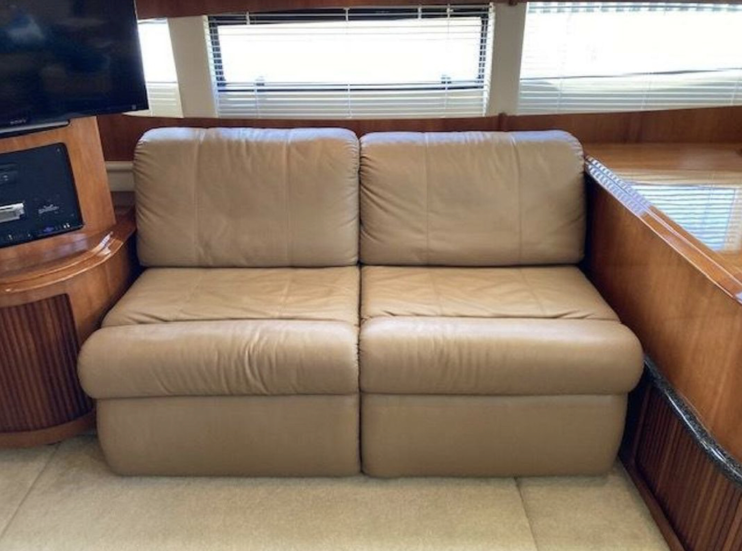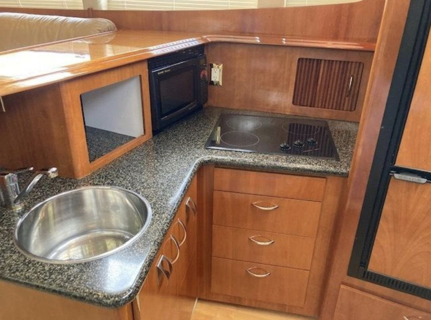Inside, the salon offers two reclining chairs on the starboard side and a sofa with pull-out storage on the port side. The galley is equipped with a microwave, electric cooktop, fridge, and freezer. For comfort, the yacht features three air conditioners/heat units for zone-controlled comfort in the main salon, V-berth, and master stateroom.