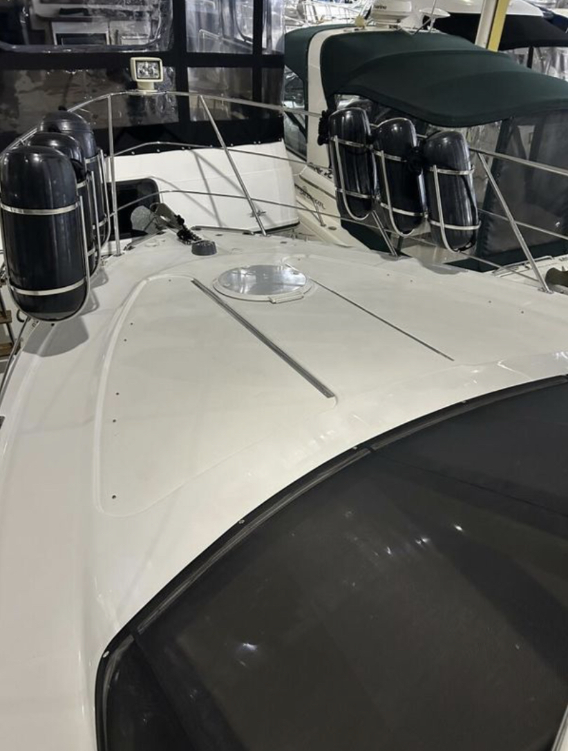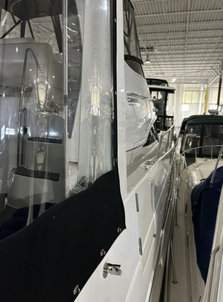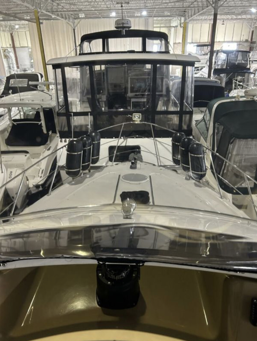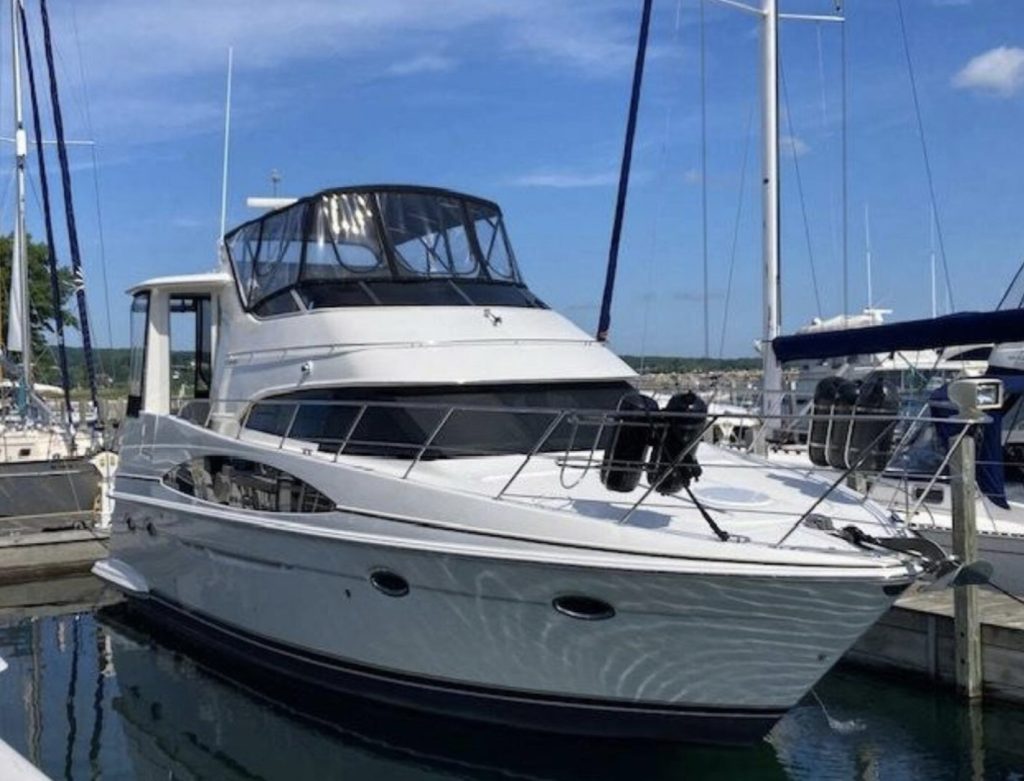 Its design offers nearly 7 feet of headroom in the salon, providing more interior space than any other 40-foot boat on the market. This model was only manufactured from 2000 to 2006. The bridge and aft deck are enclosed with Isinglass (new Winter 22/23), all in excellent condition.