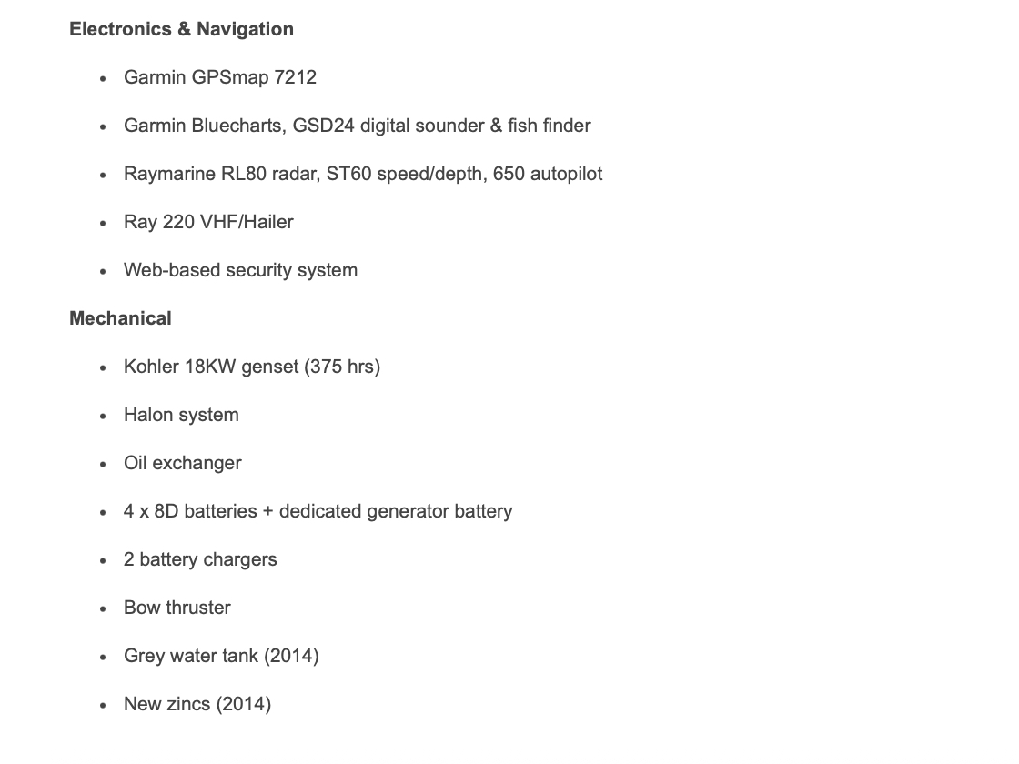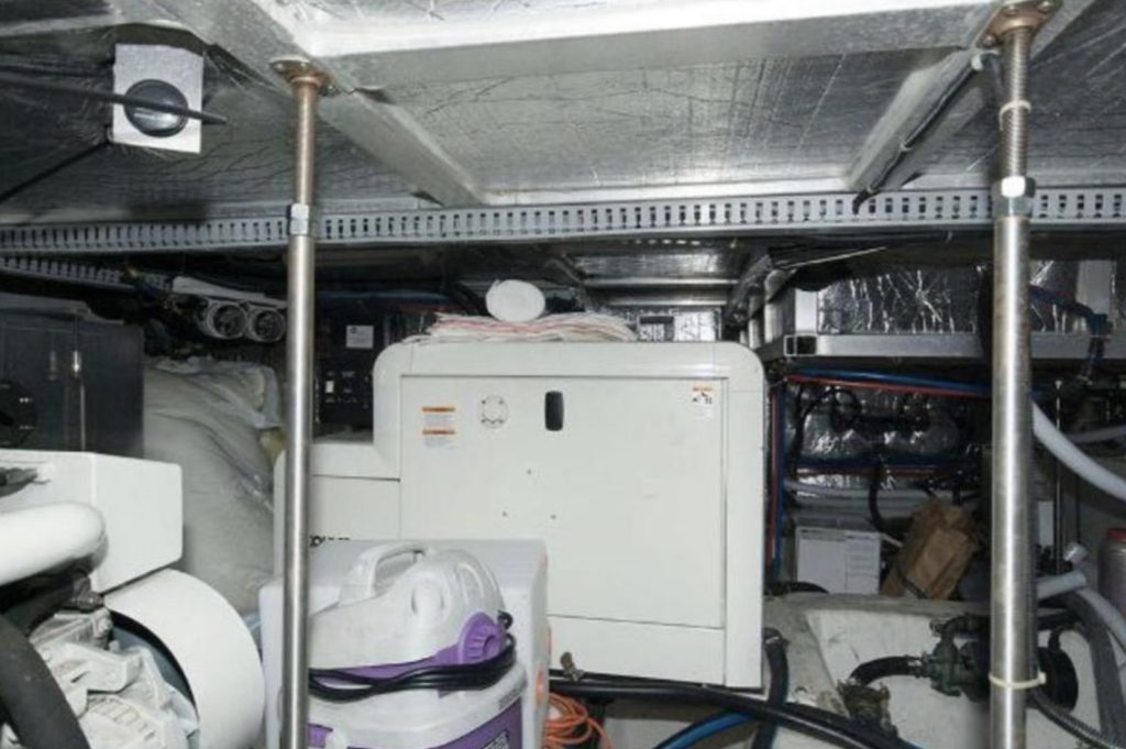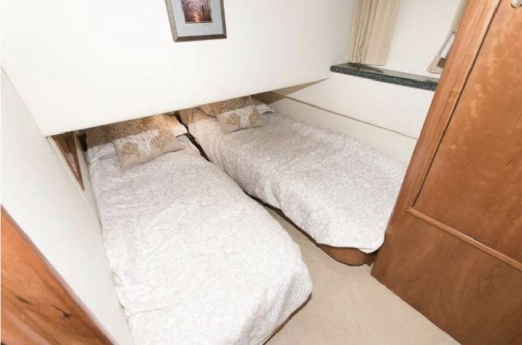Forward, the guest stateroom offers another queen-size island berth, inner-spring mattress, and a large private head. To port, a third stateroom provides a full-size locker, a private head, and a split-berth arrangement.