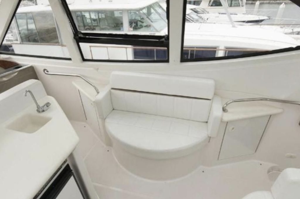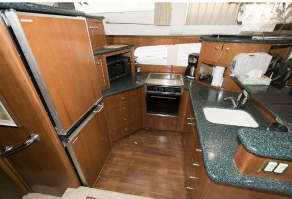 Overhead, the 506’s unique hardtop structure with built-in retractable sunroof lets in the sun or protects the crew from the rain. Below deck, the Carver 506 Motor Yacht has cherry wood paneling and cabinetry, designer hardware and fixtures, and solid-surface countertops that provide stunning detail to the main cabin.