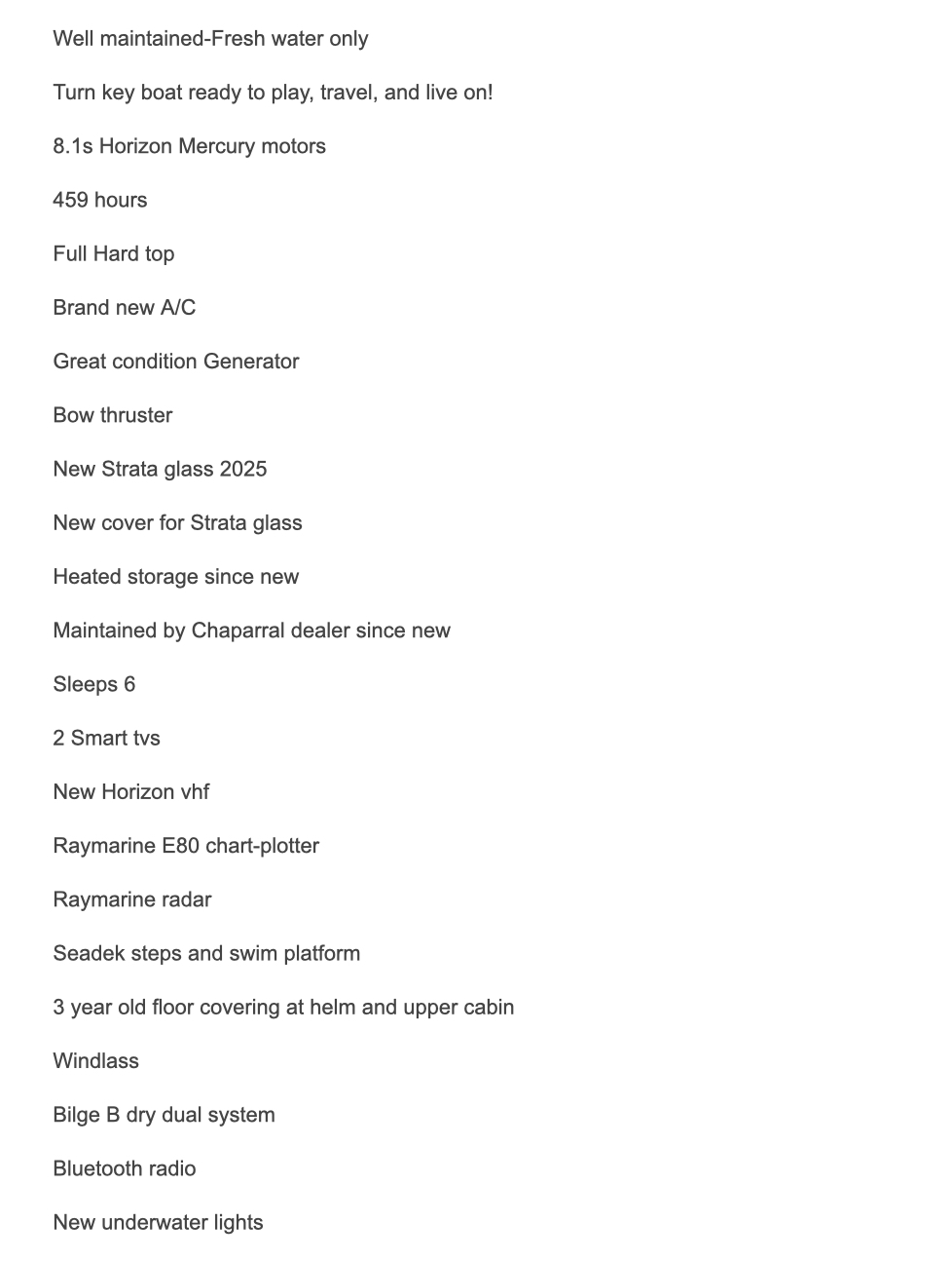 Always fresh-water, loaded with features. Twin Merc 8.1L 370 HP inboards with 460 hours. This is an ideal opportunity to own a well-cared-for Chaparral 350 Signature featuring a premium level of equipment and always boated on the fresh waters of Lake Michigan.