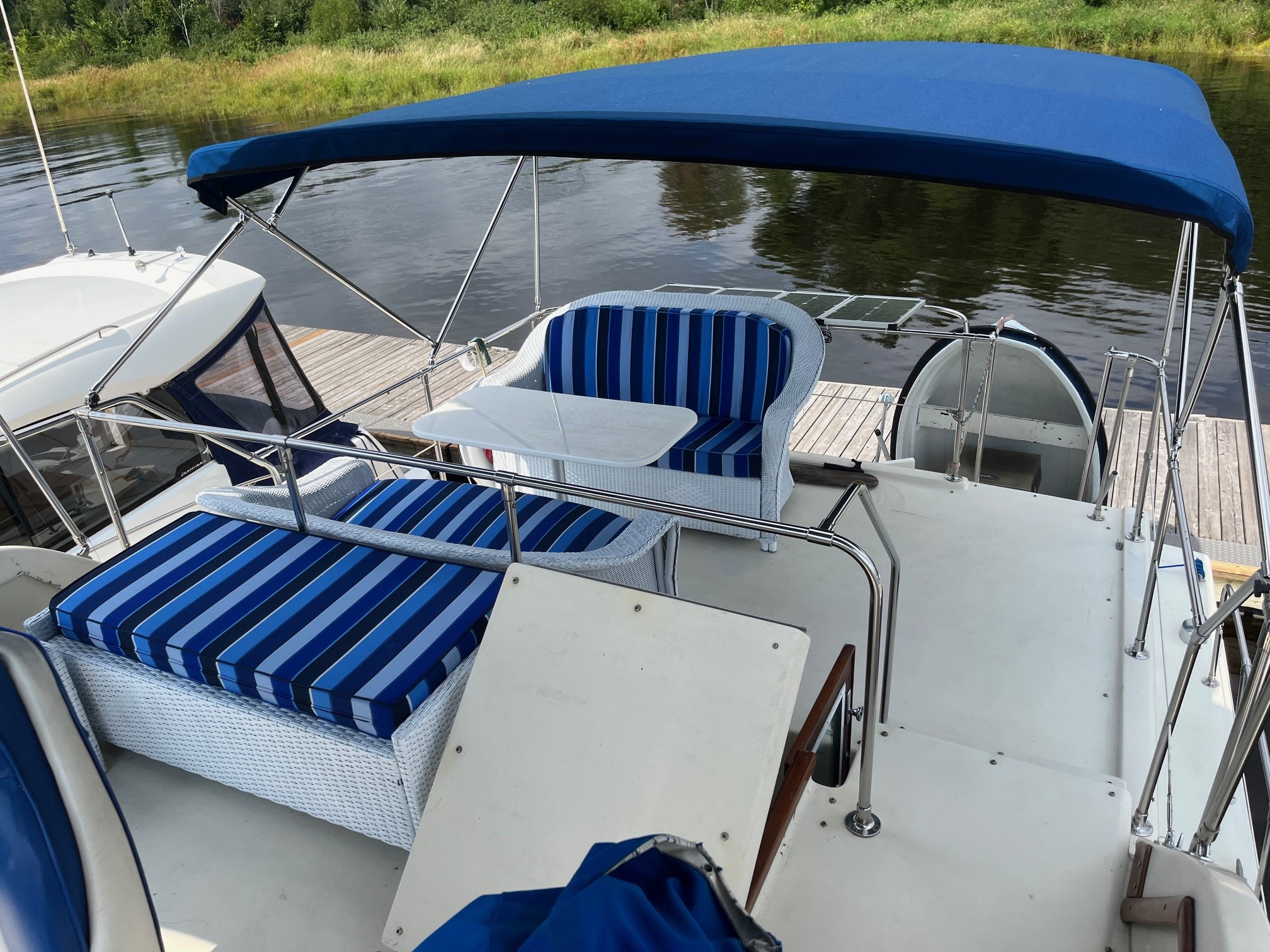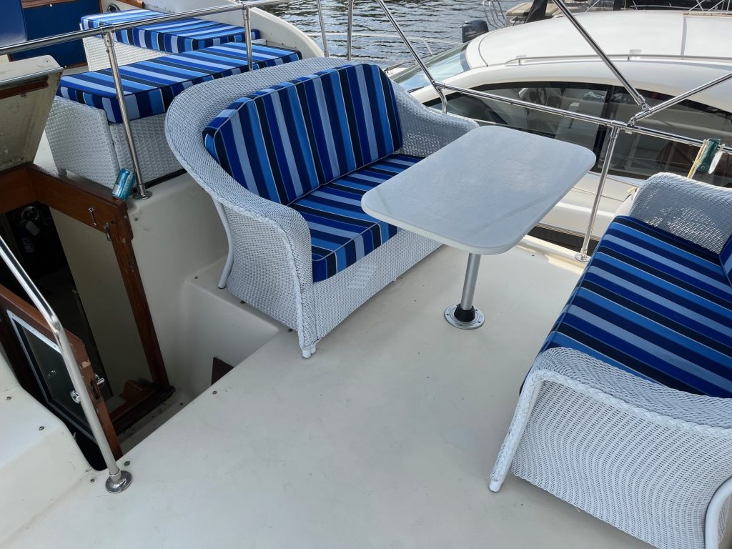 Ce yacht dispose de 2 grands « Fly bridge » offrant un espace généreux pour se détendre ou se divertir. Les 2 « Fly Bridge », peuvent accueillir plus de 10 personnes et vous permettant de piloter le bateau depuis son plus haut sommet. Pour un confort optimal, 2 biminis neufs séparés offrent de l’ombre sur les « Fly Bridge ». Pour profiter pleinement des journées de baignades ou de pêches agréables, ce bateau offre un grand cockpit à l’arrière. Un BBQ, des panneaux solaires servant de toit à la porte d’entrée du bateau et une petite embarcation de secours sont inclus avec le bateau. Ce bateau est idéal pour un maximum de plaisir et de confort sur l’eau.
