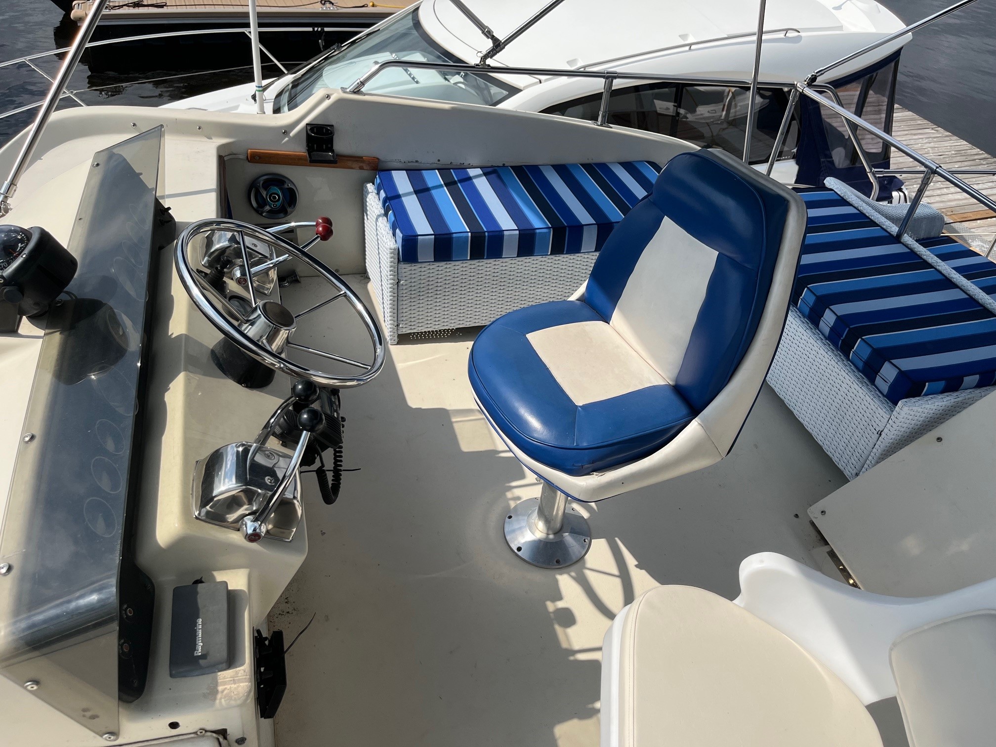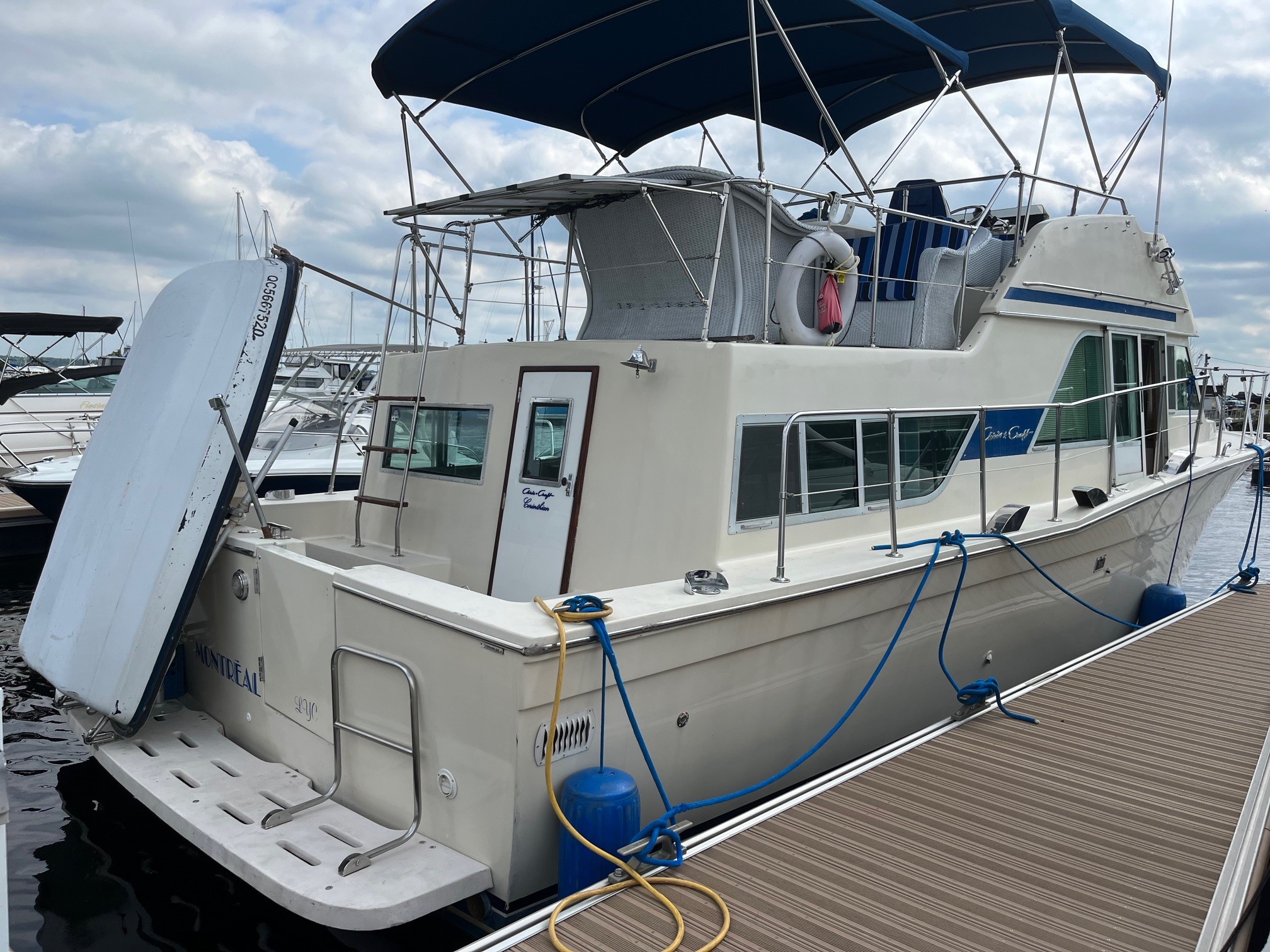 Chris-Craft Corinthian 1979 de 38 pieds, 2 moteurs à gaz 454 remis complètement à neuf en 2024 et 2025 par un expert de moteurs de bateau d’excellence, les 2 toits bimini et cousins sur les causettes sont neufs, thruster avant, 2 postes de pilotage, 2 toilettes et une douche, génératrice, ancre, polissage de la coque en 2023. Survey à la demande. Ce bateau est en très bon état car presque tout a été remis à neuf. L’intérieur est spacieux, beaucoup d’espace, de nombreux rangement, en excellent état. Le prix demandé est de 69,900 $ négociable. Il est important de mentionner que les 2 moteurs ont été installés en été 2025.