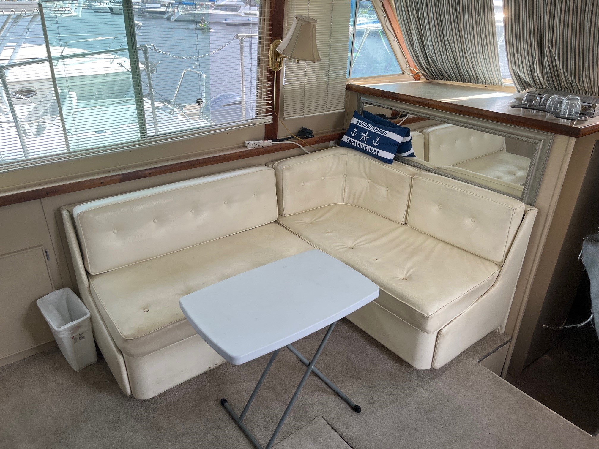 Le Chris-Craft Corinthian est le bateau idéal pour une vie à bord ou pour une croisière familiale dans le grand confort. De nombreux placards et tiroirs vous permettent de vous organiser. Au centre intérieur du bateau se trouve le salon avec un canapé en L pouvant accueillir 6 personnes. Le canapé se déplie en lit double pour les invités. En face du canapé se trouve la cuisine équipée d’un four à cuisson, plaque chauffante et d’un micro-ondes. Il est aussi équipé d’un réfrigérateur-congélateur spacieux. Un deuxième poste de navigation permet même de naviguer à l’intérieur par temps froid.