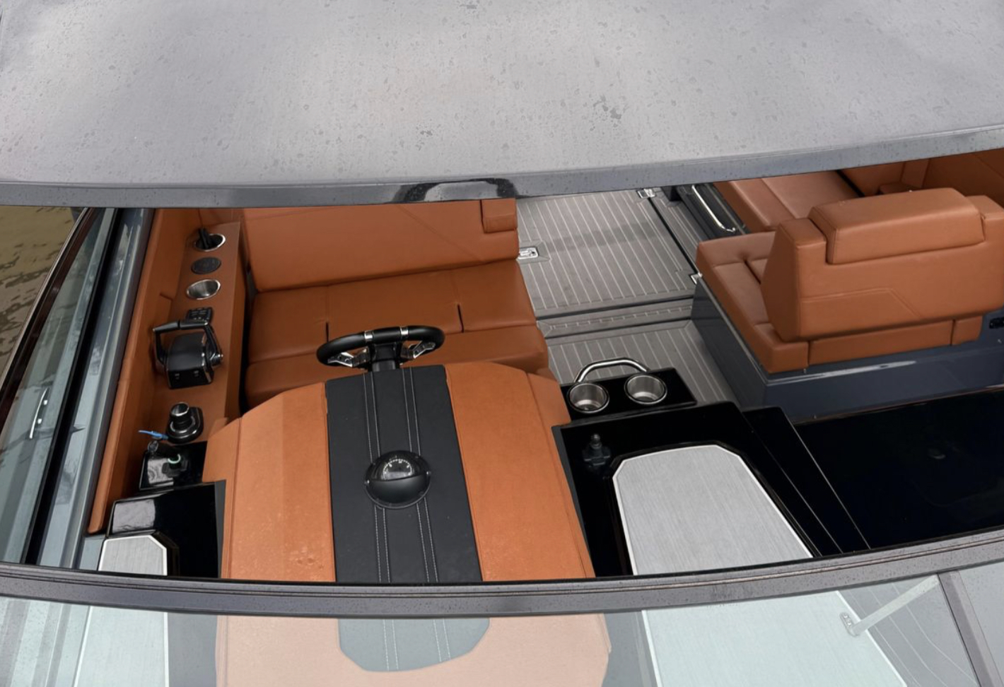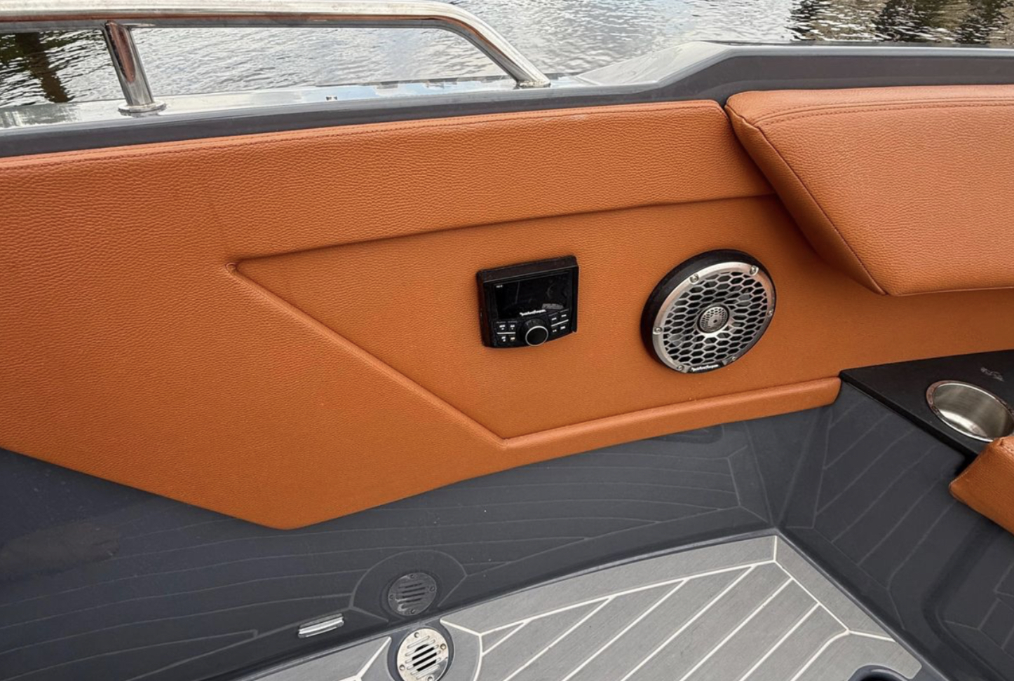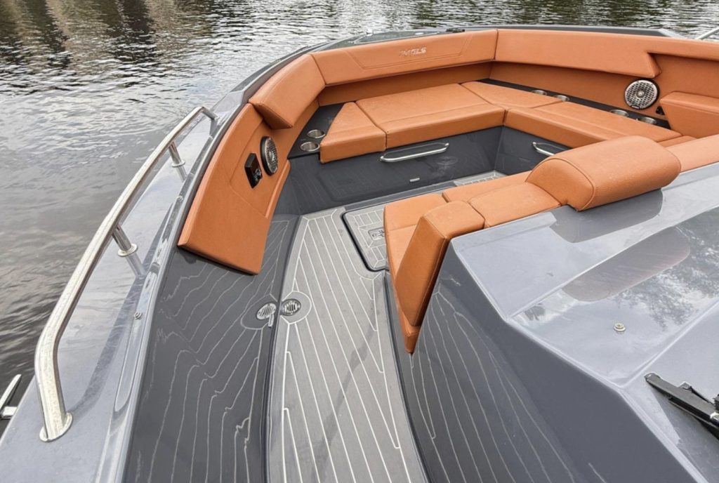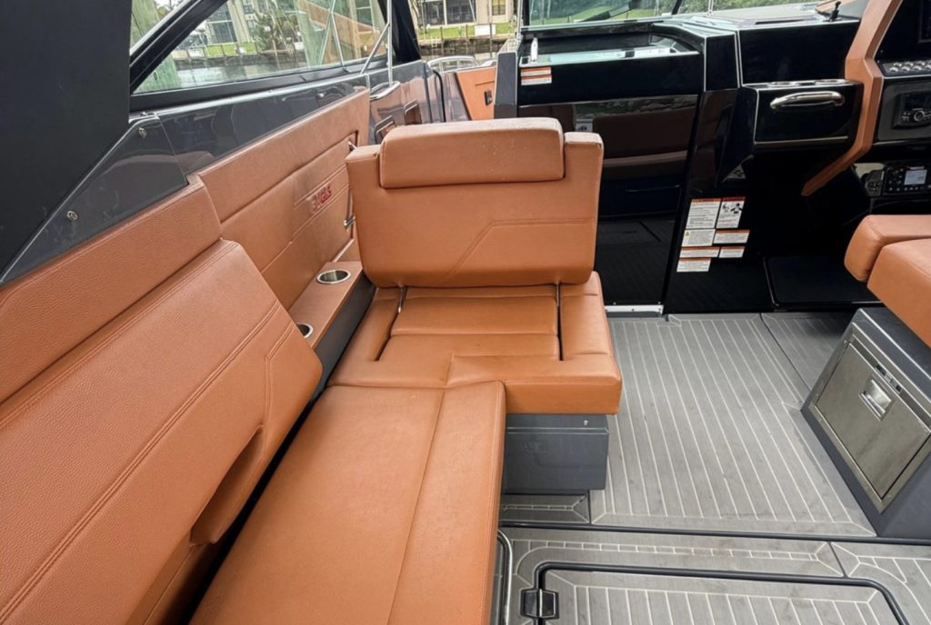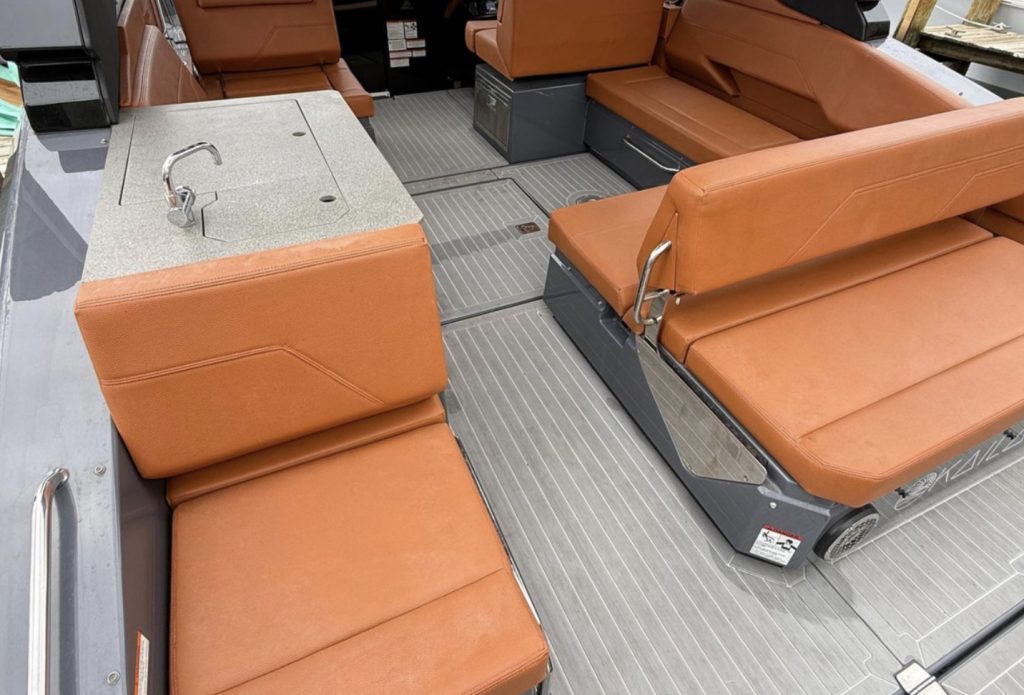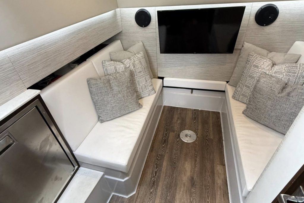 The spacious open layout offers comfortable seating for up to 12 guests, a large bow sunpad, aft cockpit lounge, premium SeaDek flooring, and a fully equipped wet bar with grill, sink, refrigerator, and ice maker — perfect for sandbar days and weekend cruising. The hardtop provides shade and protection, while the premium sound system creates the ultimate onboard entertainment experience.