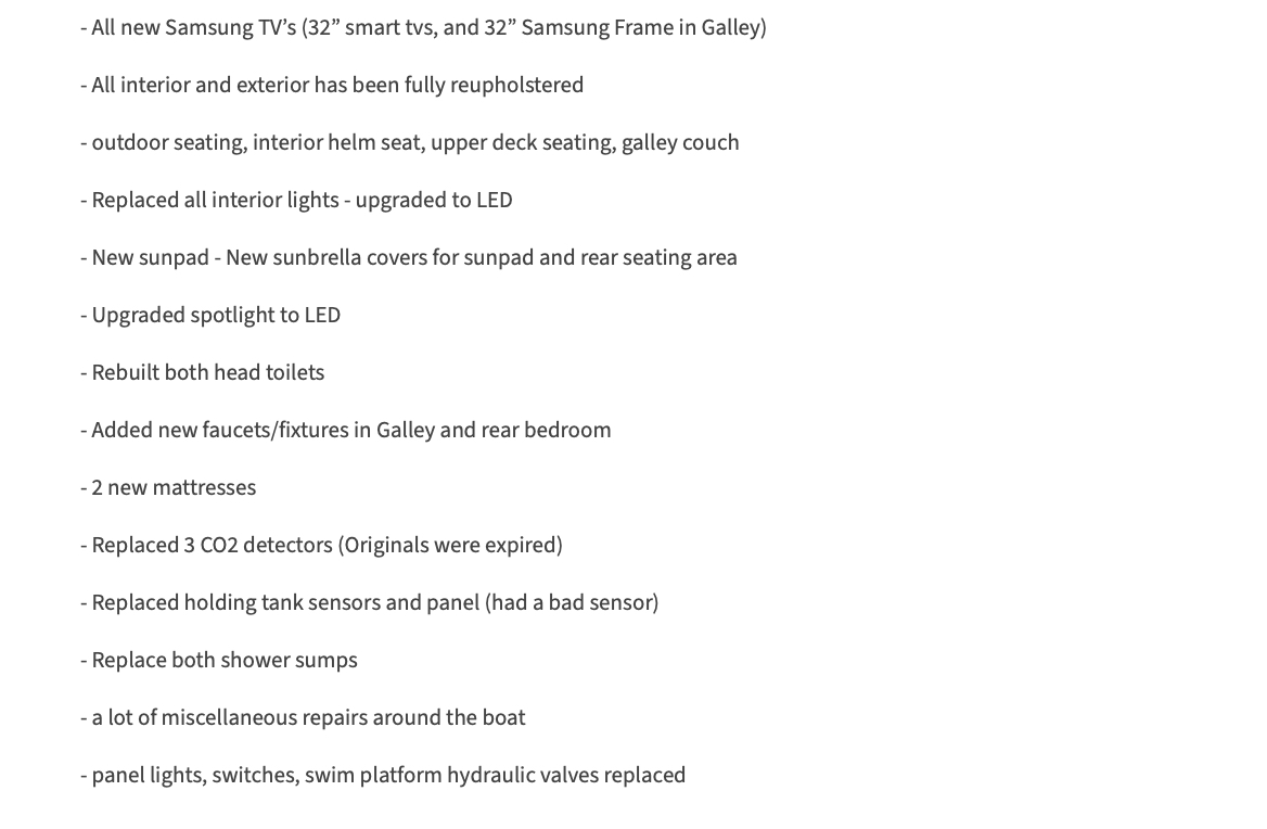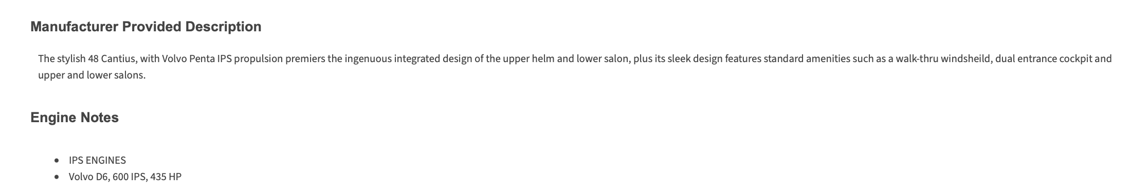Le bateau qui est présenté sur cette page, l’est uniquement à titre d'information et n'est pas nécessairement toujours disponible à la vente et/ou à la location. Ce bateau est peut-être offert sous réserve, il faut vérifier sa disponibilité. Ce document ou cette annonce n'est pas contractuel. Les informations sur les bateaux affichées dans les résultats ci-dessus sont présentées en toute bonne foi et, bien qu'elles soient considérées comme correctes, elles ne sont pas garanties. Ita Yachts Canada et/ou ProprioBateau ne garantit pas et n'assume aucune responsabilité légale ou responsabilité pour l'exactitude, l'exhaustivité ou l'utilité des informations et/ou des images affichées, car elles peuvent ne pas être à jour ou encore êtres des images d'un bateau comparable. Toutes les informations sur les bateaux peuvent être modifiées sans préavis et sont sans garantie. Ce bateau est peut-être offert par un autre courtier ouvert au co-courtage (co-brokerage).