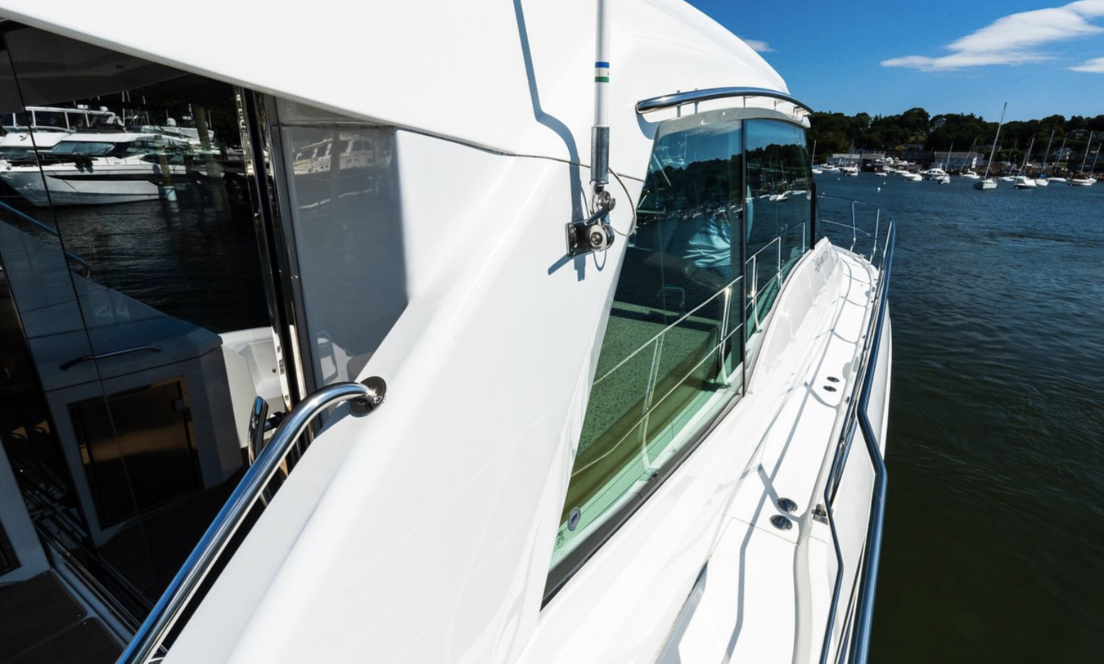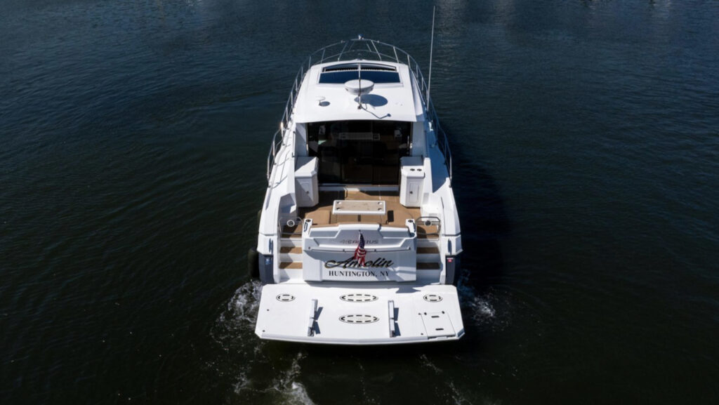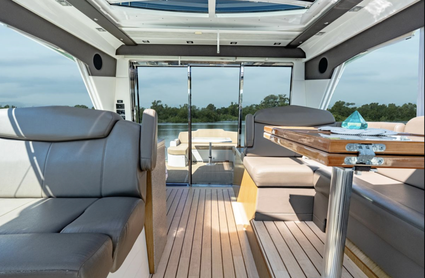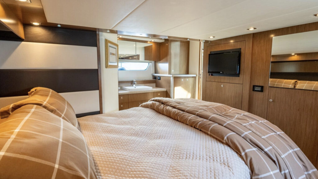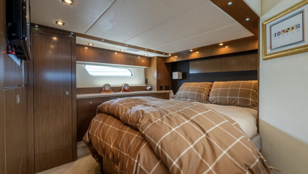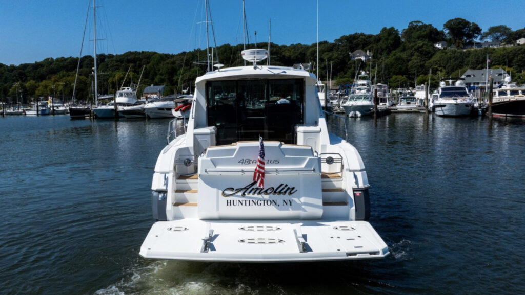 “Amolin” stands out as a prime example of the highly sought-after 48 Cantius model, featuring a distinctive wrapped hull over her original white, ensuring she catches every eye. She is fully equipped and ready for immediate cruising.