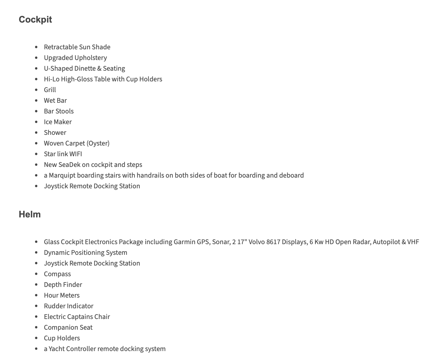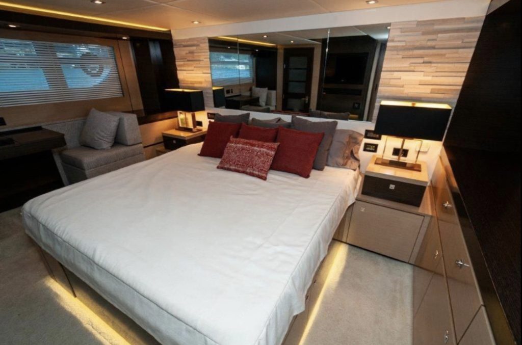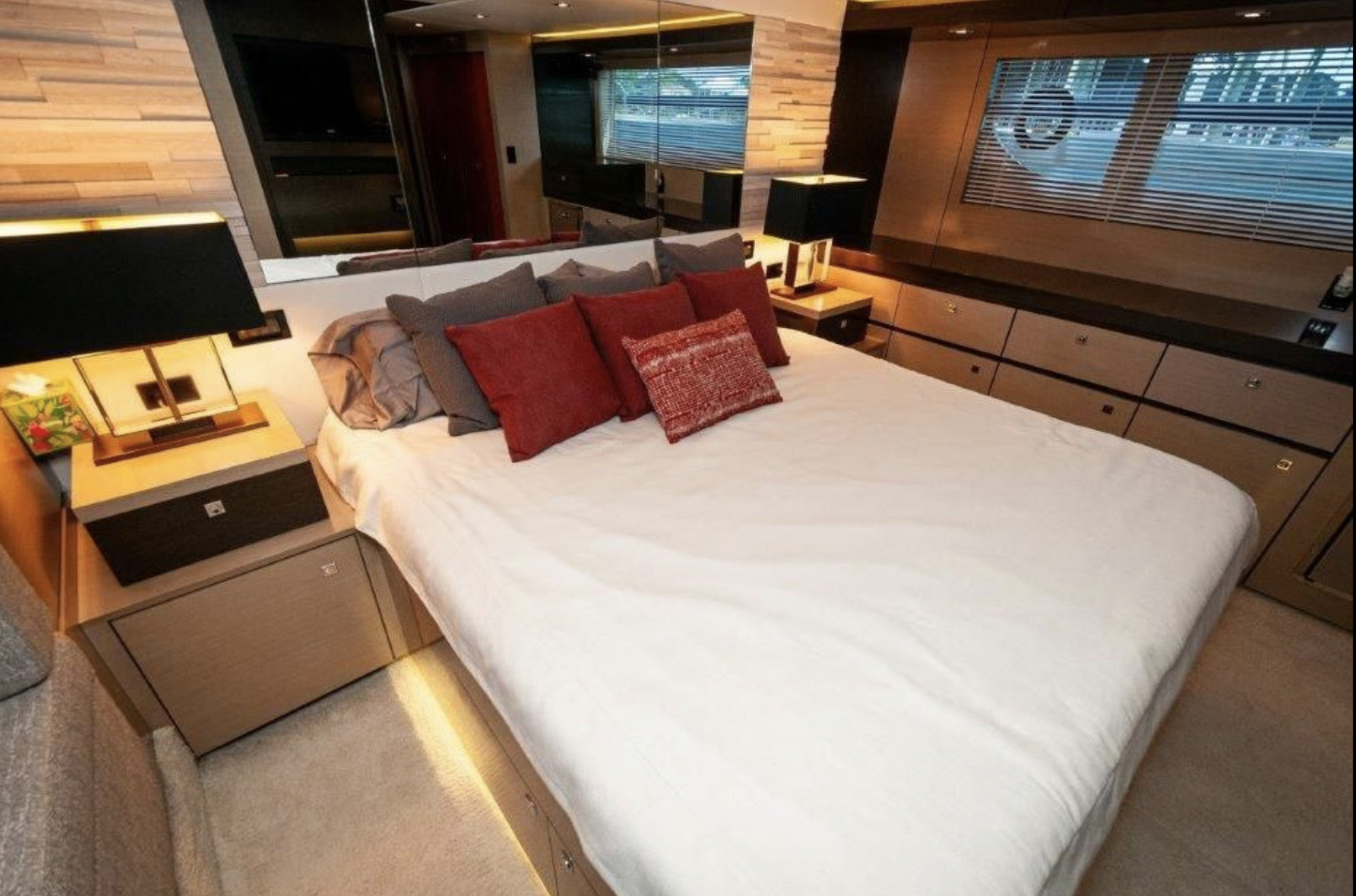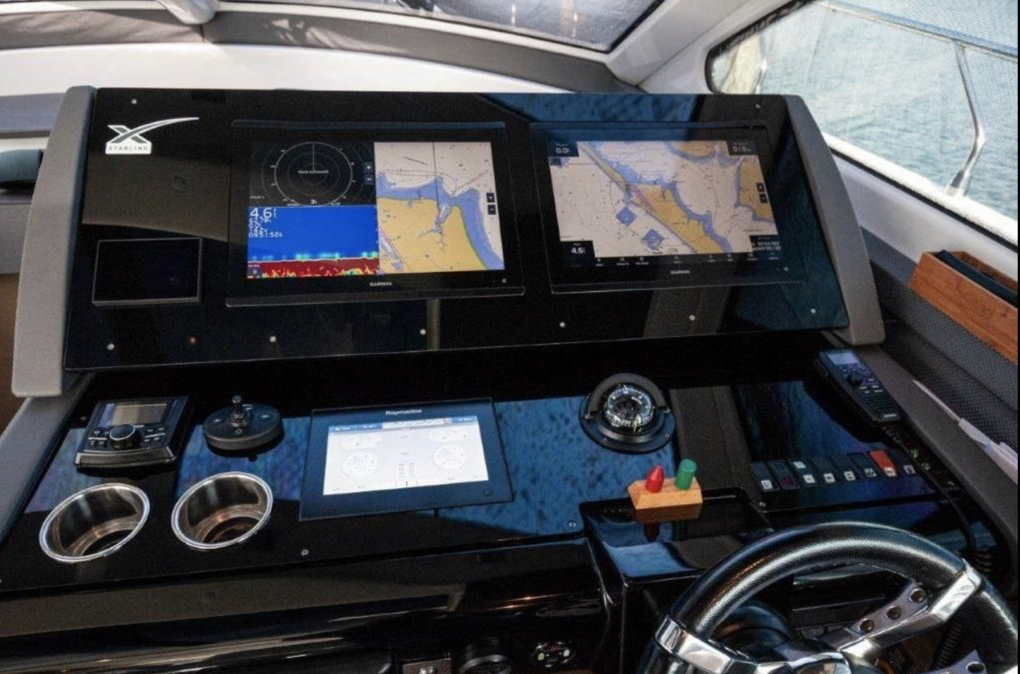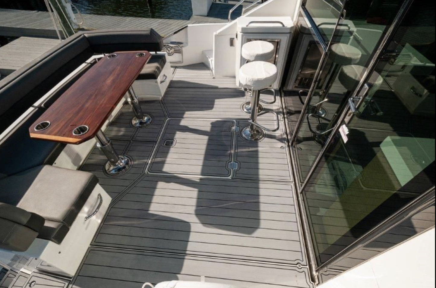 Powered by Volvo D11 IPS engines, “After Five” delivers strong performance along with joystick docking and Dynamic Positioning for stress-free handling. The glass cockpit features Garmin GPS and sonar, dual 17” Volvo displays, HD radar, autopilot, and VHF for confident navigation.