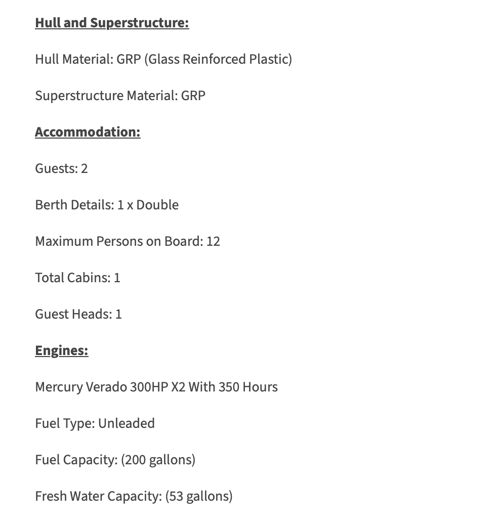 Le bateau qui est présenté sur cette page, l’est uniquement à titre d'information et n'est pas nécessairement toujours disponible à la vente et/ou à la location. Ce bateau est peut-être offert sous réserve, il faut vérifier sa disponibilité. Ce document ou cette annonce n'est pas contractuel. Les informations sur les bateaux affichées dans les résultats ci-dessus sont présentées en toute bonne foi et, bien qu'elles soient considérées comme correctes, elles ne sont pas garanties. Ita Yachts Canada et/ou ProprioBateau ne garantit pas et n'assume aucune responsabilité légale ou responsabilité pour l'exactitude, l'exhaustivité ou l'utilité des informations et/ou des images affichées, car elles peuvent ne pas être à jour ou encore êtres des images d'un bateau comparable. Toutes les informations sur les bateaux peuvent être modifiées sans préavis et sont sans garantie. Ce bateau est peut-être offert par un autre courtier ouvert au co-courtage (co-brokerage).