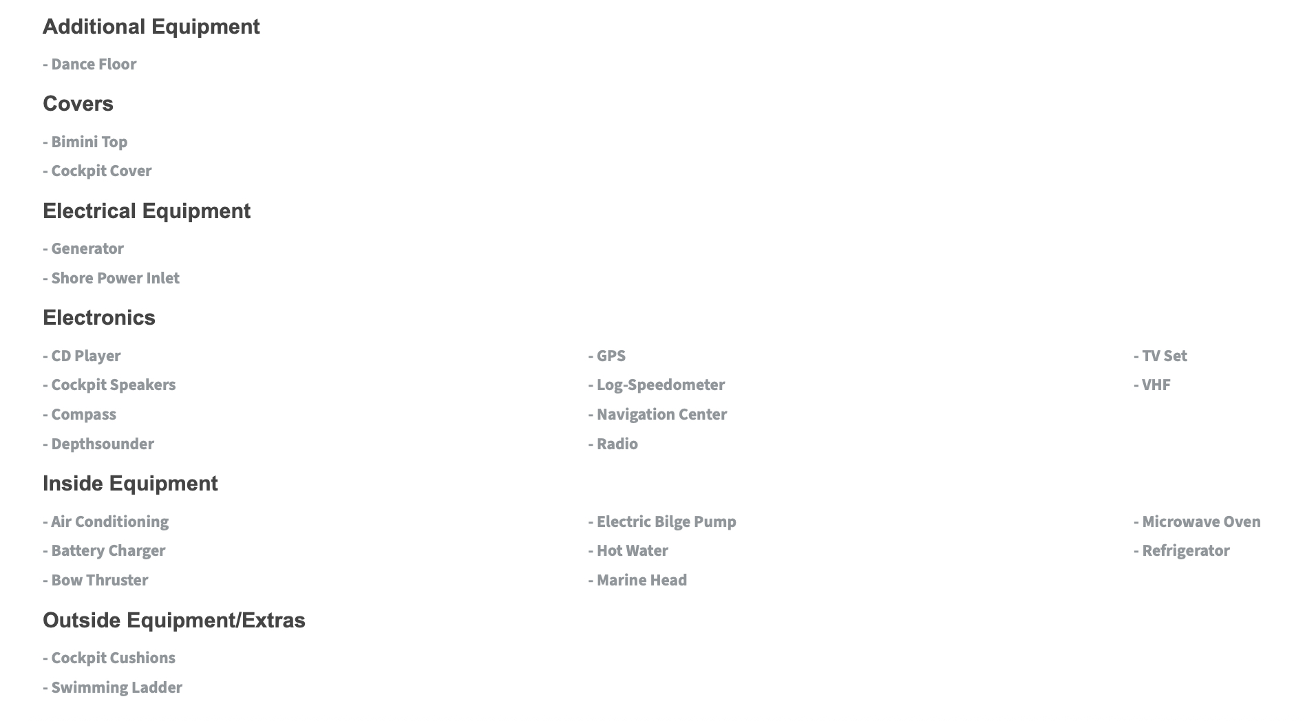 Le bateau qui est présenté sur cette page, l’est uniquement à titre d'information et n'est pas nécessairement toujours disponible à la vente et/ou à la location. Ce bateau est peut-être offert sous réserve, il faut vérifier sa disponibilité. Ce document ou cette annonce n'est pas contractuel. Les informations sur les bateaux affichées dans les résultats ci-dessus sont présentées en toute bonne foi et, bien qu'elles soient considérées comme correctes, elles ne sont pas garanties. Ita Yachts Canada et/ou ProprioBateau ne garantit pas et n'assume aucune responsabilité légale ou responsabilité pour l'exactitude, l'exhaustivité ou l'utilité des informations et/ou des images affichées, car elles peuvent ne pas être à jour ou encore êtres des images d'un bateau comparable. Toutes les informations sur les bateaux peuvent être modifiées sans préavis et sont sans garantie. Ce bateau est peut-être offert par un autre courtier ouvert au co-courtage (co-brokerage).