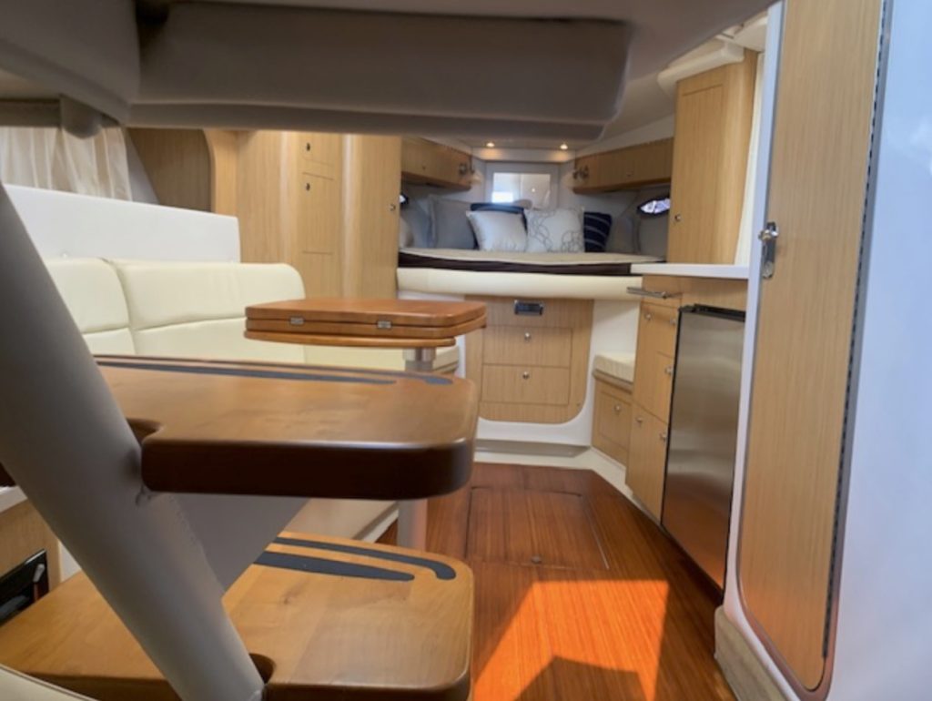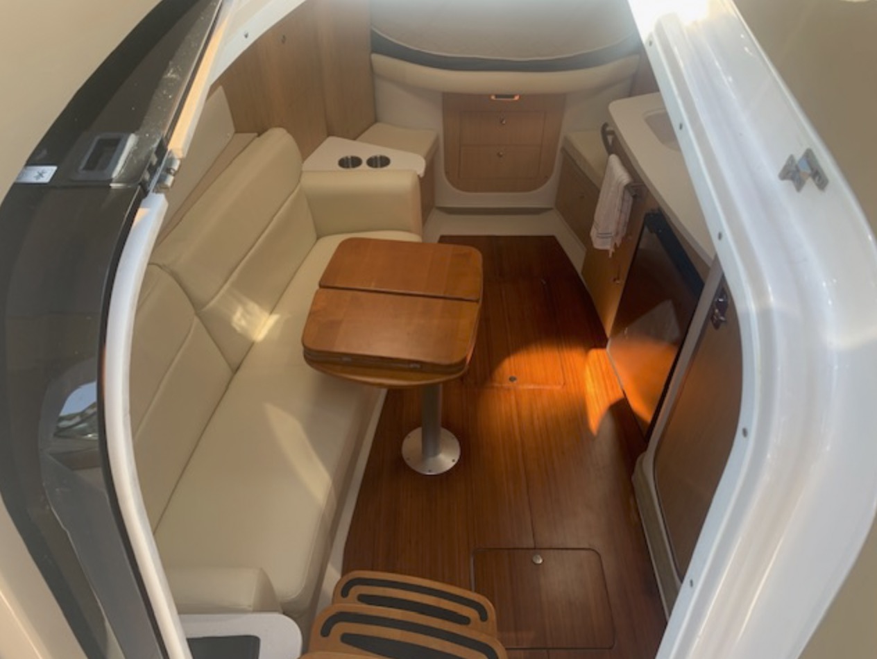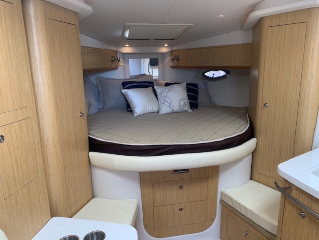 Her space-efficient cockpit, with U-shaped rear lounge, full-service wet bar, portside lounge, and double-wide helm can seat a small crowd. Below decks, the accommodations are as good as it gets in a boat this size. Interior highlights include high-gloss cherry cabinets, 20-inch flat-screen TV, teak and holly galley sole, faux granite counters, and leather upholstery.