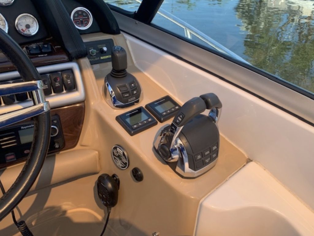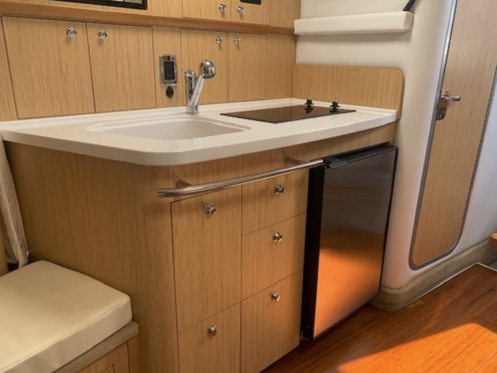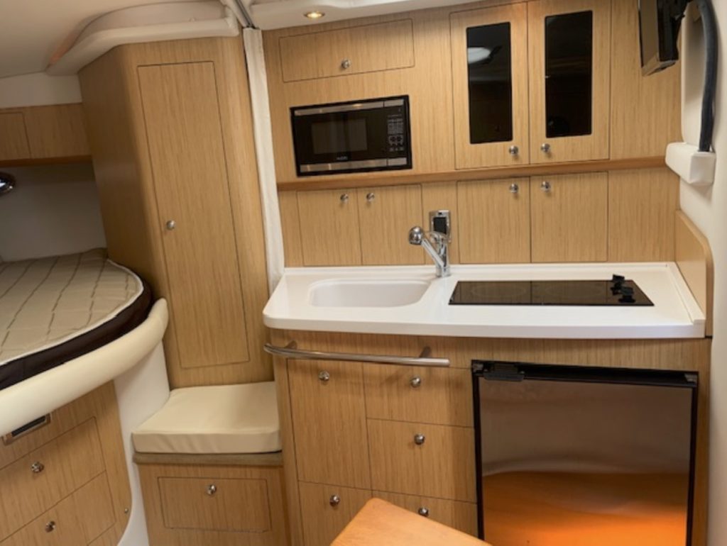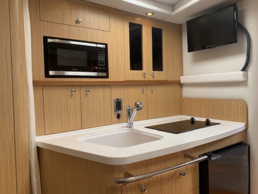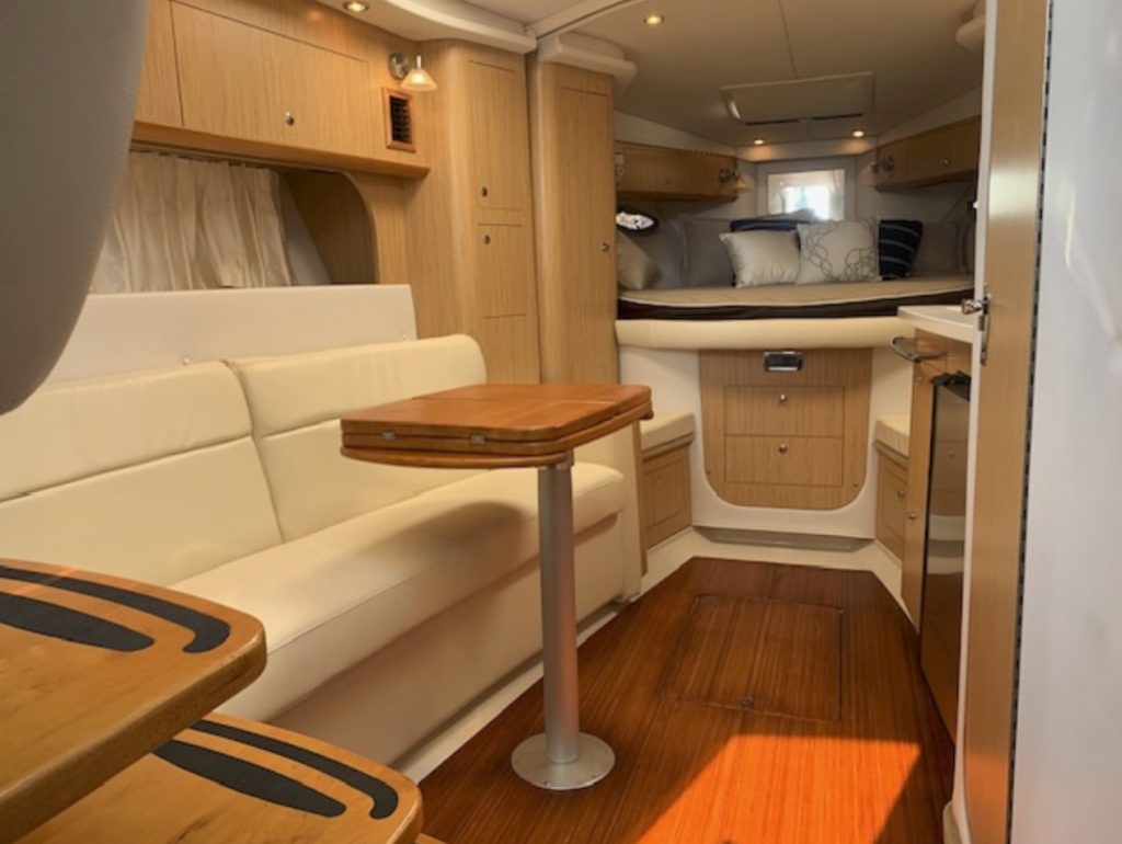 Her space-efficient cockpit, with U-shaped rear lounge, full-service wet bar, portside lounge, and double-wide helm can seat a small crowd. Below decks, the accommodations are as good as it gets in a boat this size. Interior highlights include high-gloss cherry cabinets, 20-inch flat-screen TV, teak and holly galley sole, faux granite counters, and leather upholstery.