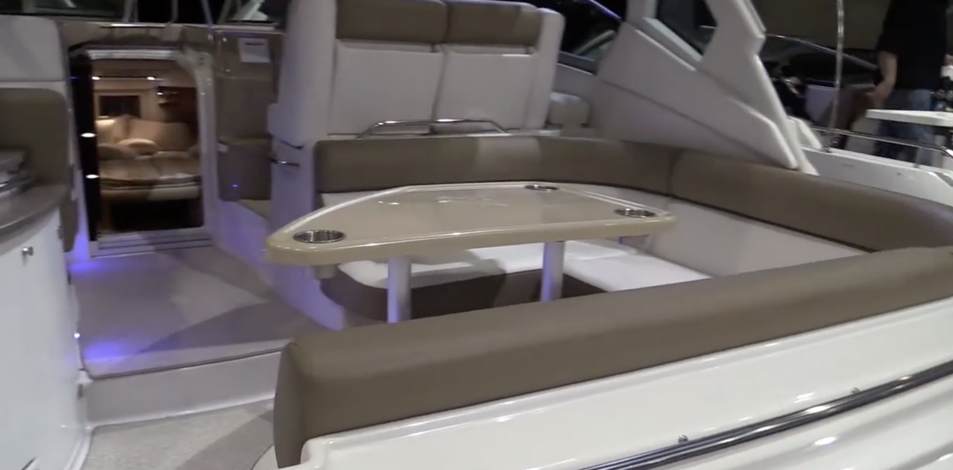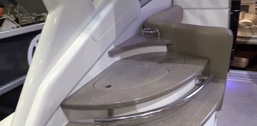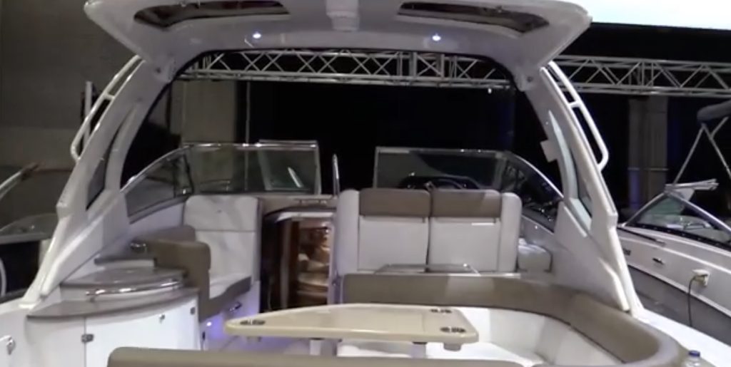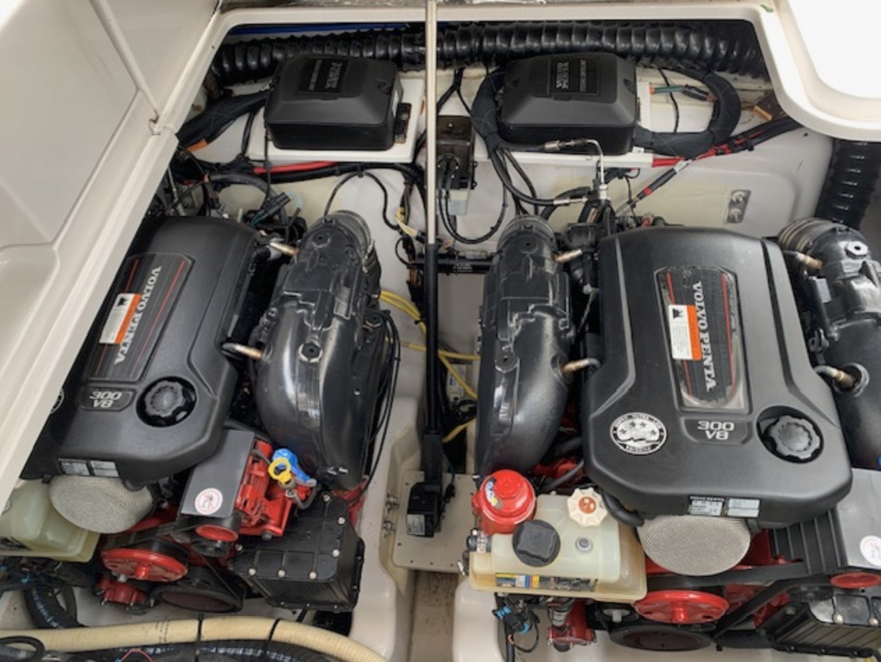 Bow access is via both side decks—which are very narrow—and a walk-through windshield. The fold-down, aft-facing swim platform seat in a nice touch. Engine access is a tight fit. Volvo V8-300 hp gas I/Os reach nearly 40 knots top.