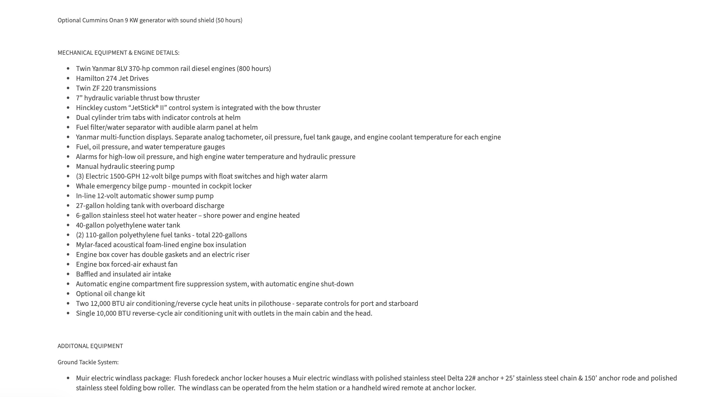 Always maintained by Hinckley in our YachtCare program and optioned to perfection with Air Conditioning for the cabin and pilothouse, 9kW generator (50 hours!), Yanmar 8LV 370 engines, centerline Queen berth, Garmin electronics, underwater lights, teak decks, sideliners, & handrails, and a pilothouse table.