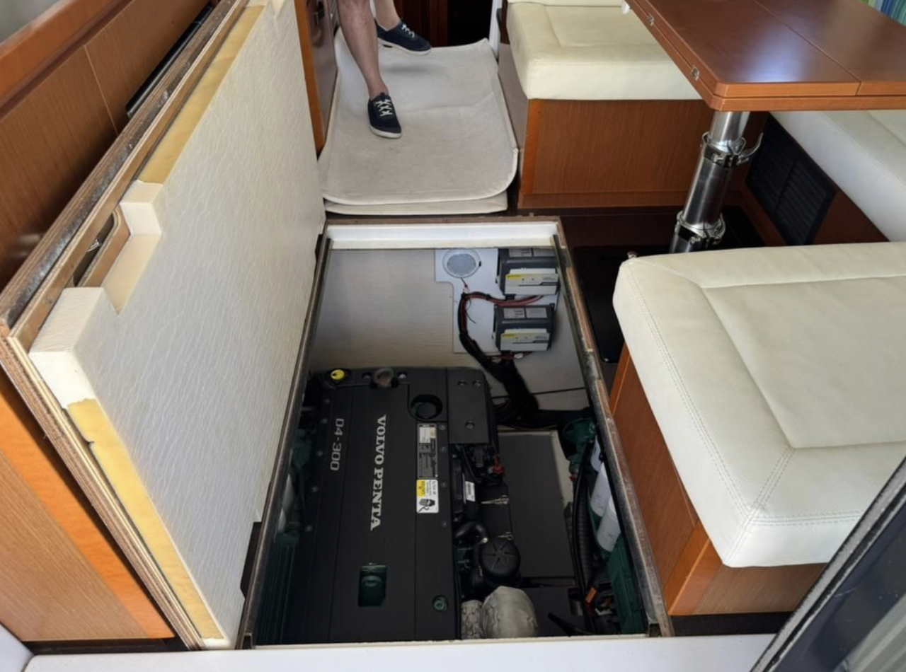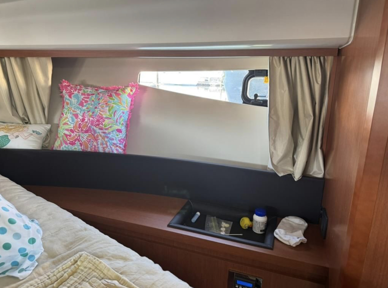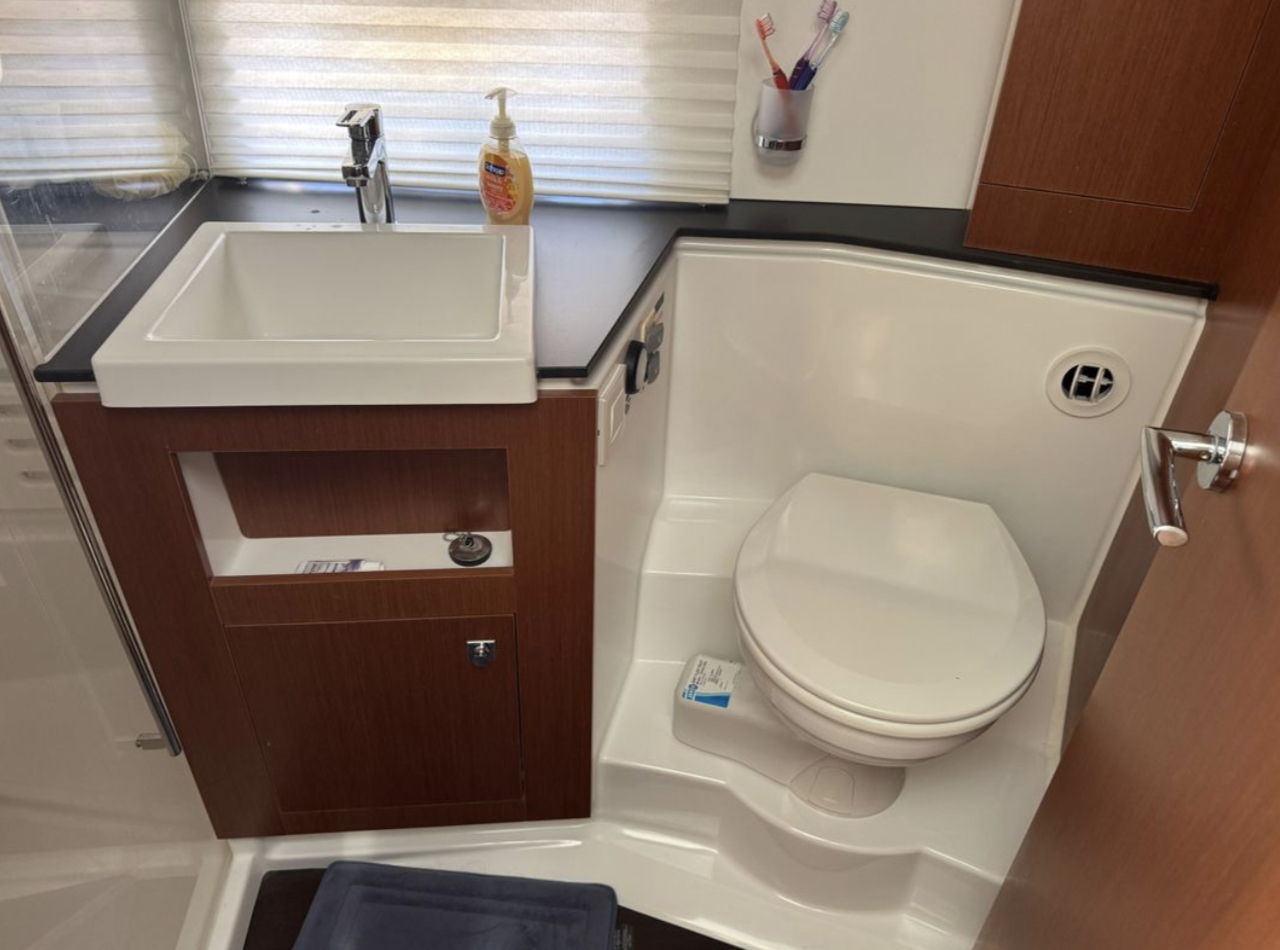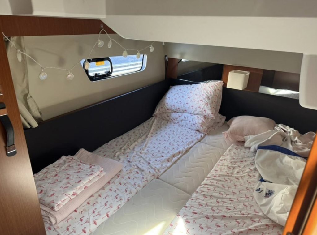Below decks, two private cabins accommodate up to four guests: a spacious forward owner’s suite and a versatile twin/double guest cabin. The saloon table drops to form an additional berth. The single head includes a separate shower. Ventilation, daylight, entertainment systems, and storage are all well considered .