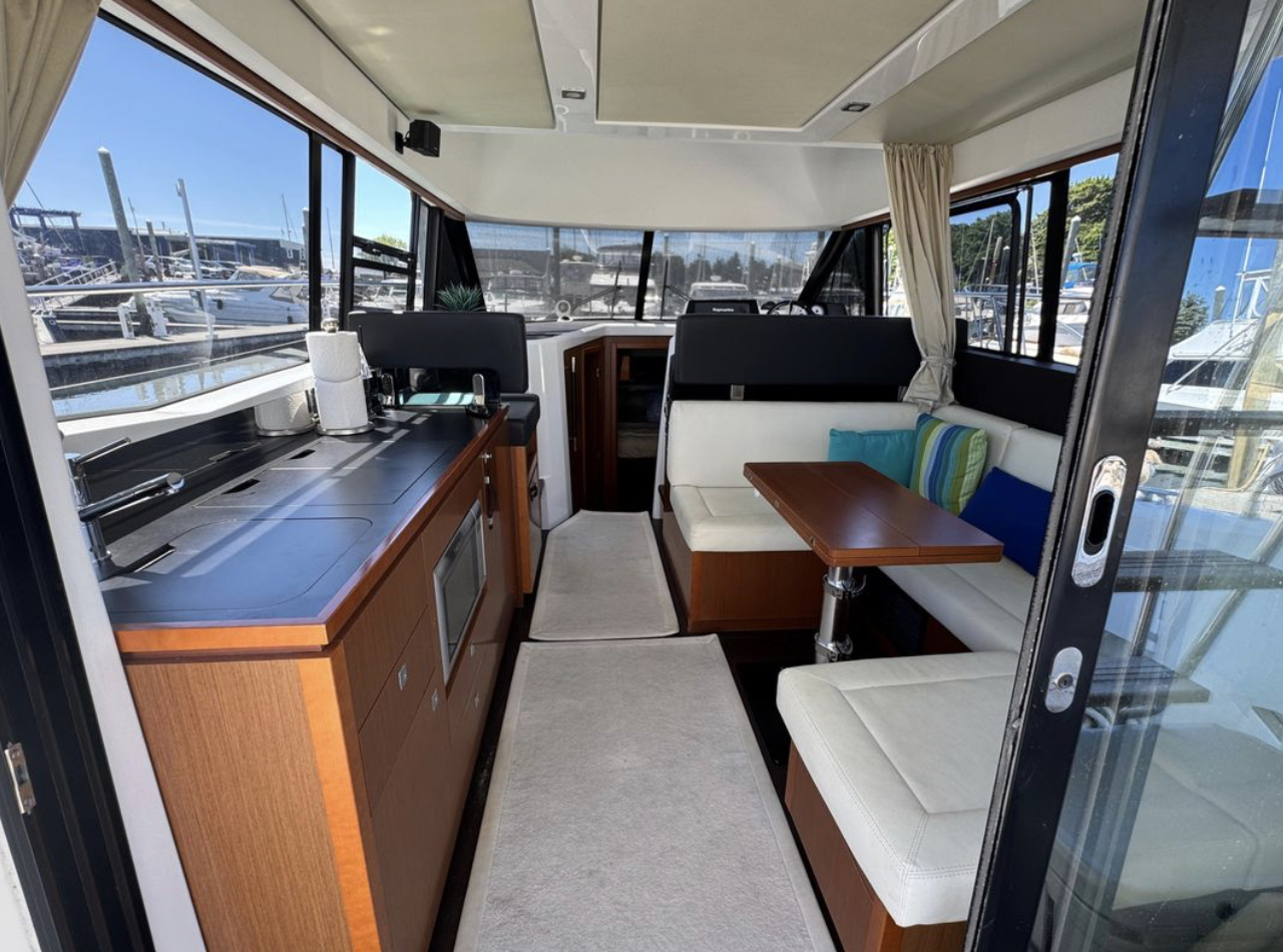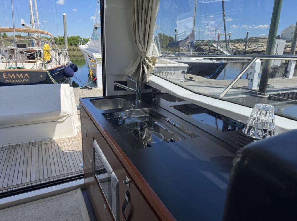 From the exterior decks through the interior, the design emphasizes openness and light. Glass doors, sweeping windows, and the layout strategy blur the line between cockpit and salon, offering panoramic 360° views . The aft cockpit, sheltered under the flybridge overhang, connects seamlessly to the galley‑aft layout to starboard—ideal for social dining and entertaining .