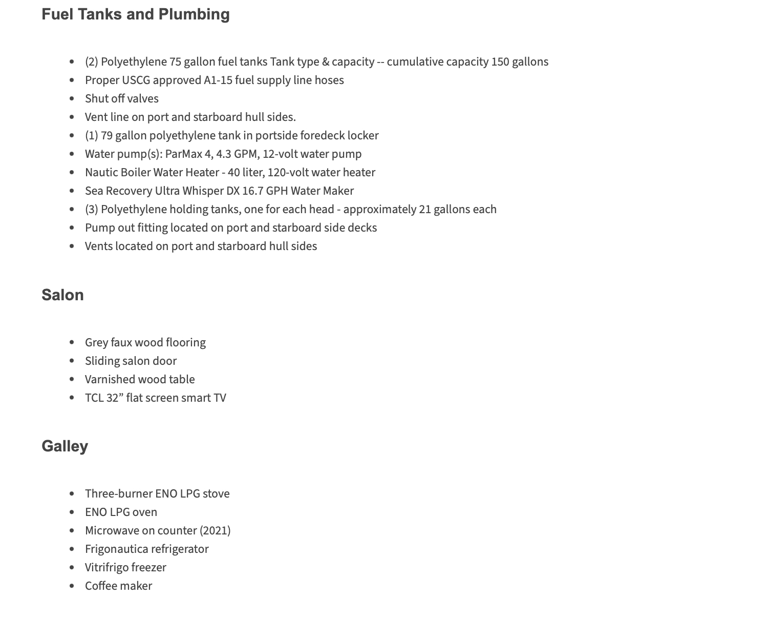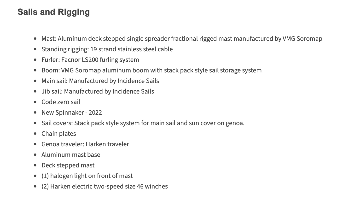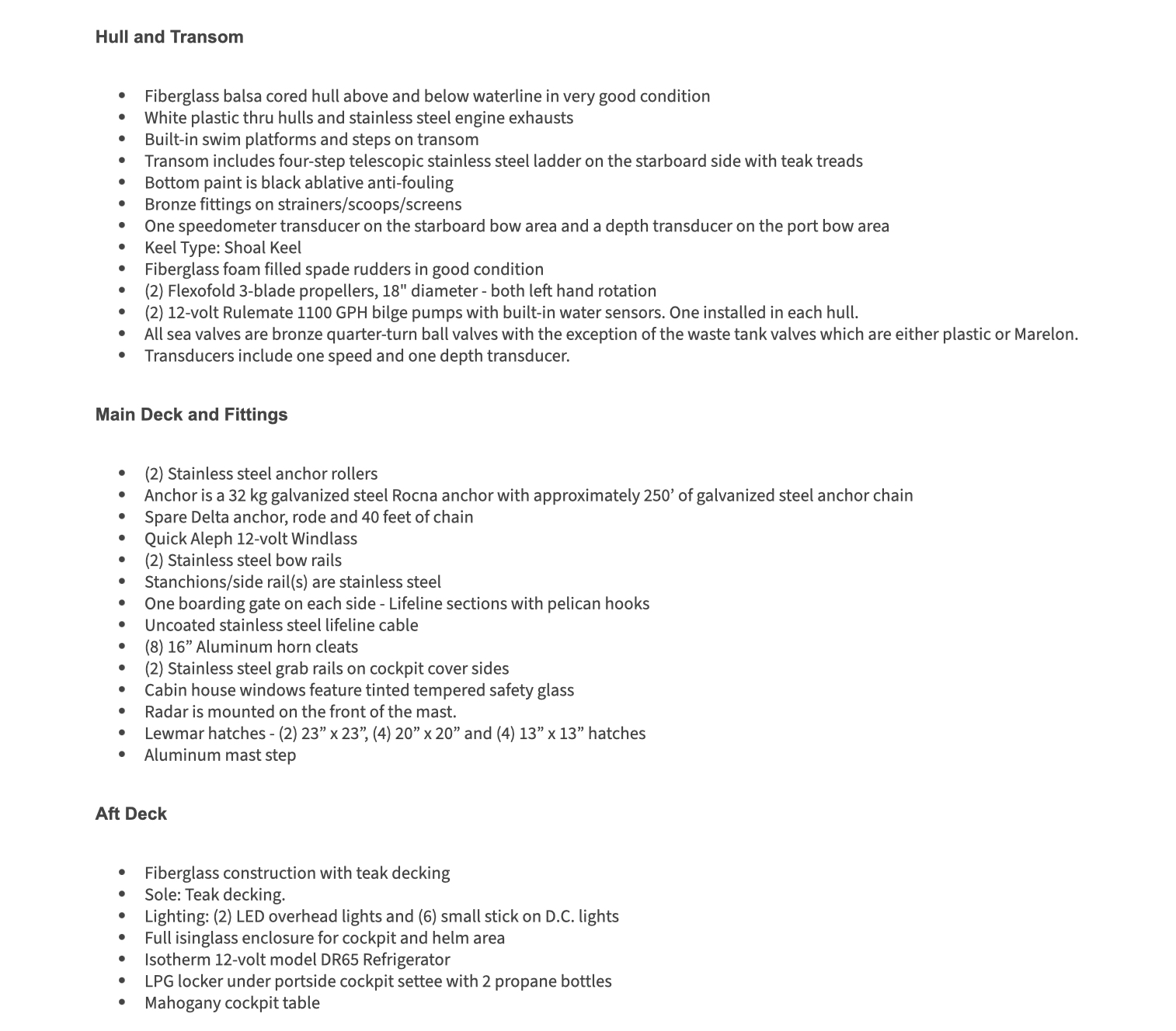 Neptune’s Waters is equipped with deck-stepped fractional rigged mast and wire rigging, and is powered by a pair of 4-cylinder Yanmar diesel engines with Yanmar saildrives. She features a three stateroom and three head layout with a large salon and spacious cockpit.