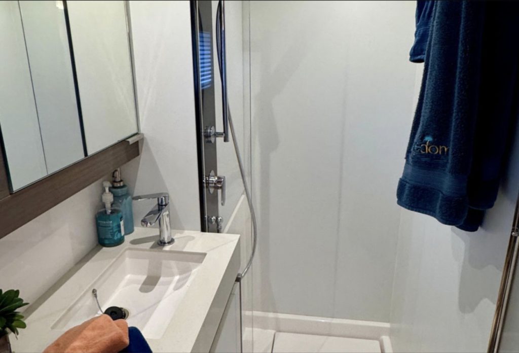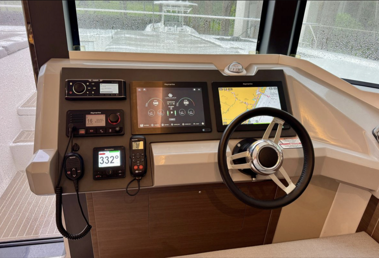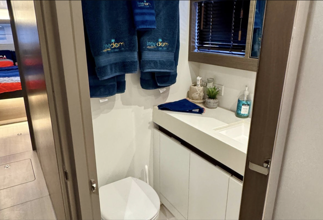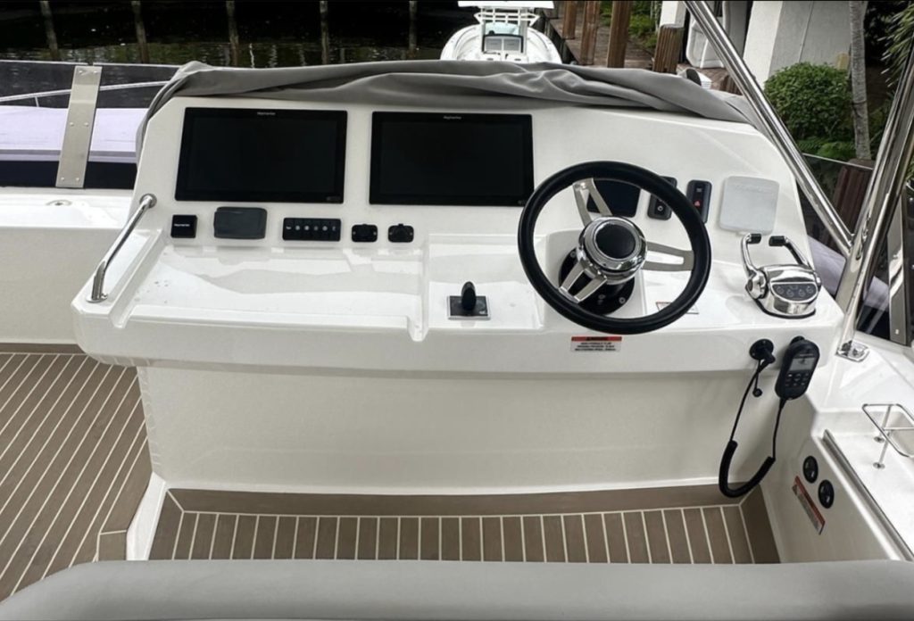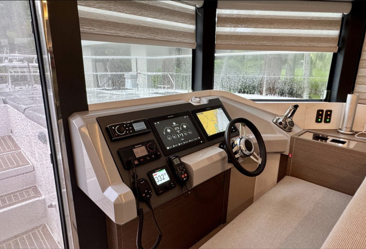 Equipped from the factory for serious cruising, Freedom features upgraded 12kW shore power, a convenient washer/dryer, a Spectra Newport watermaker, powerful Frigomar 70,000 BTU Air Conditioning, a reliable Northern Lights generator, and a comprehensive suite of Raymarine Electronics at both helm stations.