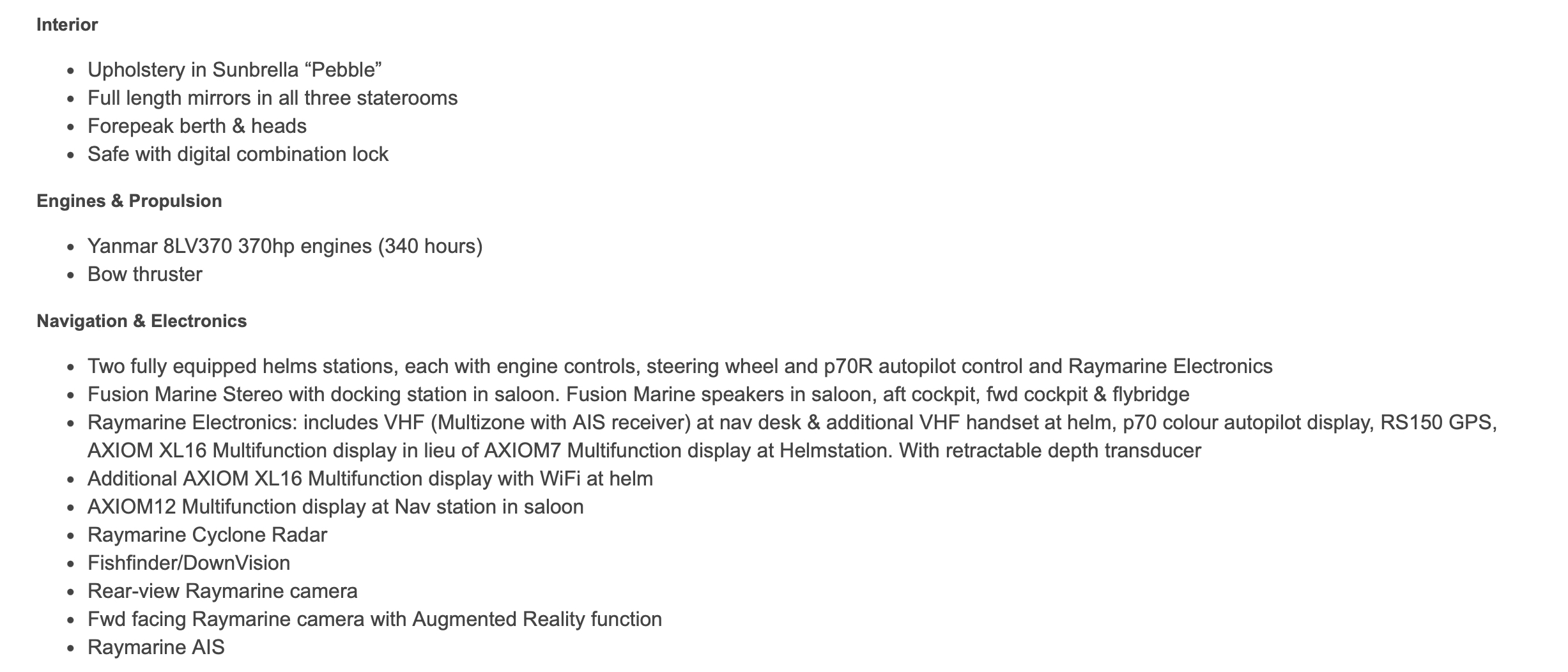 Le bateau qui est présenté sur cette page, l’est uniquement à titre d'information et n'est pas nécessairement toujours disponible à la vente et/ou à la location. Ce bateau est peut-être offert sous réserve, il faut vérifier sa disponibilité. Ce document ou cette annonce n'est pas contractuel. Les informations sur les bateaux affichées dans les résultats ci-dessus sont présentées en toute bonne foi et, bien qu'elles soient considérées comme correctes, elles ne sont pas garanties. Ita Yachts Canada et/ou ProprioBateau ne garantit pas et n'assume aucune responsabilité légale ou responsabilité pour l'exactitude, l'exhaustivité ou l'utilité des informations et/ou des images affichées, car elles peuvent ne pas être à jour ou encore êtres des images d'un bateau comparable. Toutes les informations sur les bateaux peuvent être modifiées sans préavis et sont sans garantie. Ce bateau est peut-être offert par un autre courtier ouvert au co-courtage (co-brokerage).