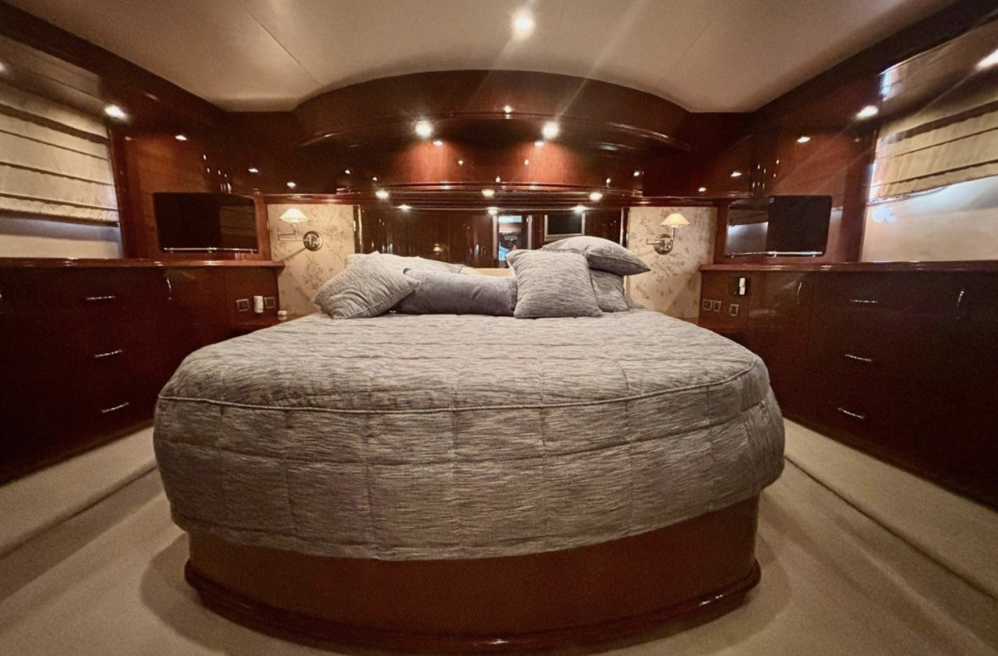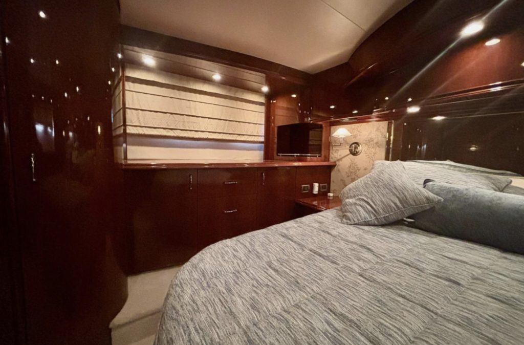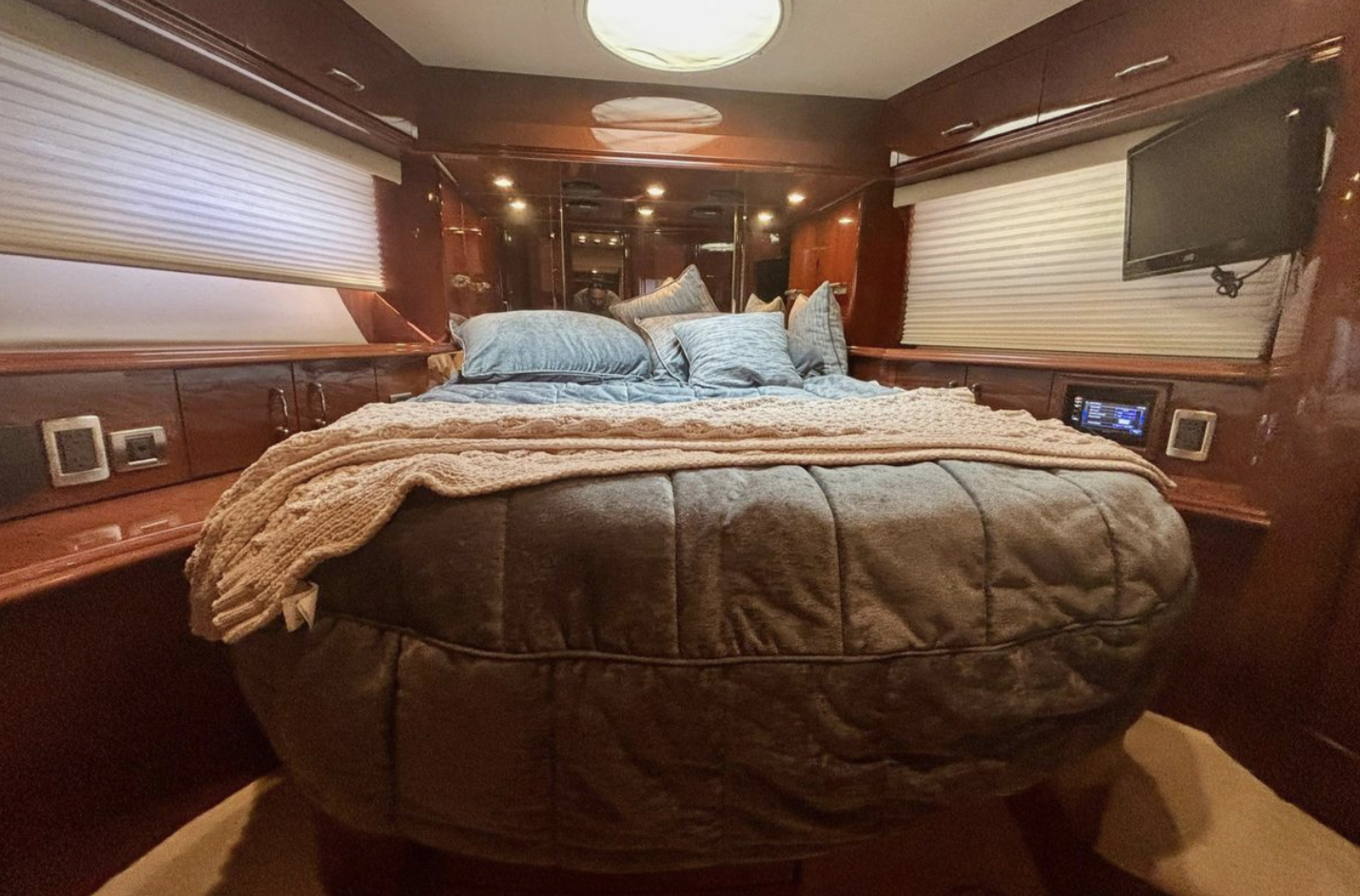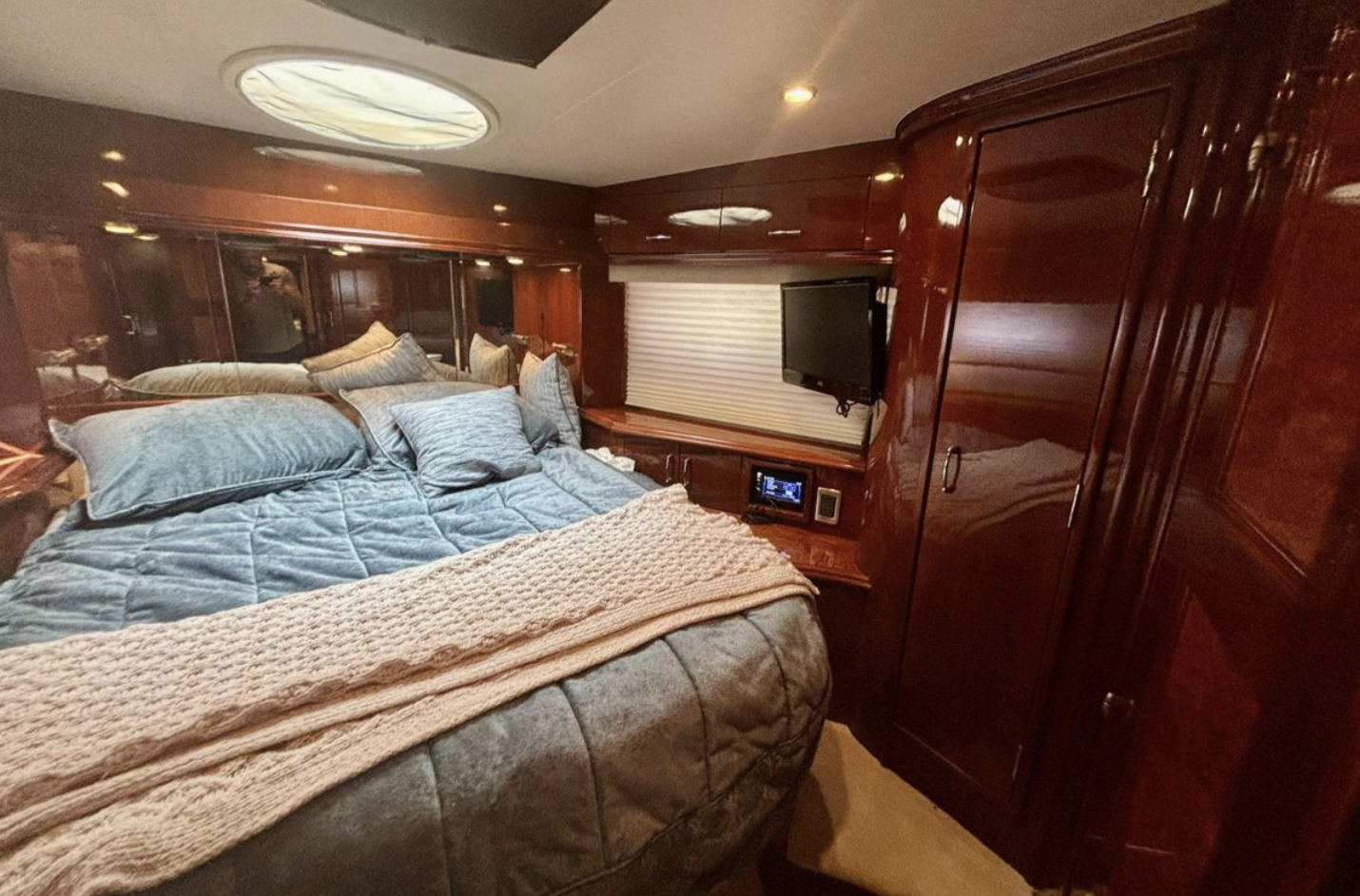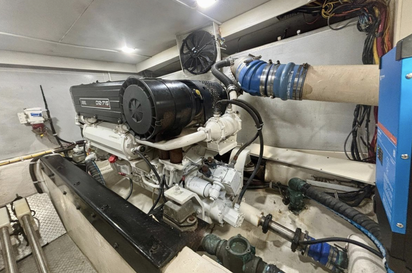 The yacht offers ample space with a full-beam master suite, additional guest cabins, salon, and flybridge. It is equipped with twin Volvo D12 engines for dependable performance.