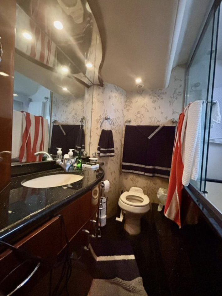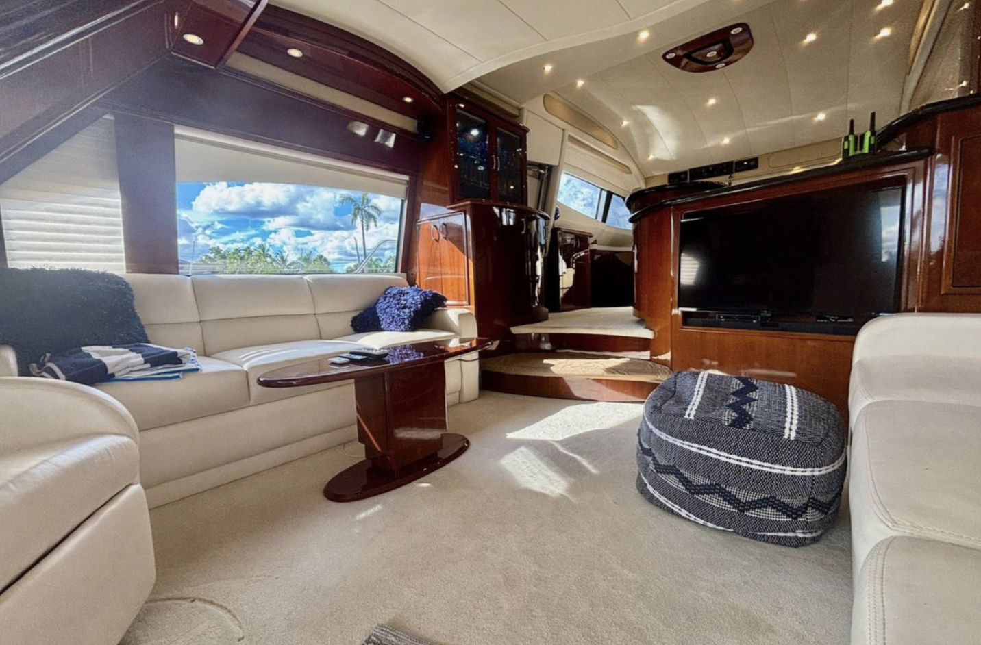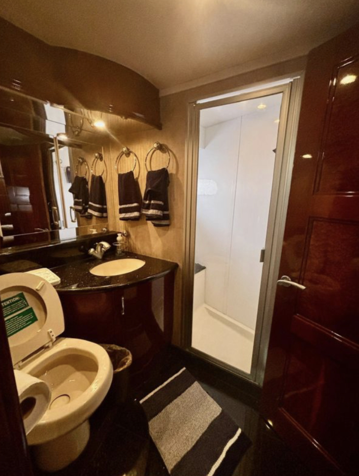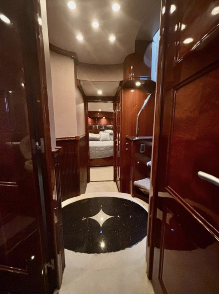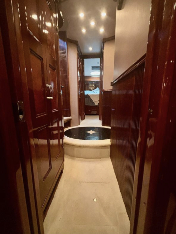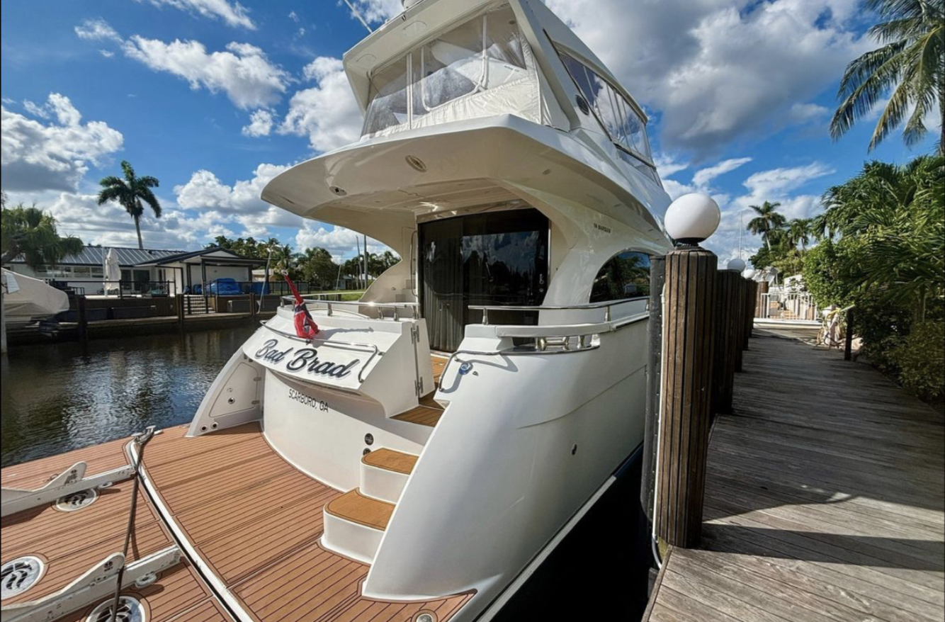 The yacht offers ample space with a full-beam master suite, additional guest cabins, salon, and flybridge. It is equipped with twin Volvo D12 engines for dependable performance.