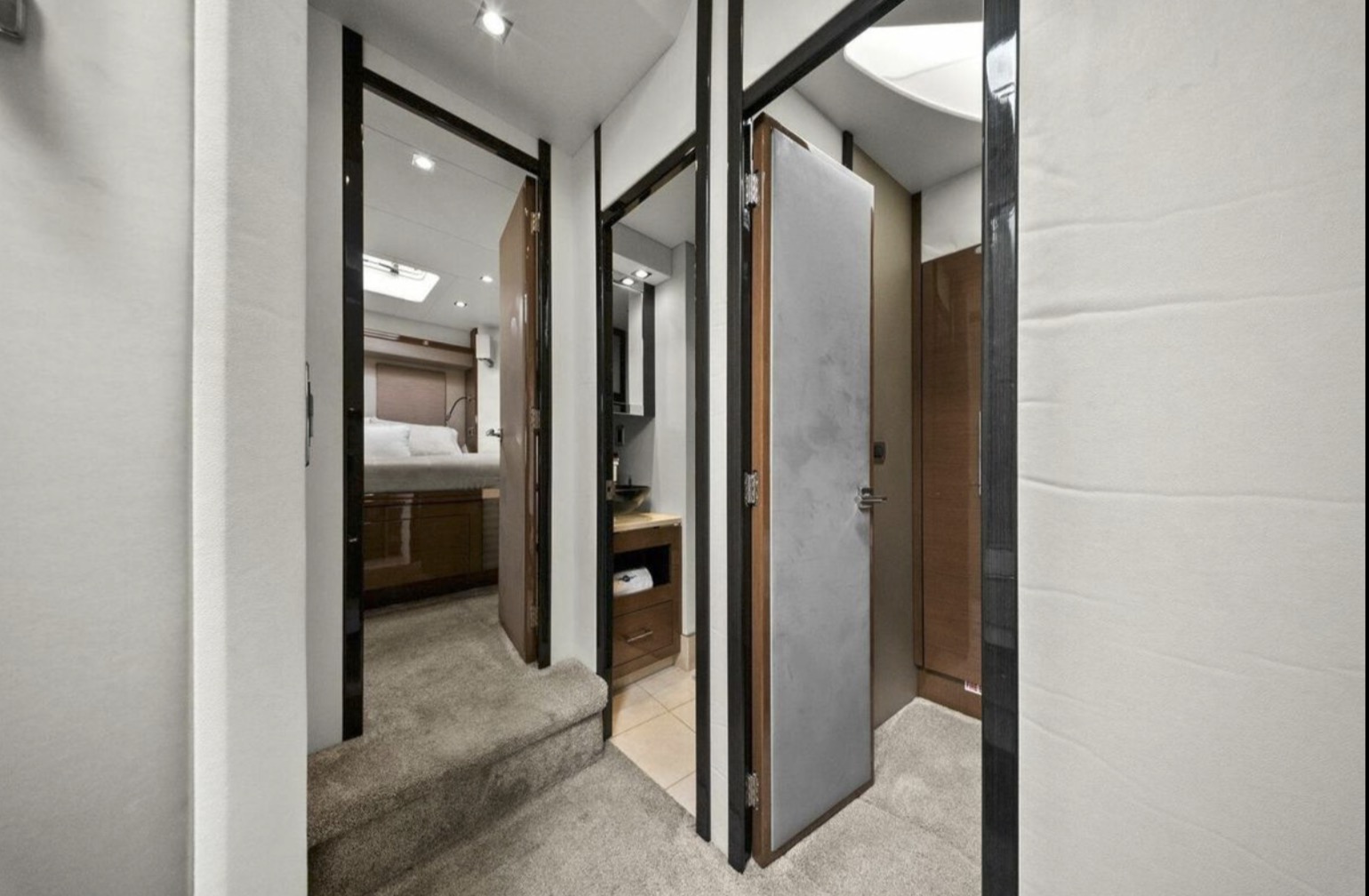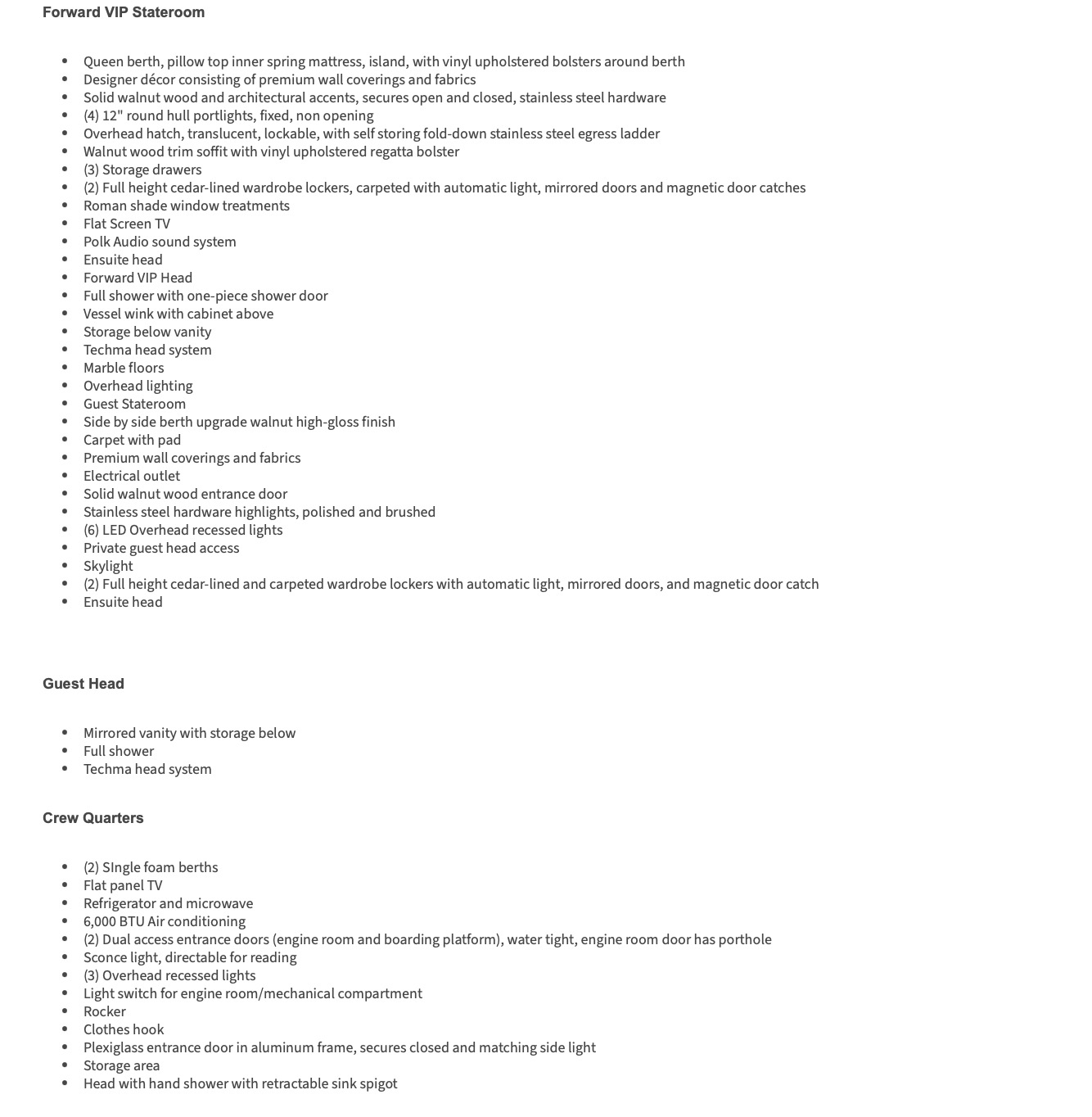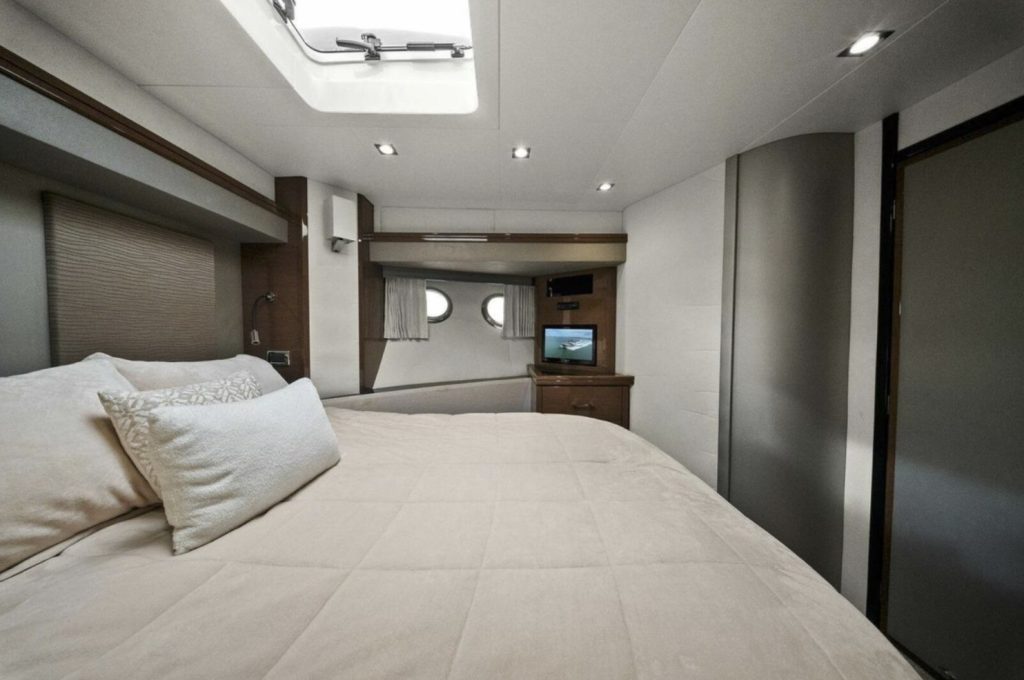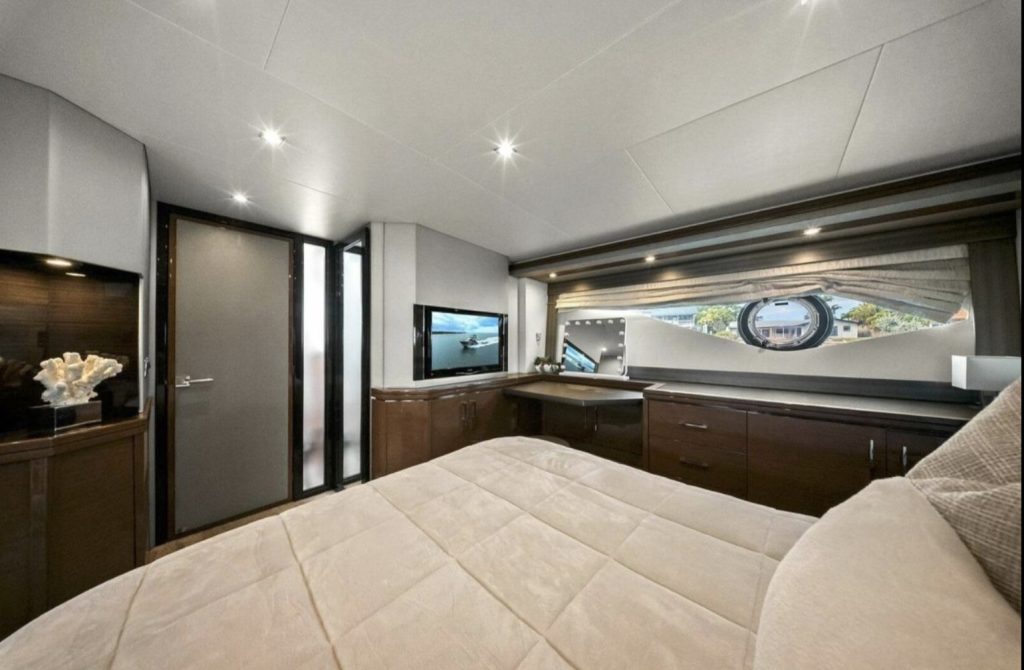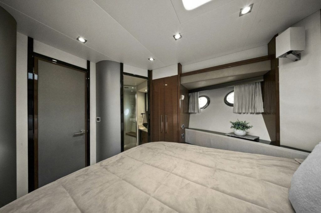 Below deck, the yacht offers a well-appointed three- or four-stateroom configuration (layout dependent), highlighted by a full-beam master suite with private en-suite head, ample storage, and elegant woodwork. Guest accommodations are comfortably arranged to provide privacy and livability for family and friends.