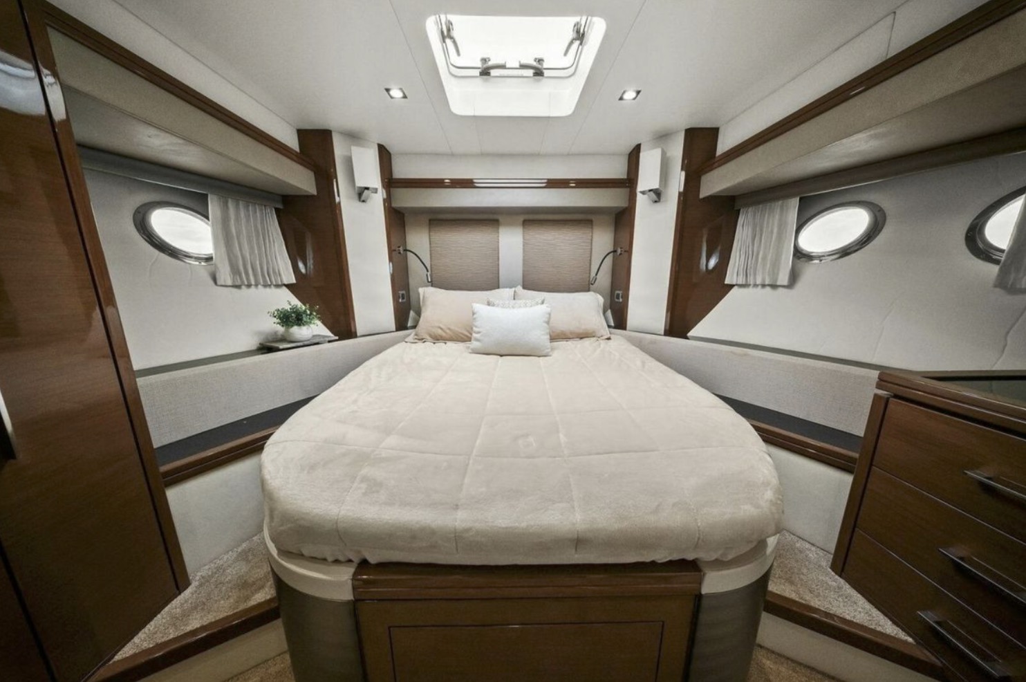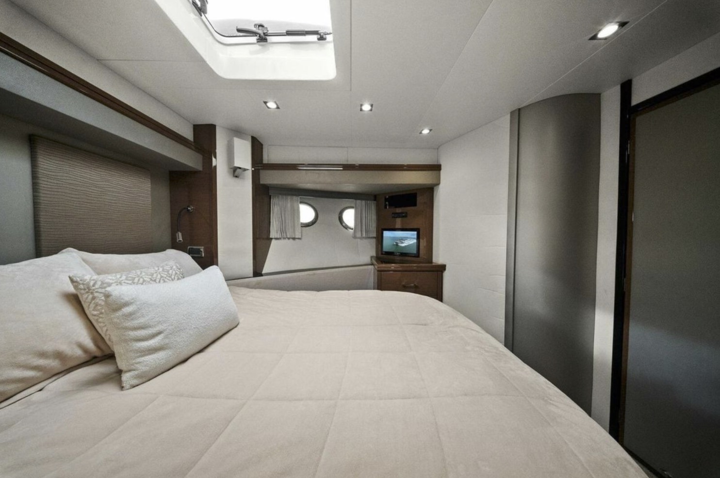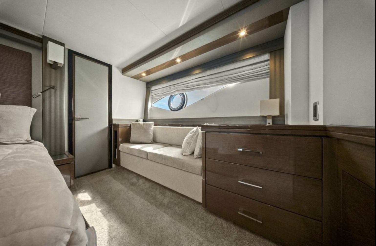 Below deck, the yacht offers a well-appointed three- or four-stateroom configuration (layout dependent), highlighted by a full-beam master suite with private en-suite head, ample storage, and elegant woodwork. Guest accommodations are comfortably arranged to provide privacy and livability for family and friends.