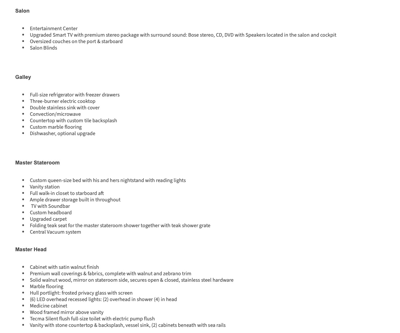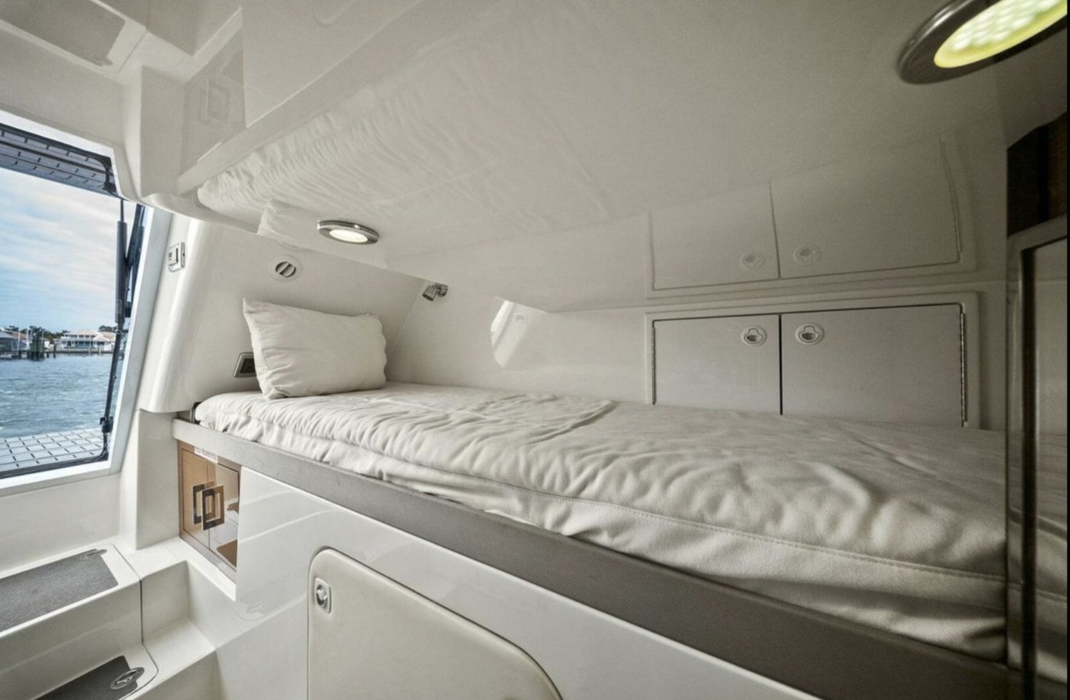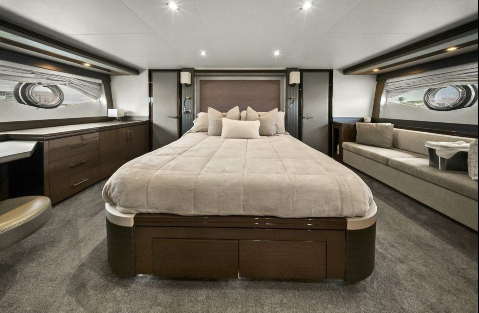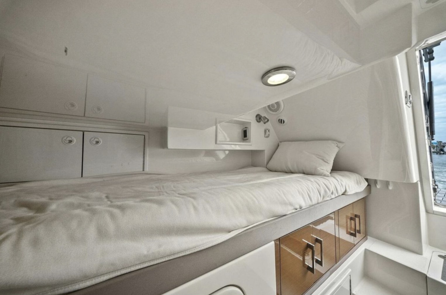 Below deck, the yacht offers a well-appointed three- or four-stateroom configuration (layout dependent), highlighted by a full-beam master suite with private en-suite head, ample storage, and elegant woodwork. Guest accommodations are comfortably arranged to provide privacy and livability for family and friends.
