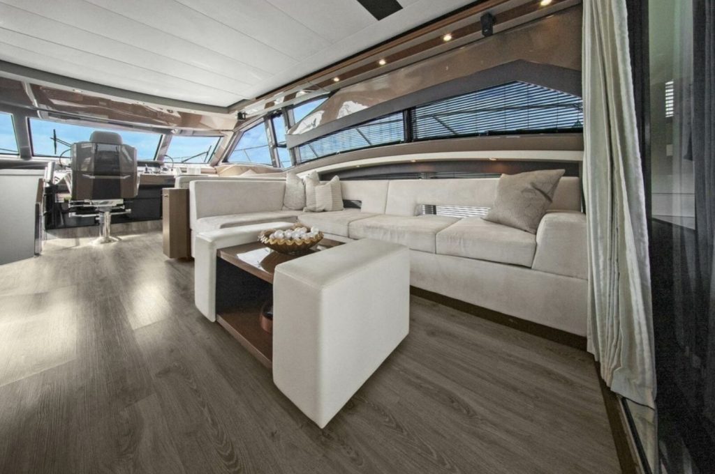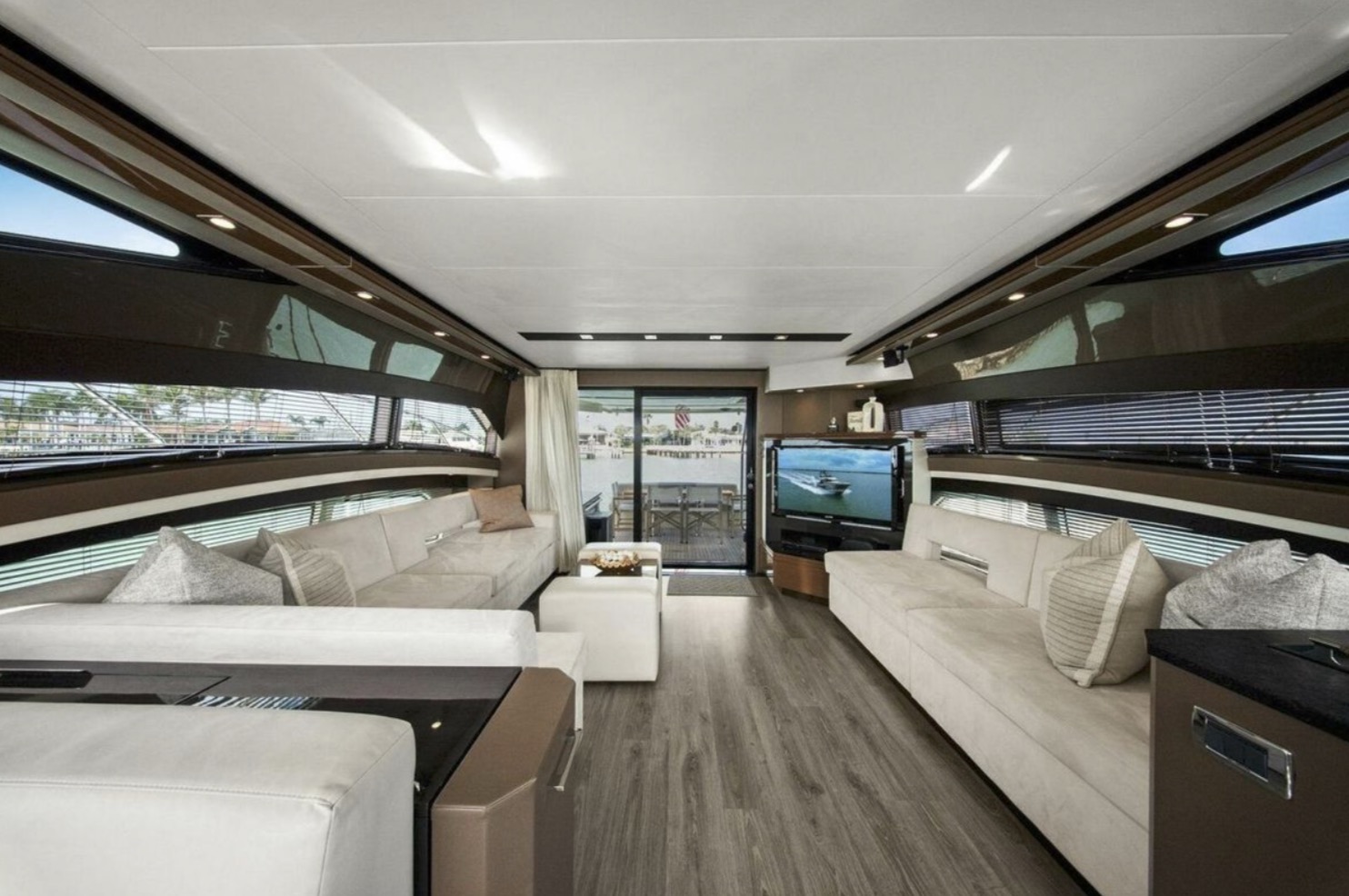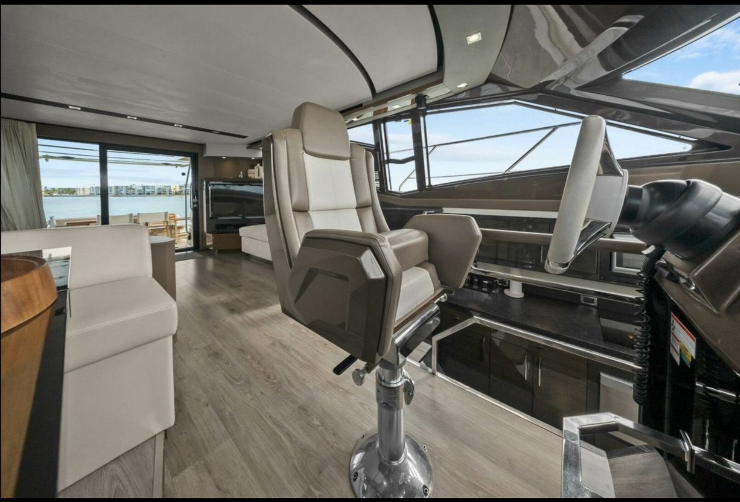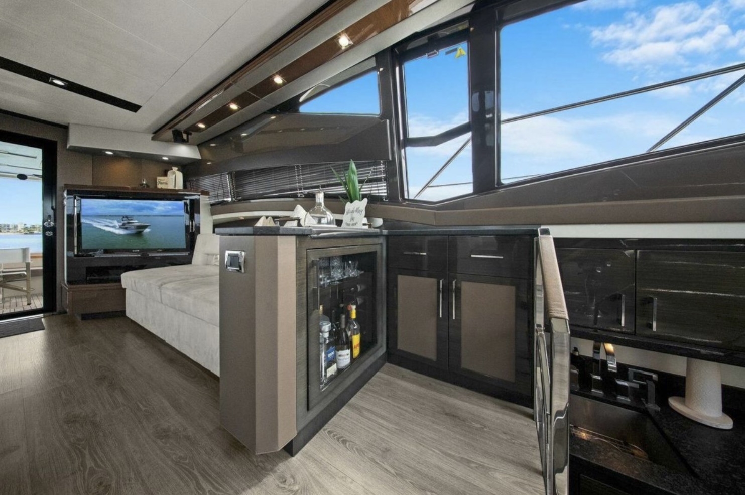 The main salon is bright and open, featuring panoramic windows, high-gloss cabinetry, premium stone surfaces, and generous seating ideal for entertaining or extended cruising. The galley is thoughtfully integrated into the main deck layout, providing functionality without compromising flow.