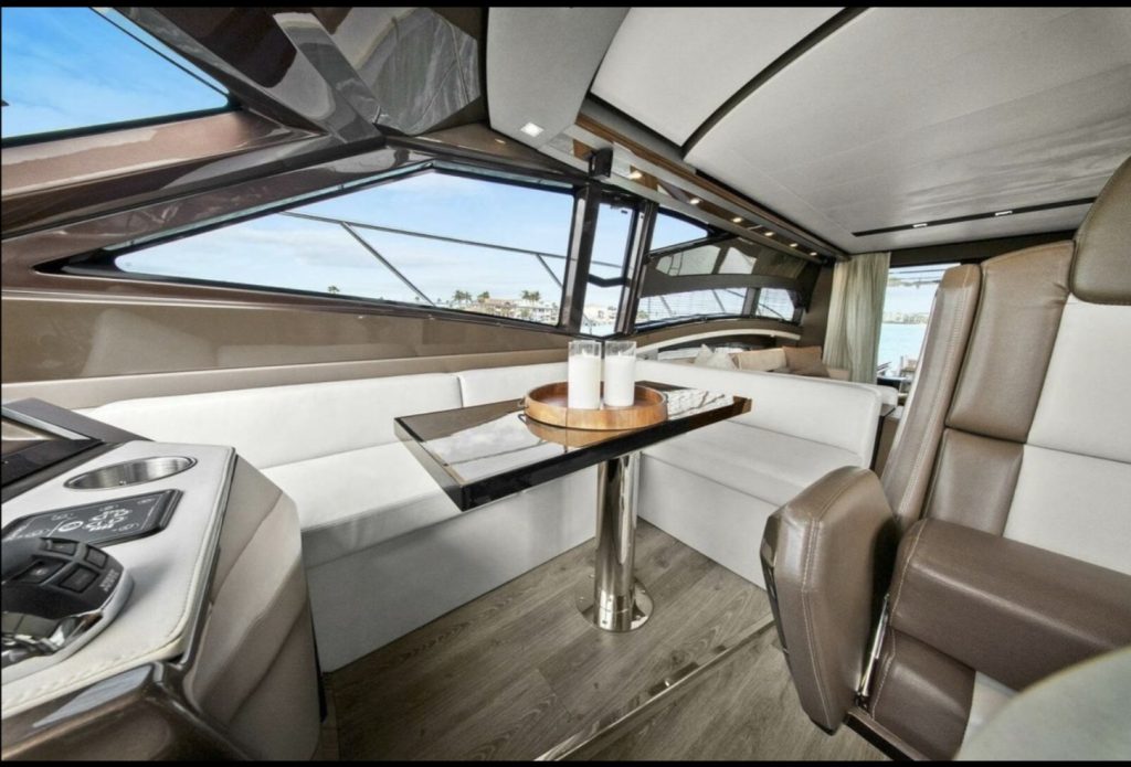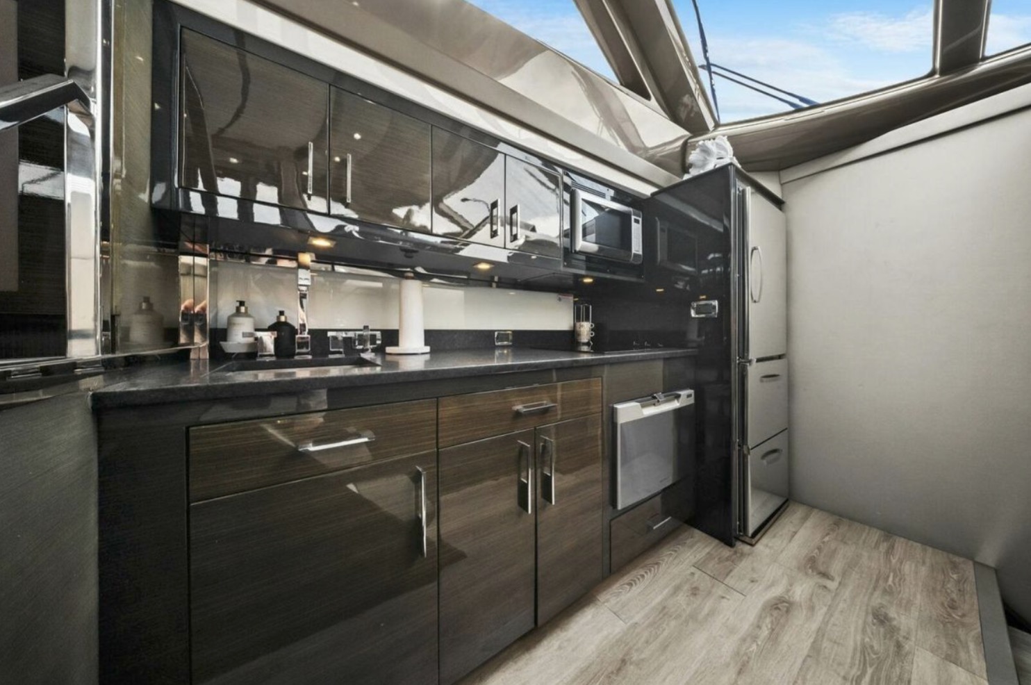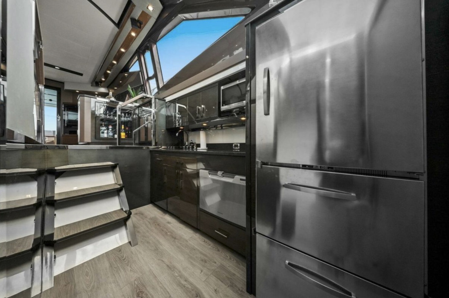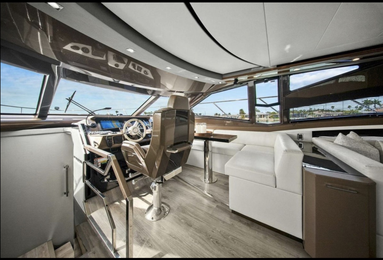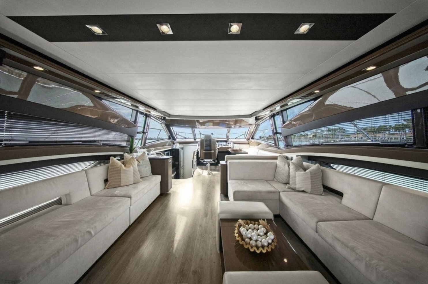 The main salon is bright and open, featuring panoramic windows, high-gloss cabinetry, premium stone surfaces, and generous seating ideal for entertaining or extended cruising. The galley is thoughtfully integrated into the main deck layout, providing functionality without compromising flow.