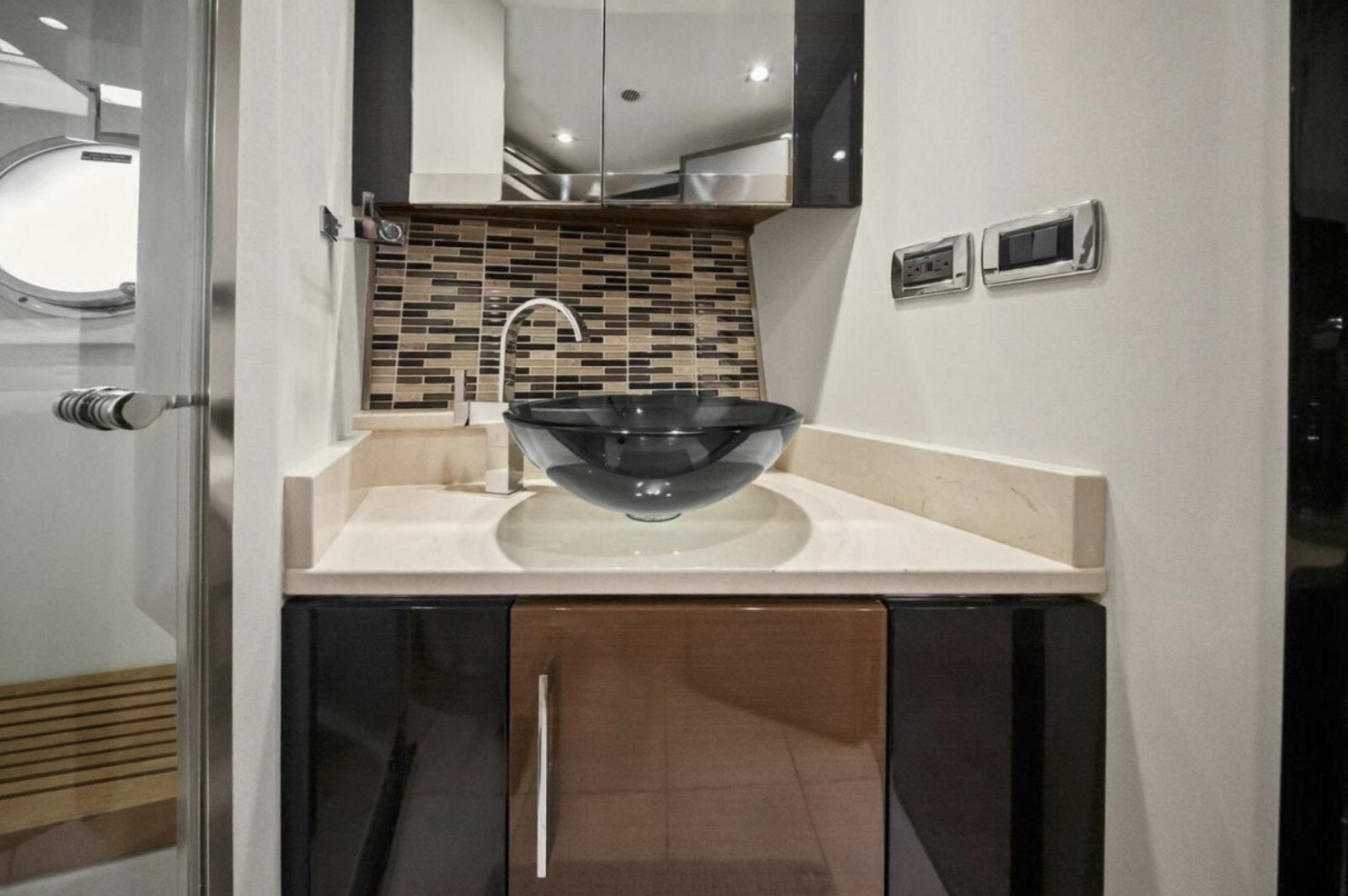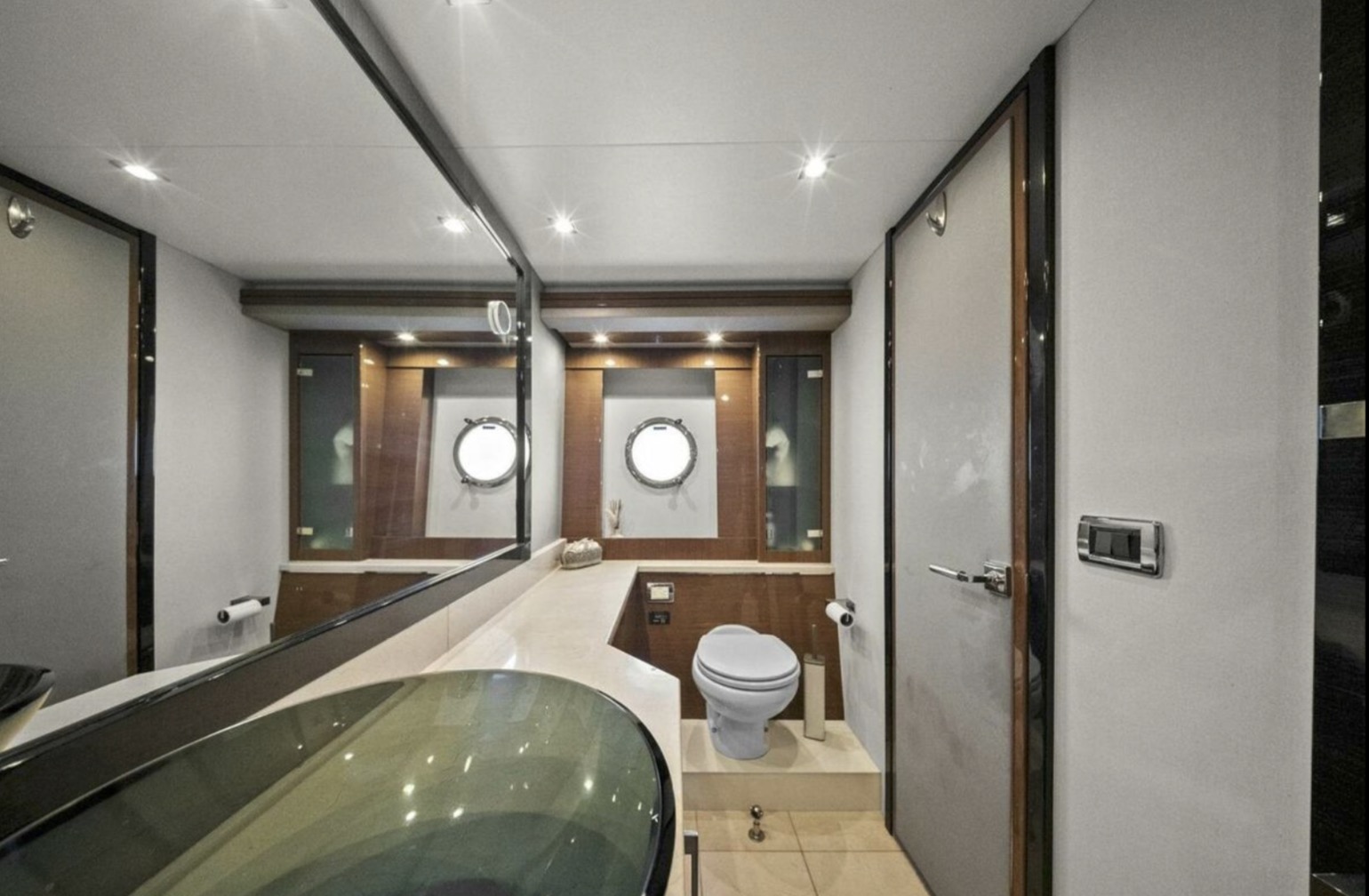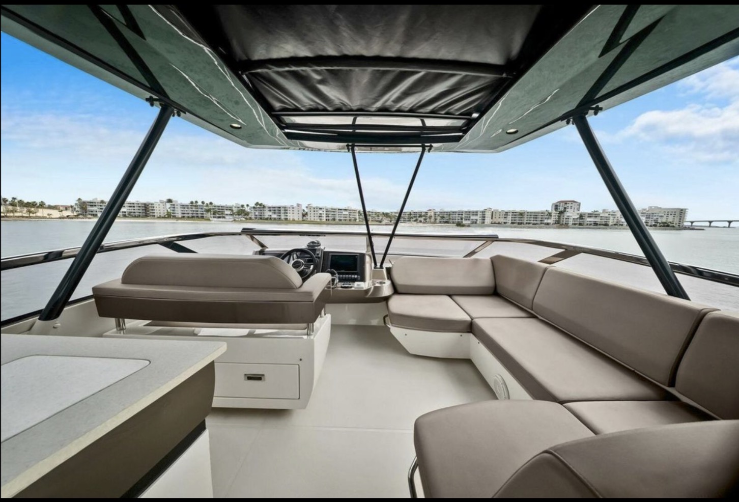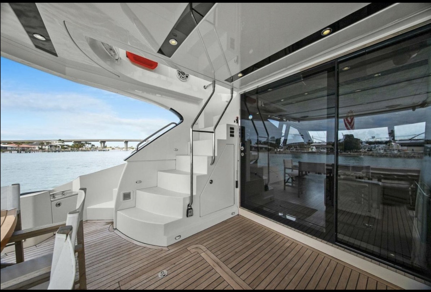 The main salon is bright and open, featuring panoramic windows, high-gloss cabinetry, premium stone surfaces, and generous seating ideal for entertaining or extended cruising. The galley is thoughtfully integrated into the main deck layout, providing functionality without compromising flow.