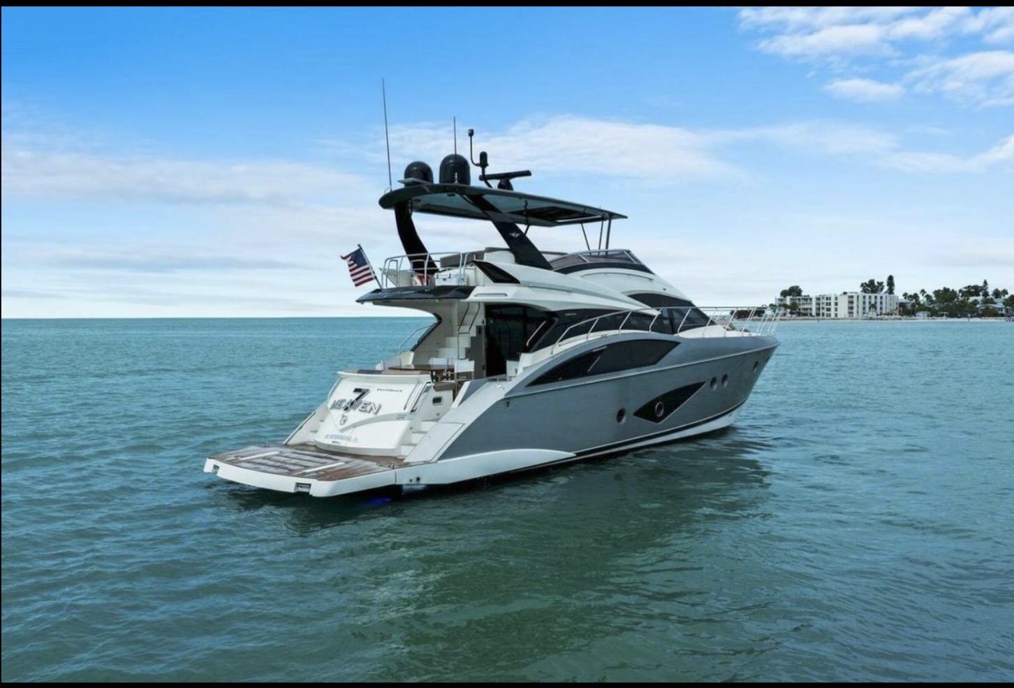 The flybridge is designed for both relaxation and command, offering expansive seating, a wet bar, and an upper helm station with excellent visibility. The cockpit and swim platform provide easy water access, making the vessel equally suited for cruising or entertaining at anchor.
